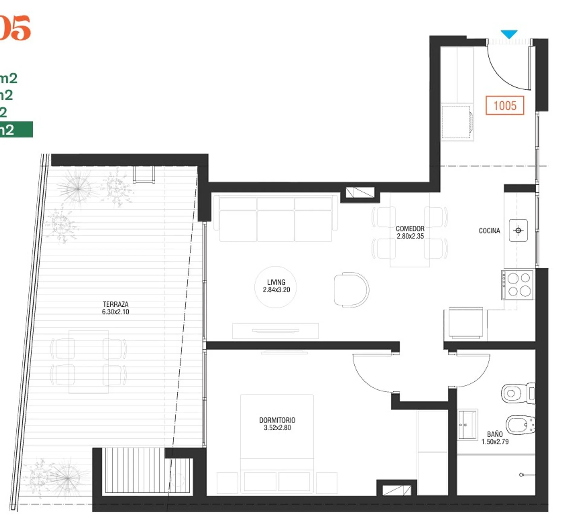 Área; 49m²; hall de acceso con placard despojador con conexión de calefón y lavarropas. Living comedor, cocina integrada con muebles sobre y bajo mesada, salida a gran terraza con parrillero de 19m², baño completo. dormitorio con placard tambien con salida a terraza,