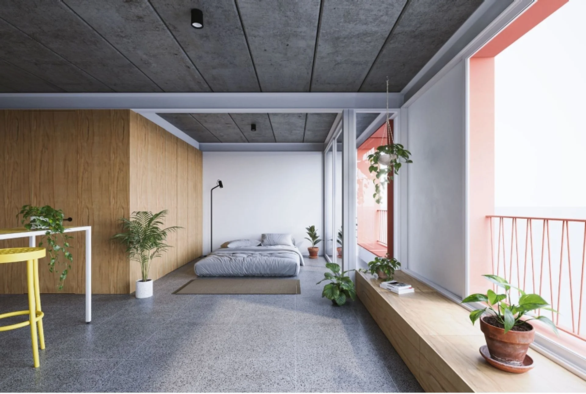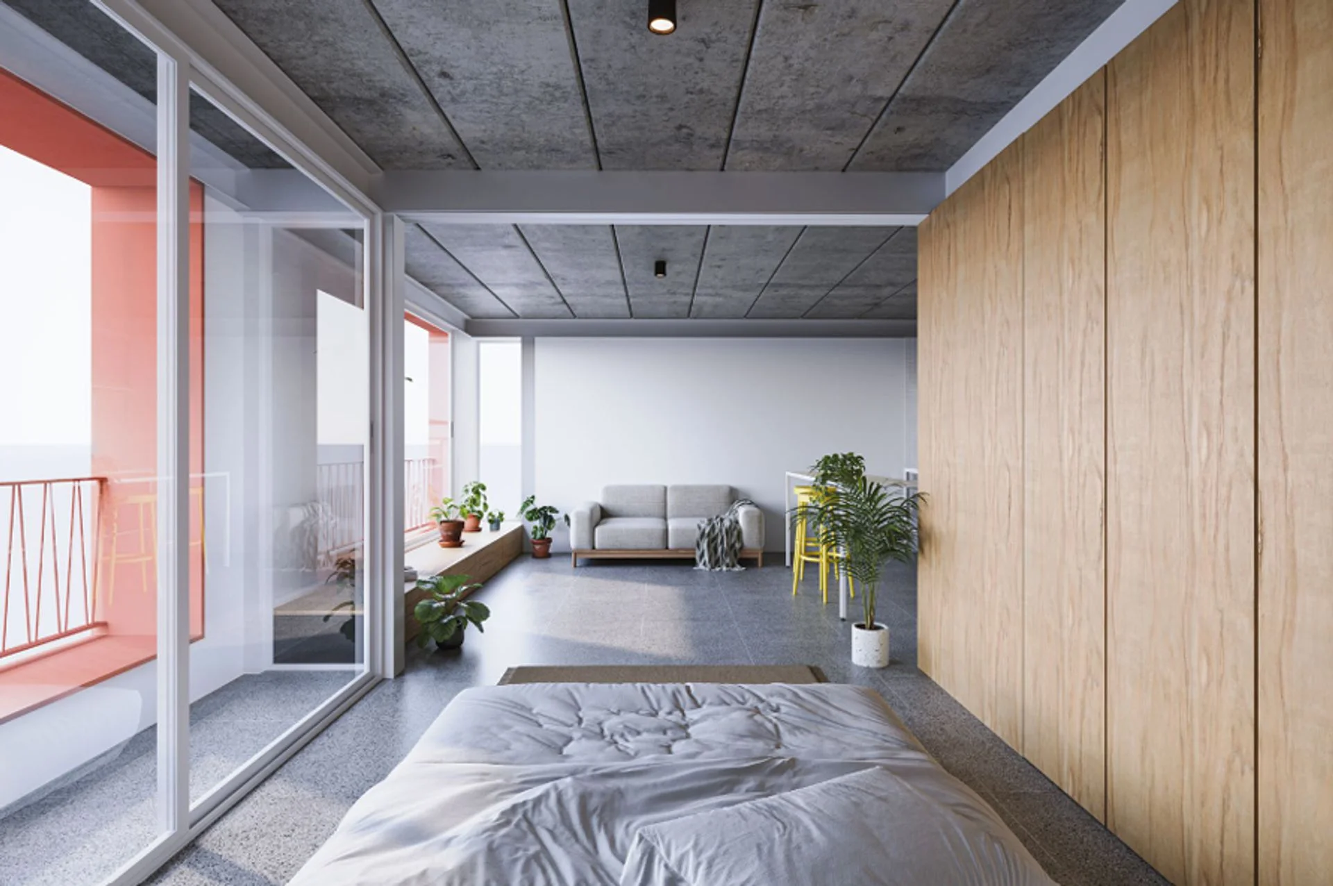 El dormitorio tiene salida directa a balcón, aportando luz natural y ventilación.