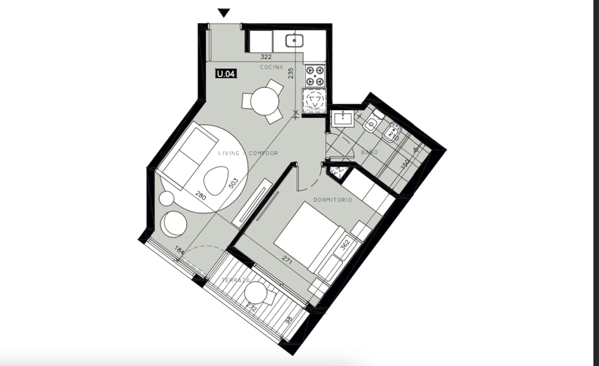 El dormitorio cuenta con placares, pre-instalación para aire acondicionado y salida a terraza, brindando luz natural. El baño, con diseño sofisticado, incluye muebles con espejo y revestimientos de porcelanato.