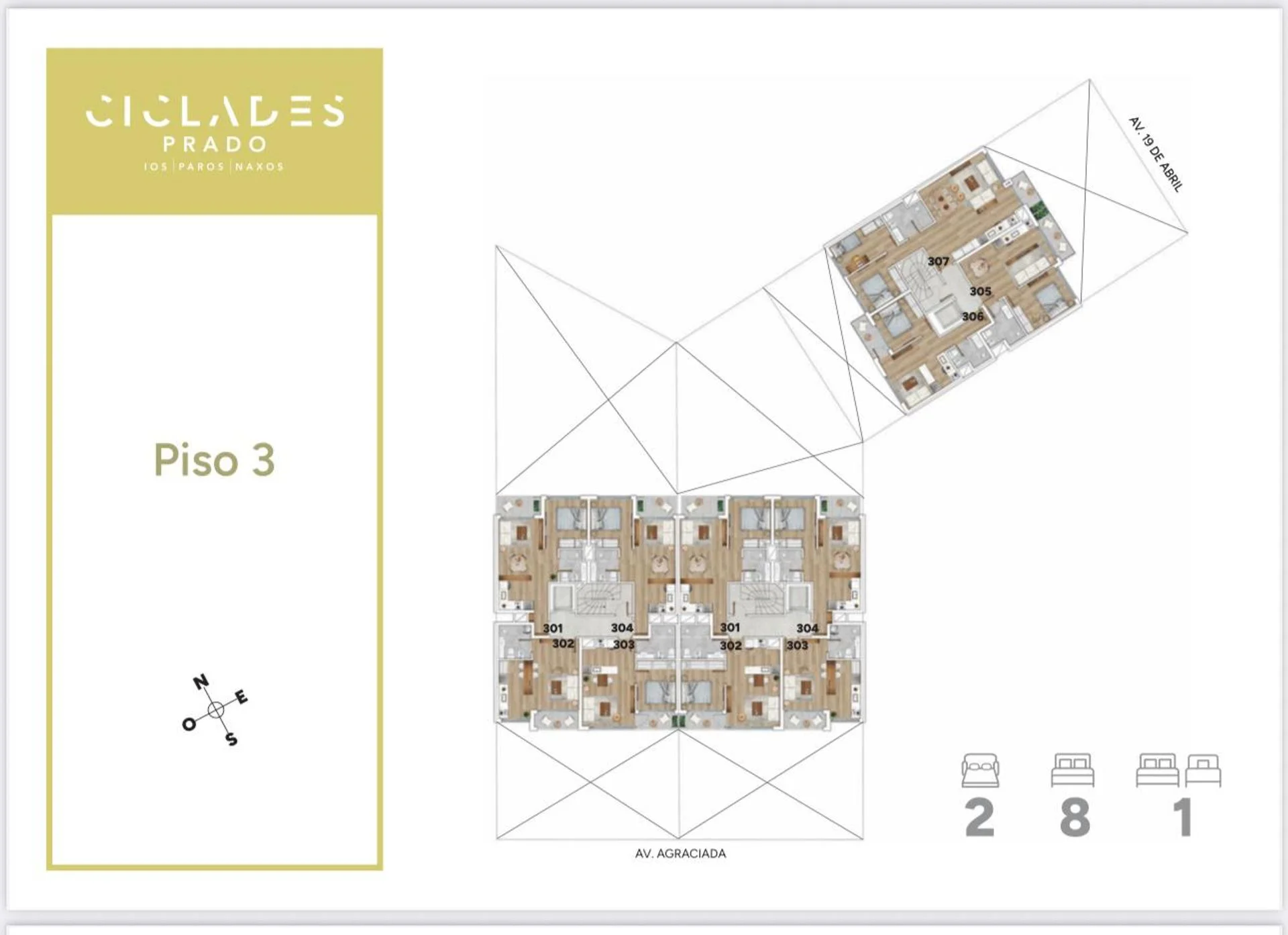 Ciclades Prado es un condominio de tres edificios de planta baja y tres pisos, ÍOS, PAROS y NAXOS, implantado en un predio que atraviesa la manzana y le abre frente a dos avenidas icónicas del barrio: