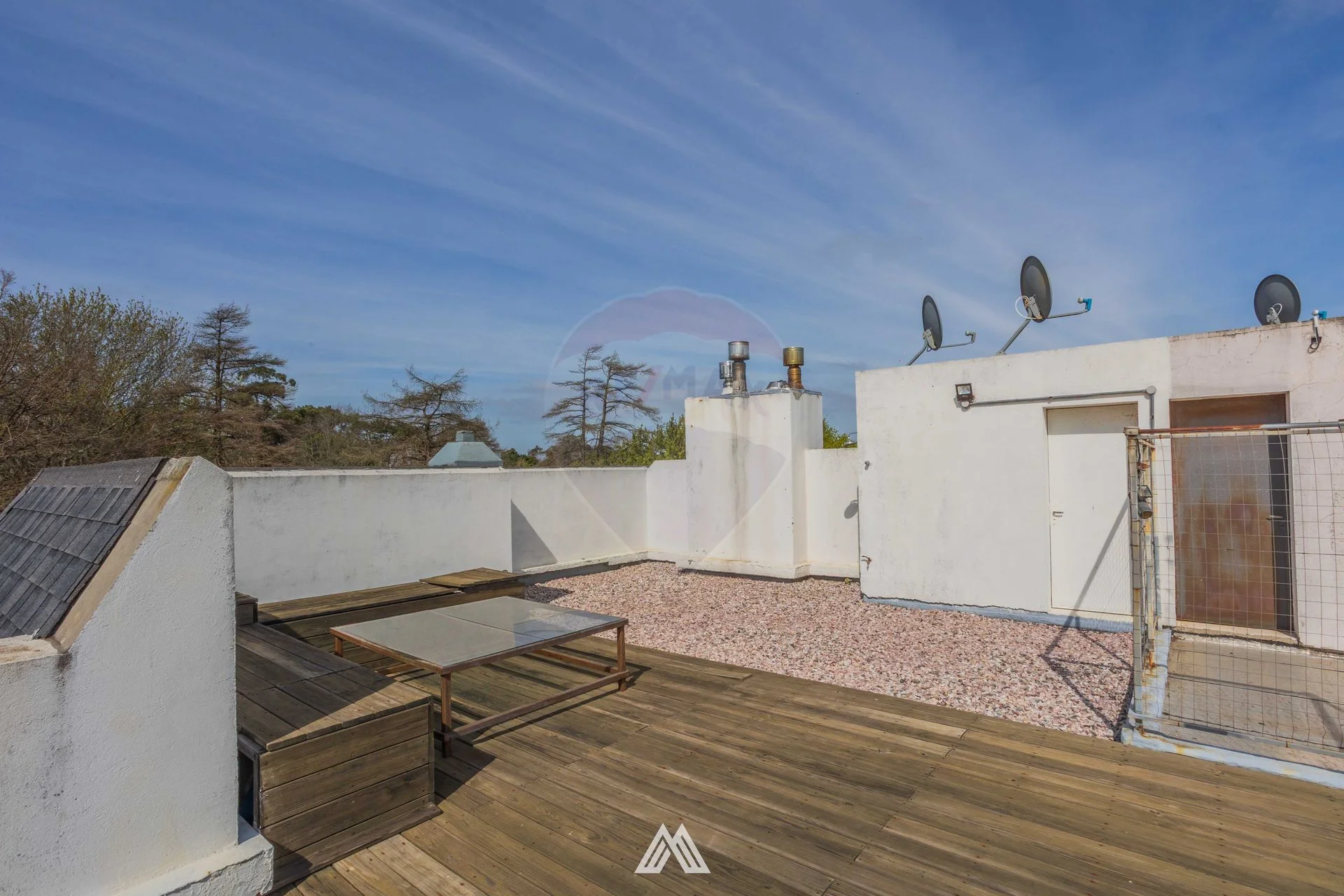 Azotea acondicionada con deck y bancos de madera.