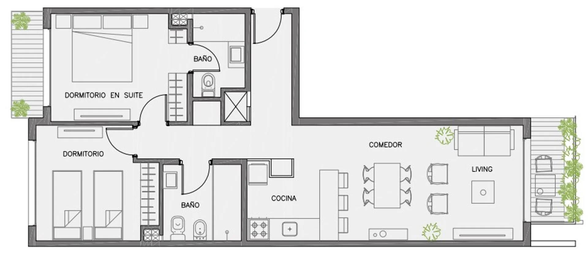 Unidad de 72 m² totales (66 m² interiores + 6 m² de terraza), con distribución funcional: