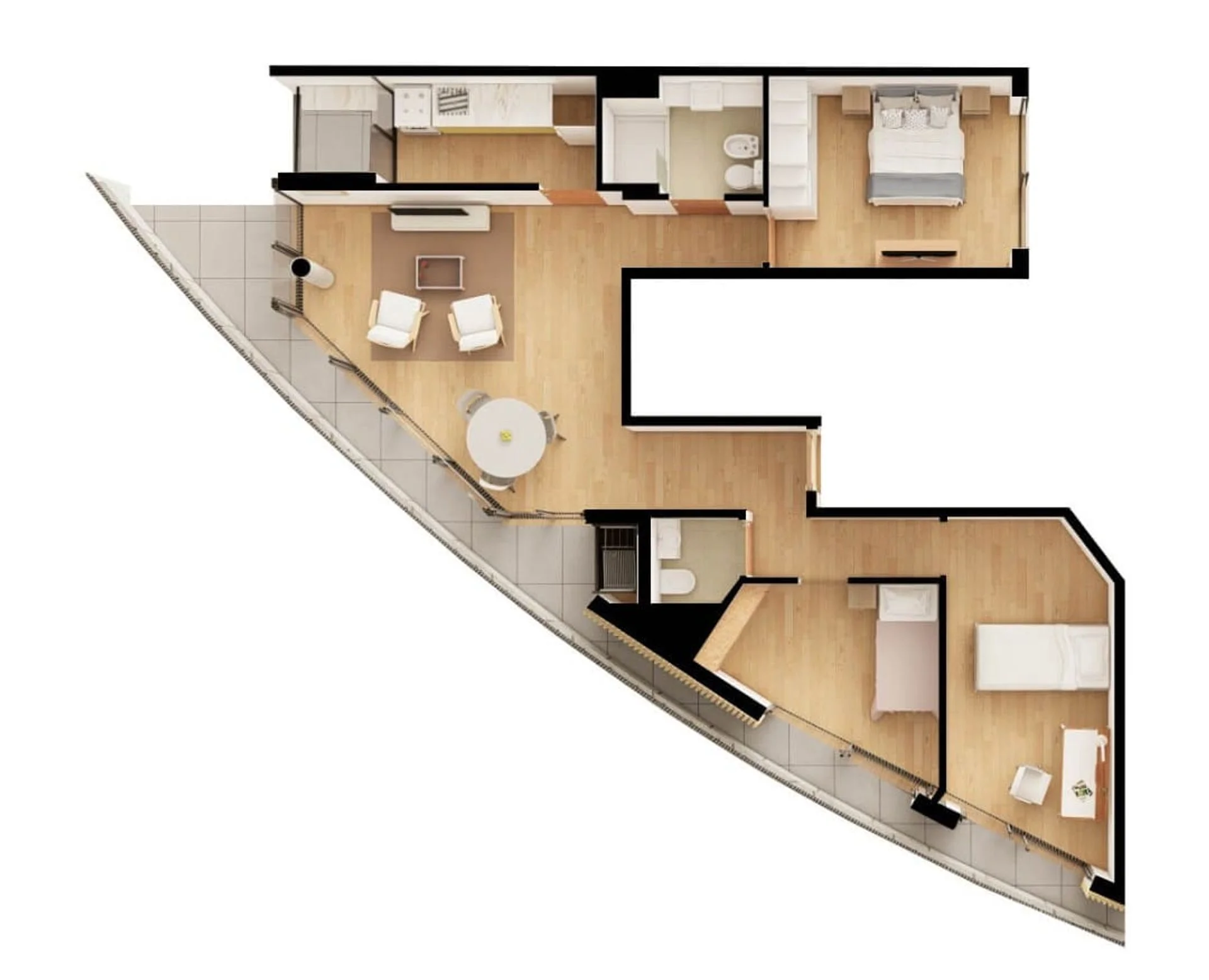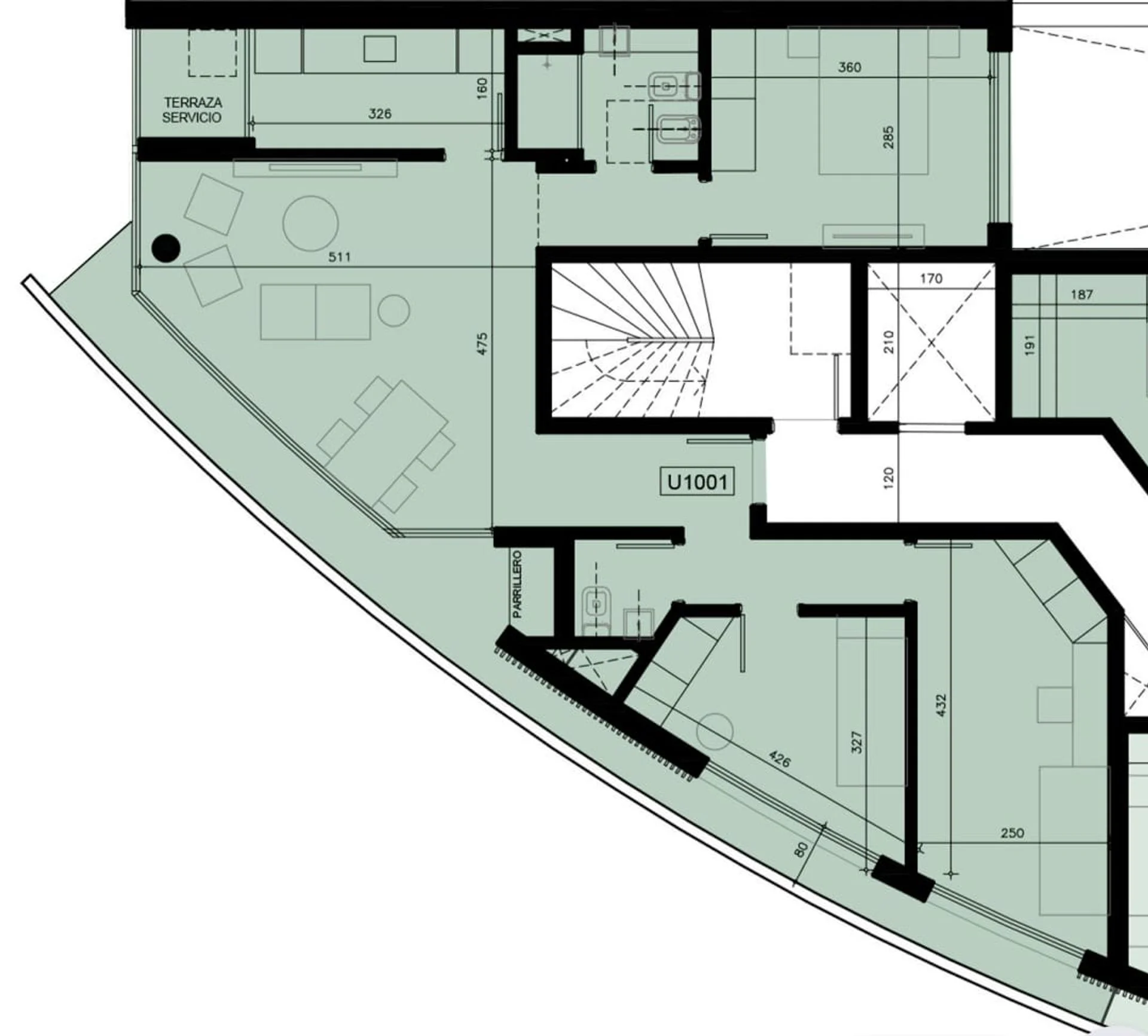 Piso 10 todo al frente , unidad 1001 de 85 metros cuadrados y 55 mt2 de balcón donde se encuentra el parrillero y ademas azotea de uso exclusivo. Living comedor amplio con cocina integrada con muebles aéreo y bajo mesada de diseño contemporáneo. Equipado con Horno, campana y anafe. Tres dormitorios con placares, bo completo y baño social. Aberturas de aluminio color gris micortexturado con Doble Vidriado Hermético (DVH) con cortinas motorizadas.