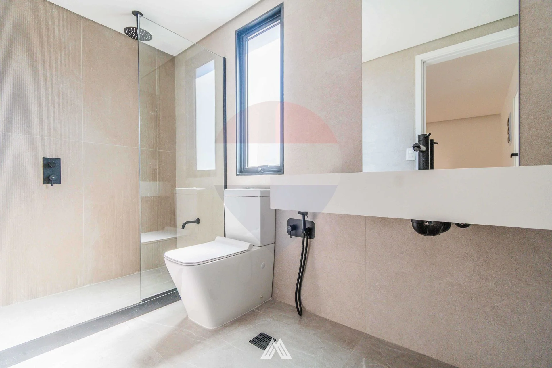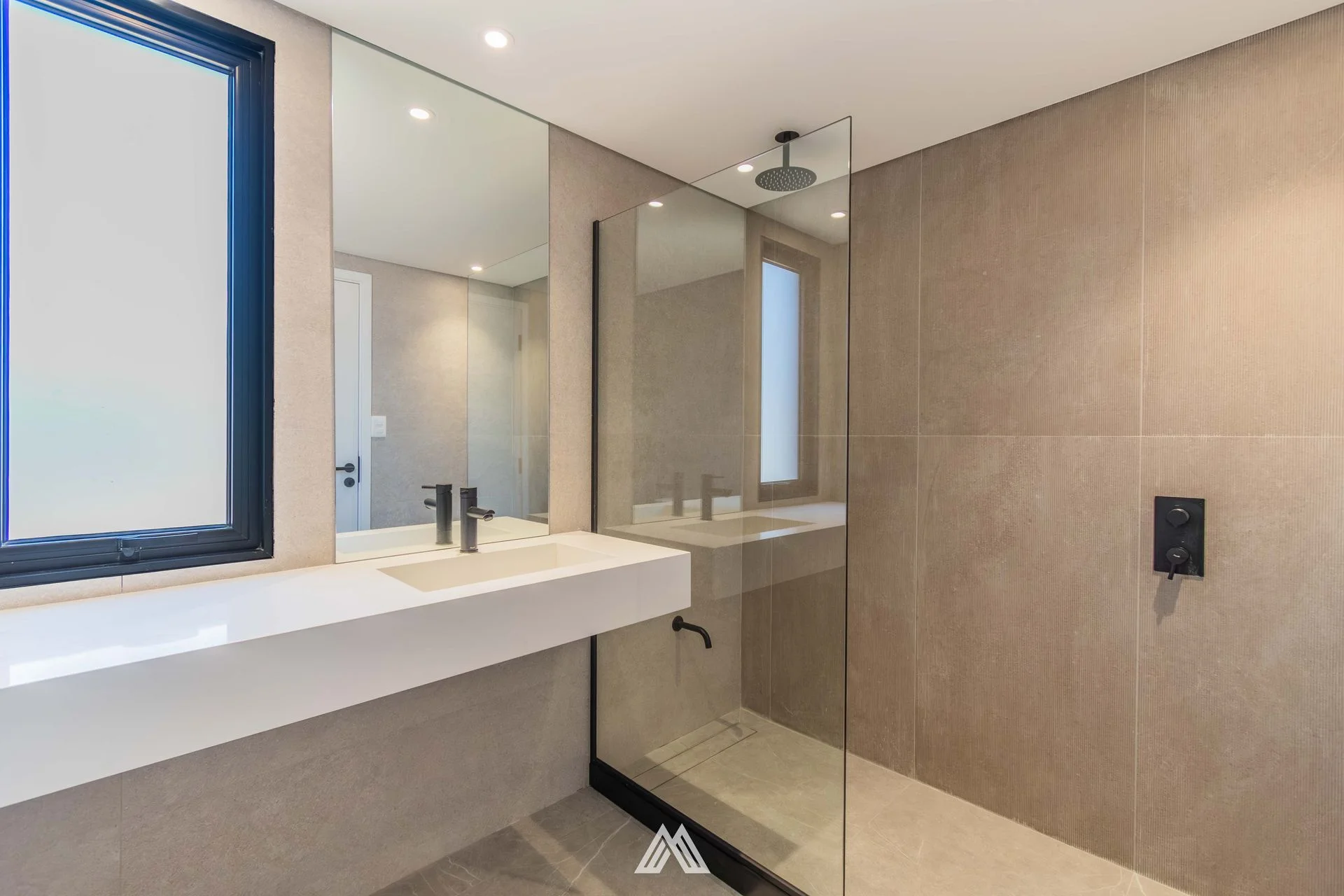 Los baños cuentan con artefactos en loza blanca, griferías negras, mamparas de vidrio templado y mesadas en cuarzo, logrando un estilo moderno y elegante.