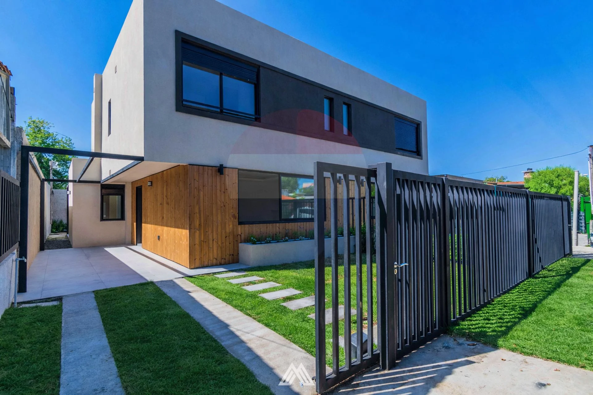 Cerramiento frontal en hierro, portón motorizado y cochera completan un conjunto funcional y estéticamente coherente.
