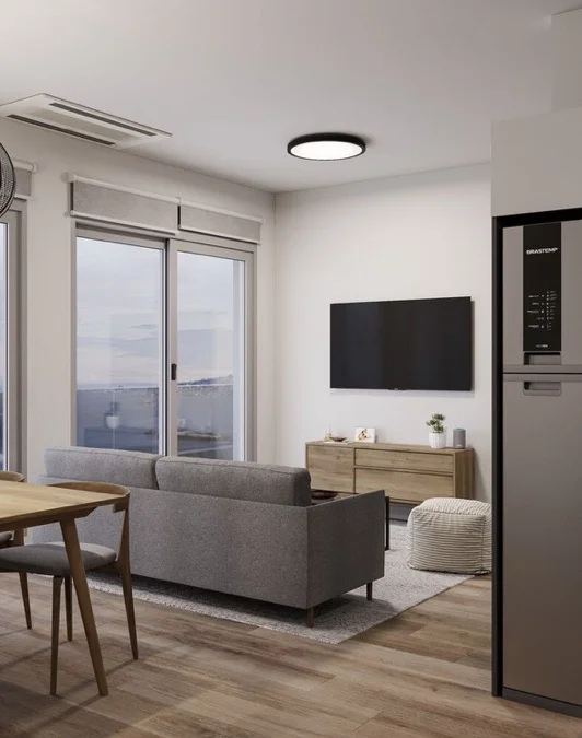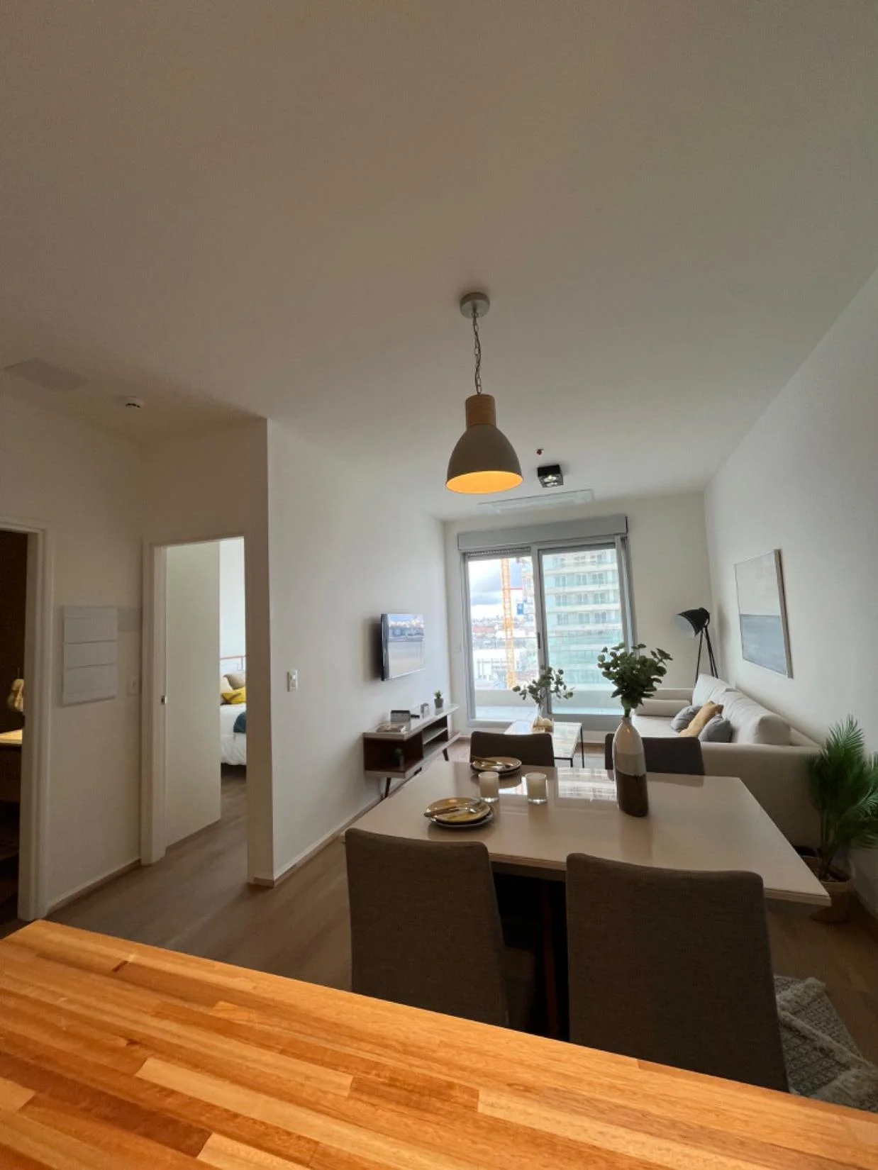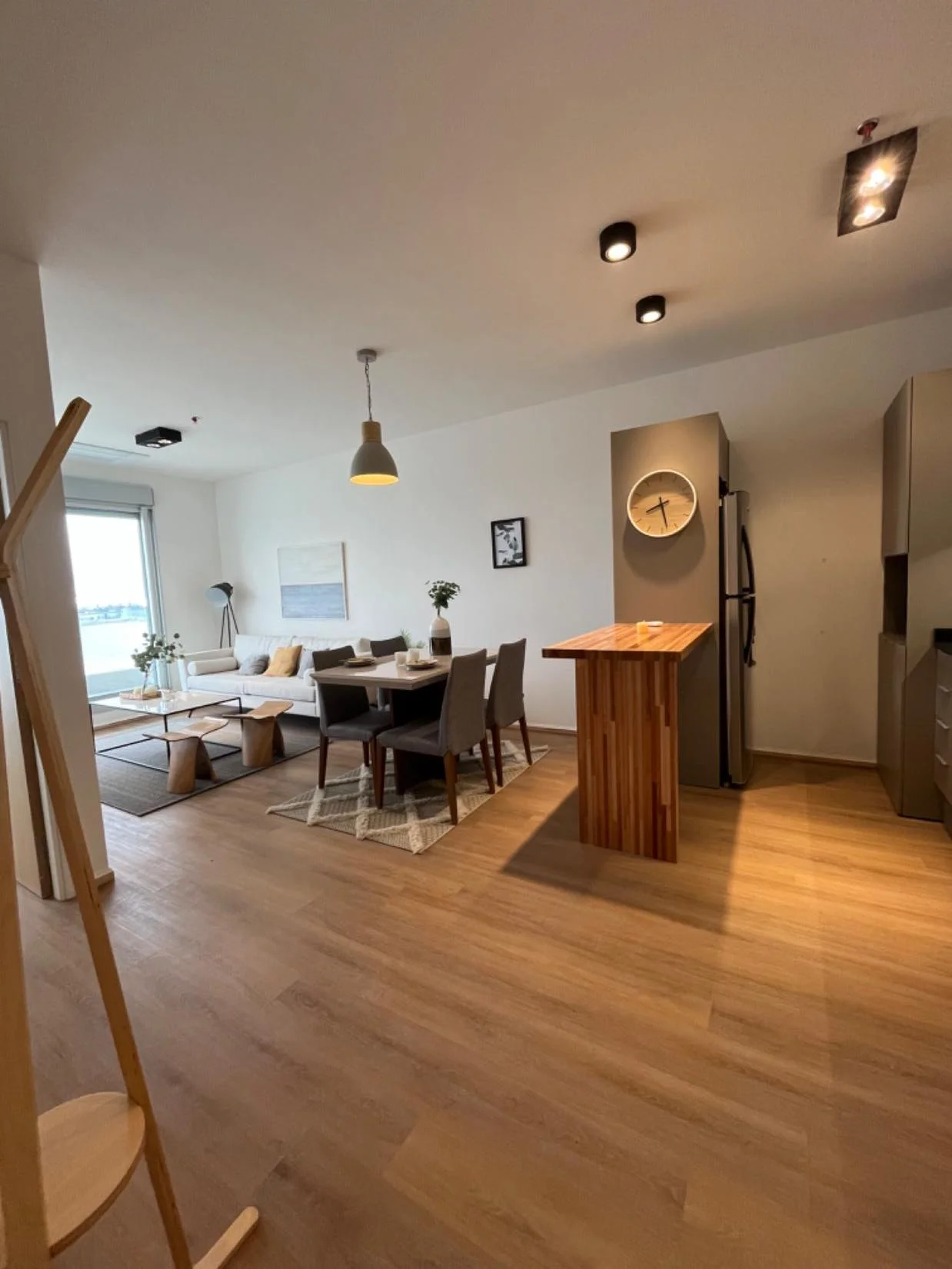Living comedor con aire inverter instalado cerramientos MDF termo acústicos cortinas de enrollar de aluminio automatizadas. Salida al balcón desde el living y dormitorio.