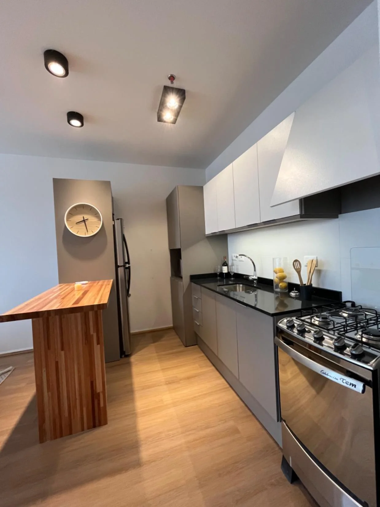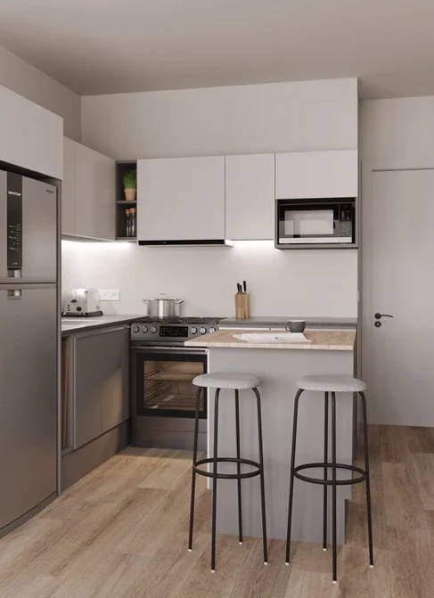 Cocina con placares sobre y debajo de la mesada con instalación de lavarropa y Calefón. Mesada en silestone. Baño completo.