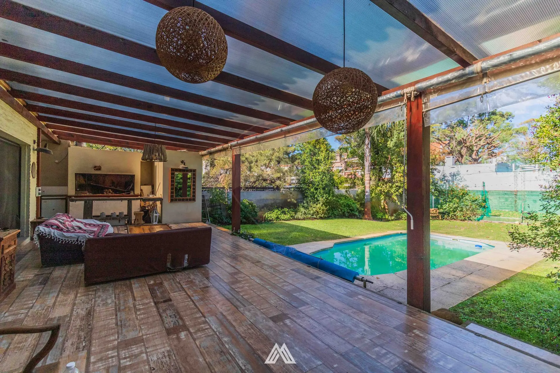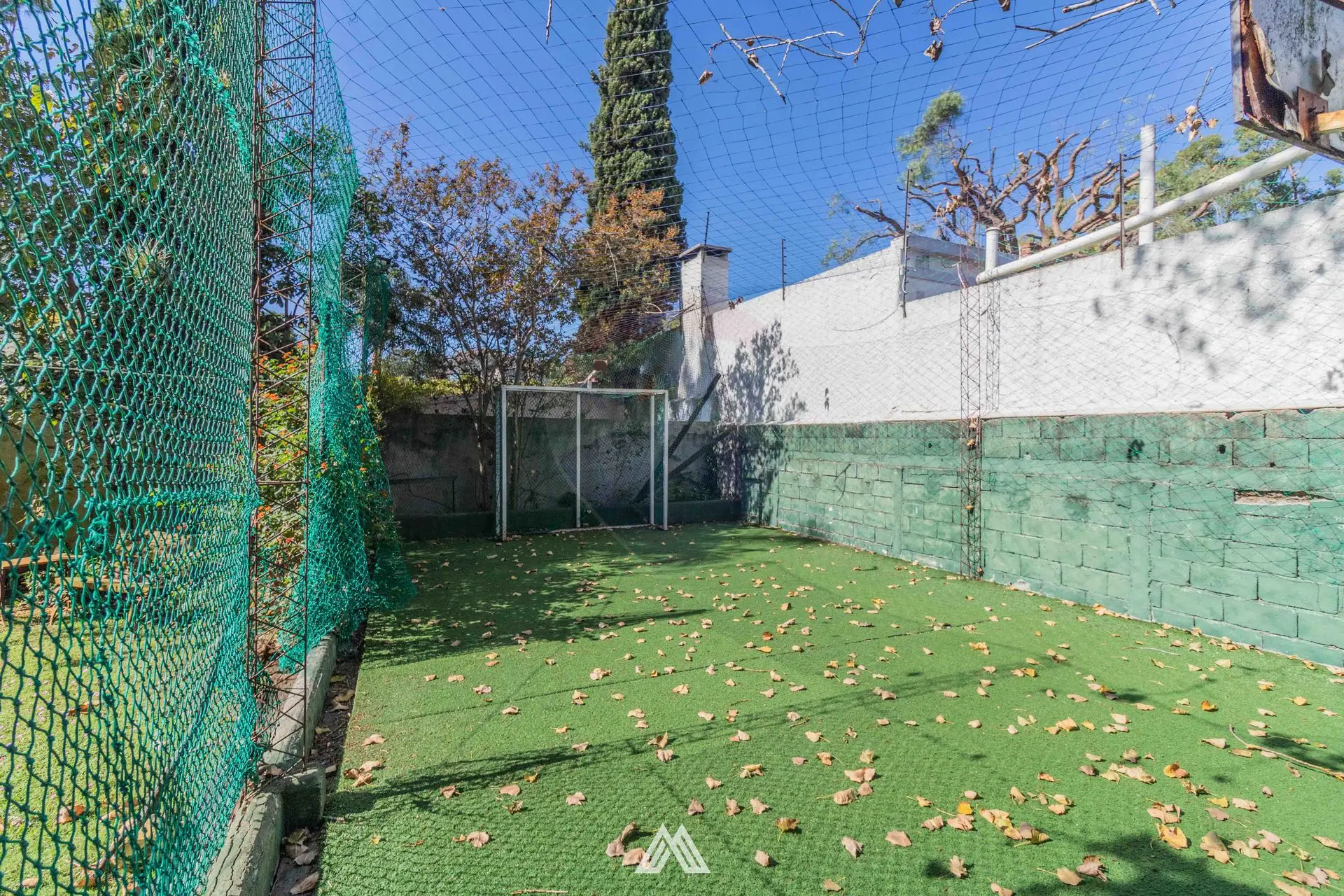Gran Pergola de 43 m² con parrillero y jardín verde con piscina de agua salada y cancha de futbol.
