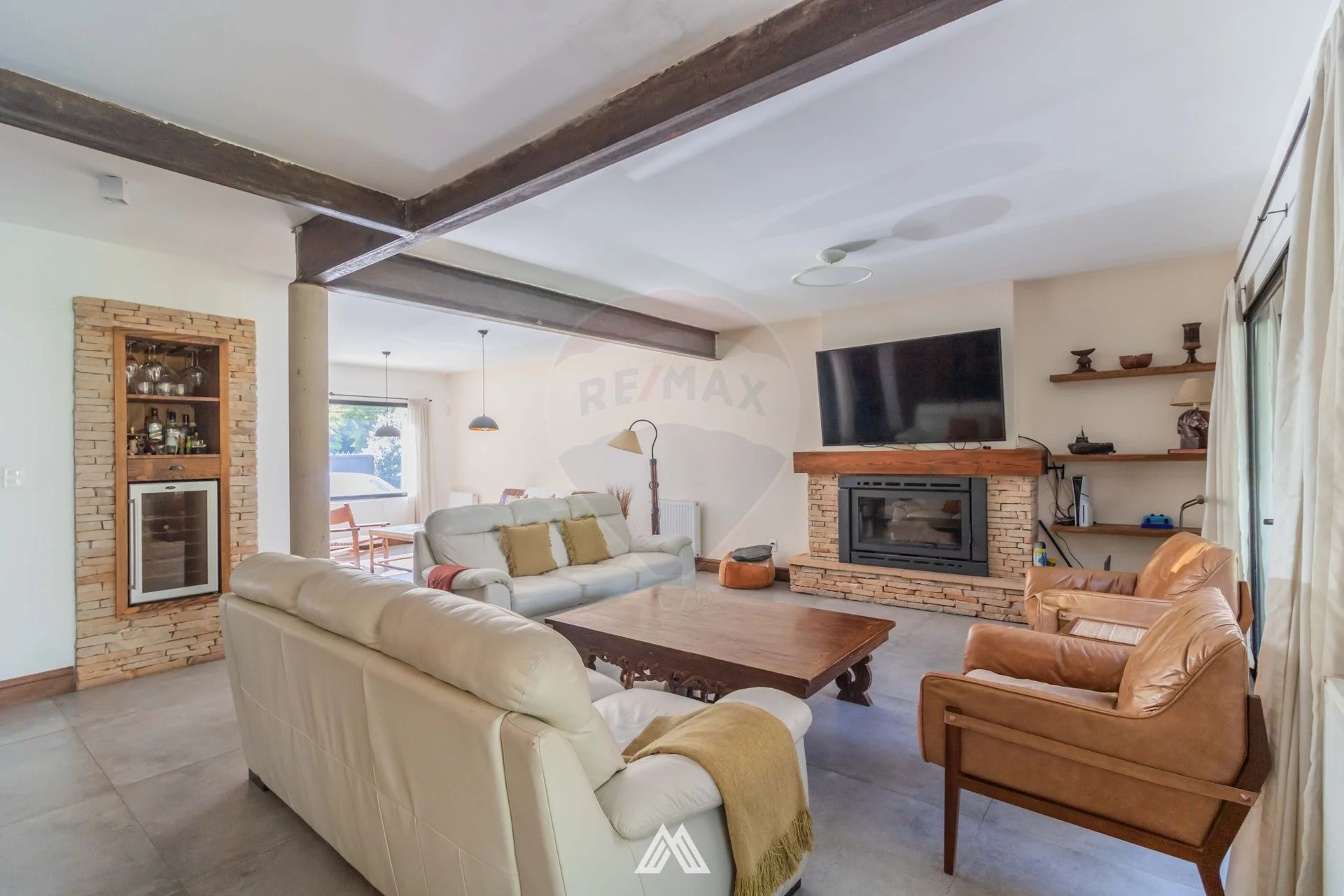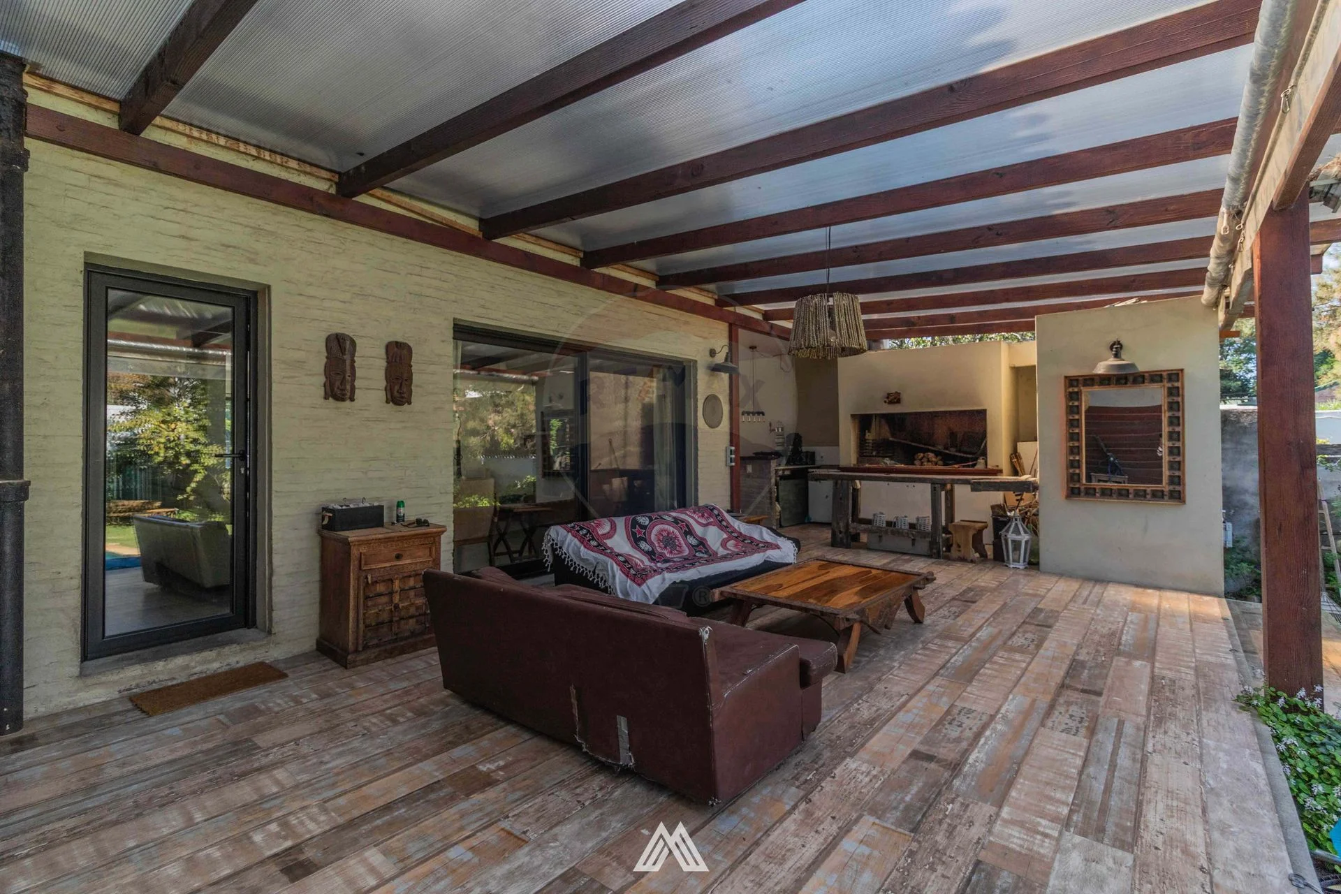 Estar diario con estufa a leña de alto rendimiento y salida a pergola y jardín.