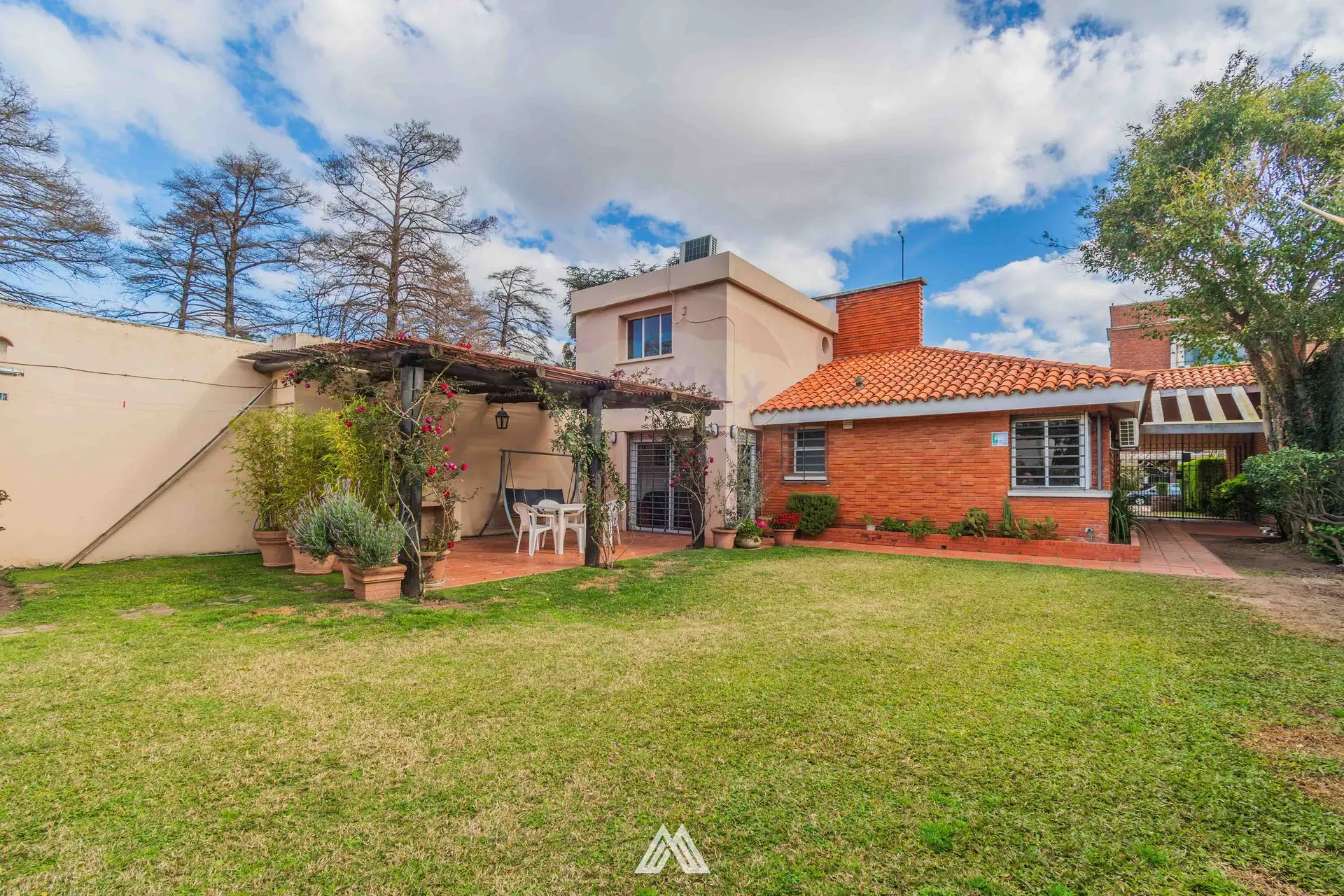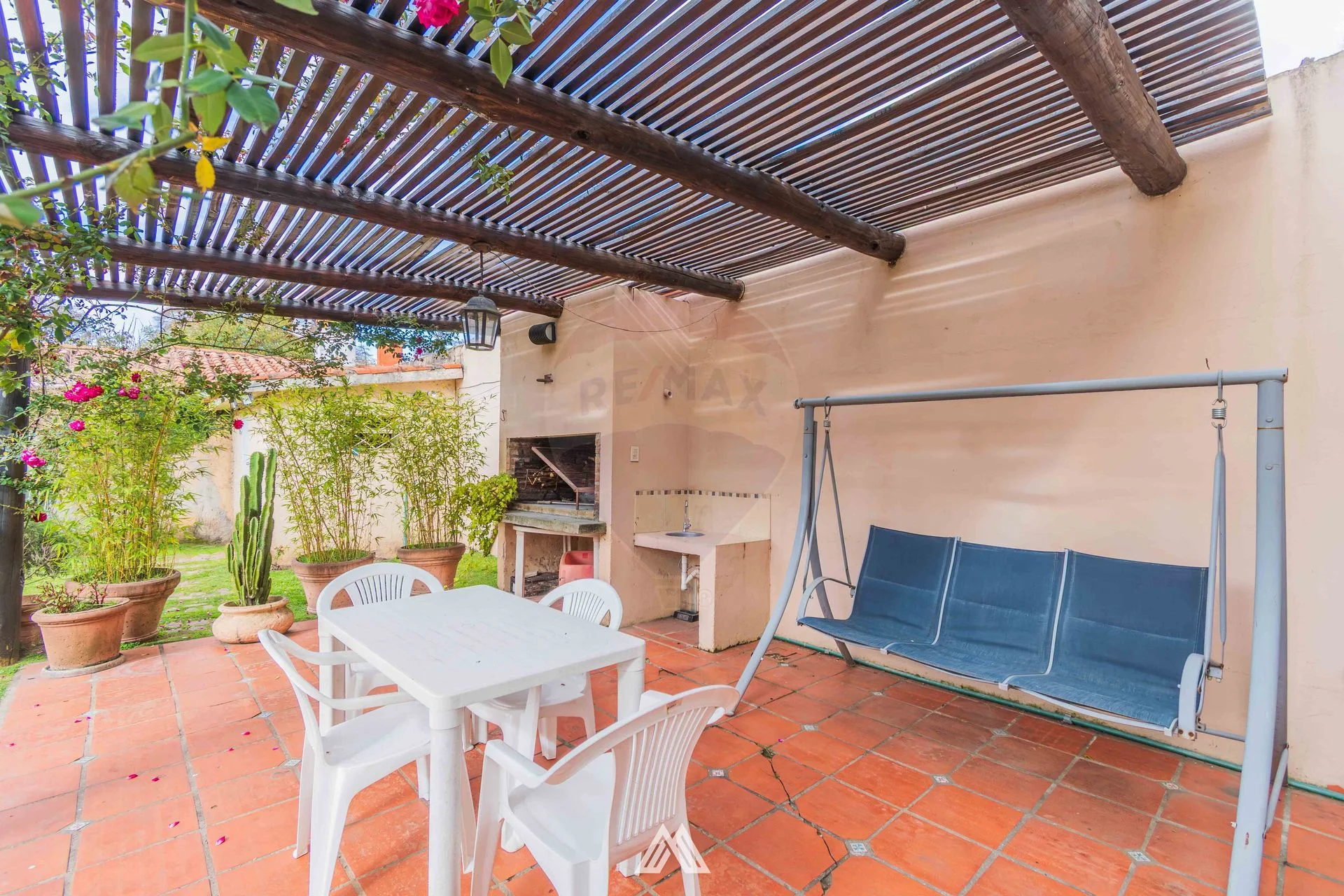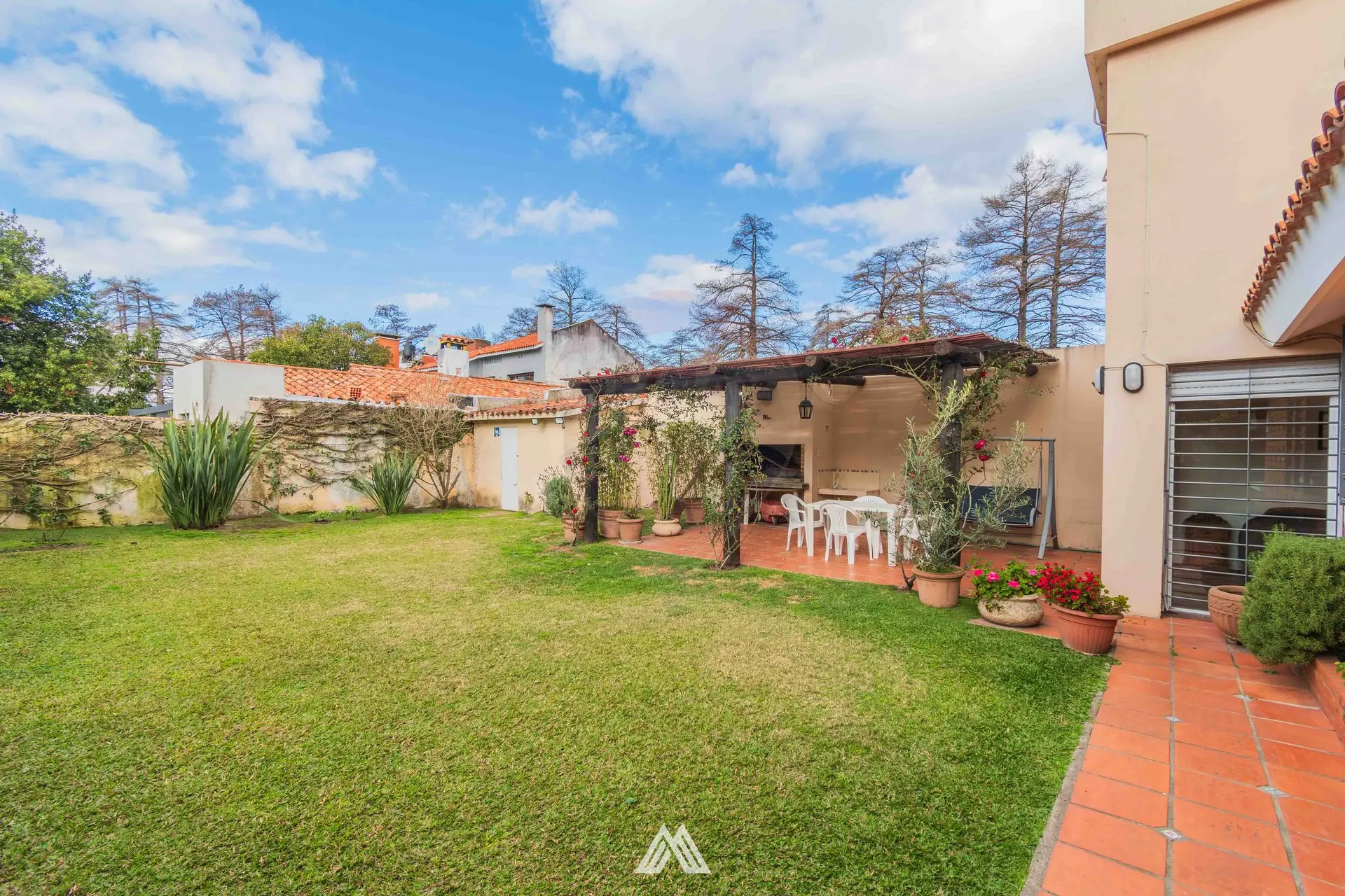 Gran jardín con pérgola y parrillero.