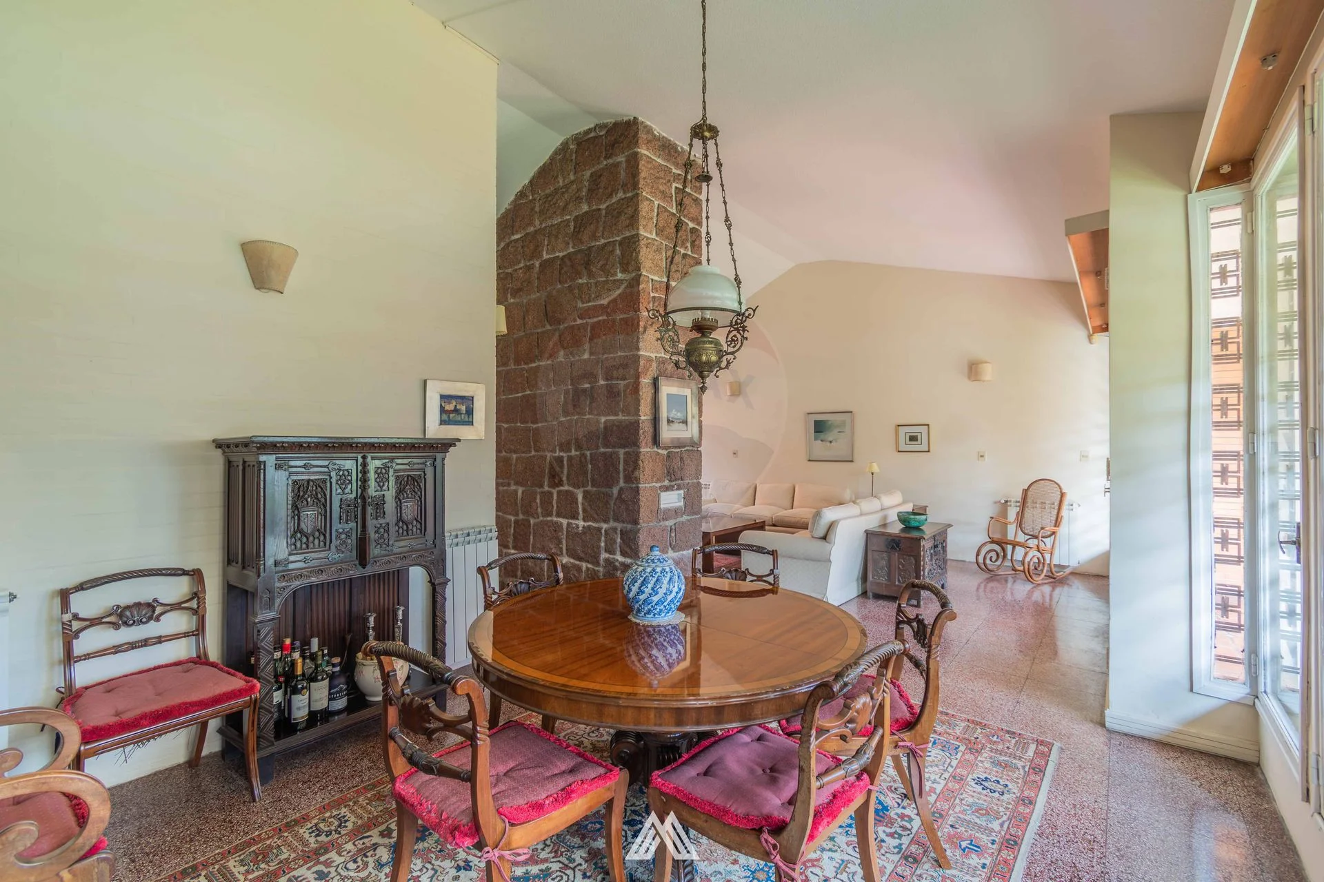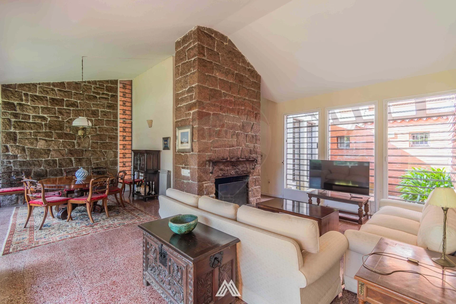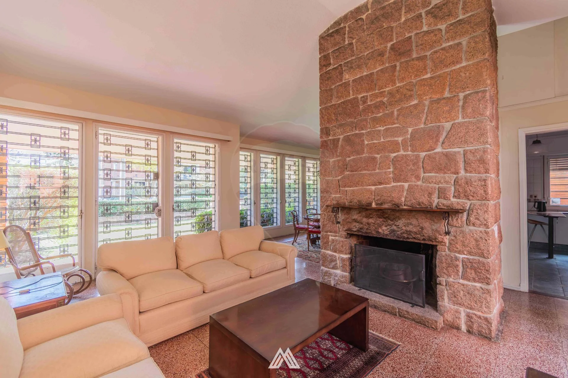 El living-comedor, con estufa a leña y doble circulación, ofrece amplios ventanales que dan hacia el jardín delantero y el jardín de invierno posterior.
