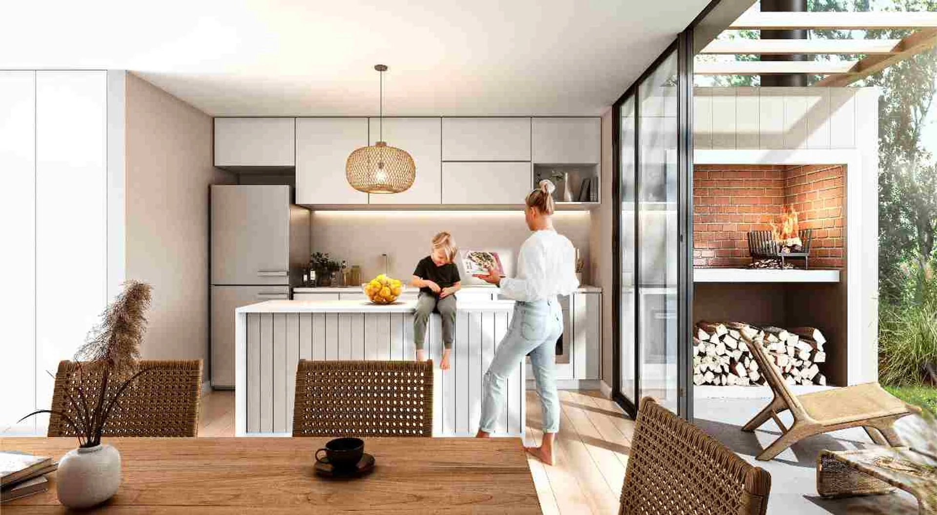 Planta baja cuenta con living comedor con estufa de leña, cocina integrada con comedor diario. Pérgola con parrillero y jardín verde.