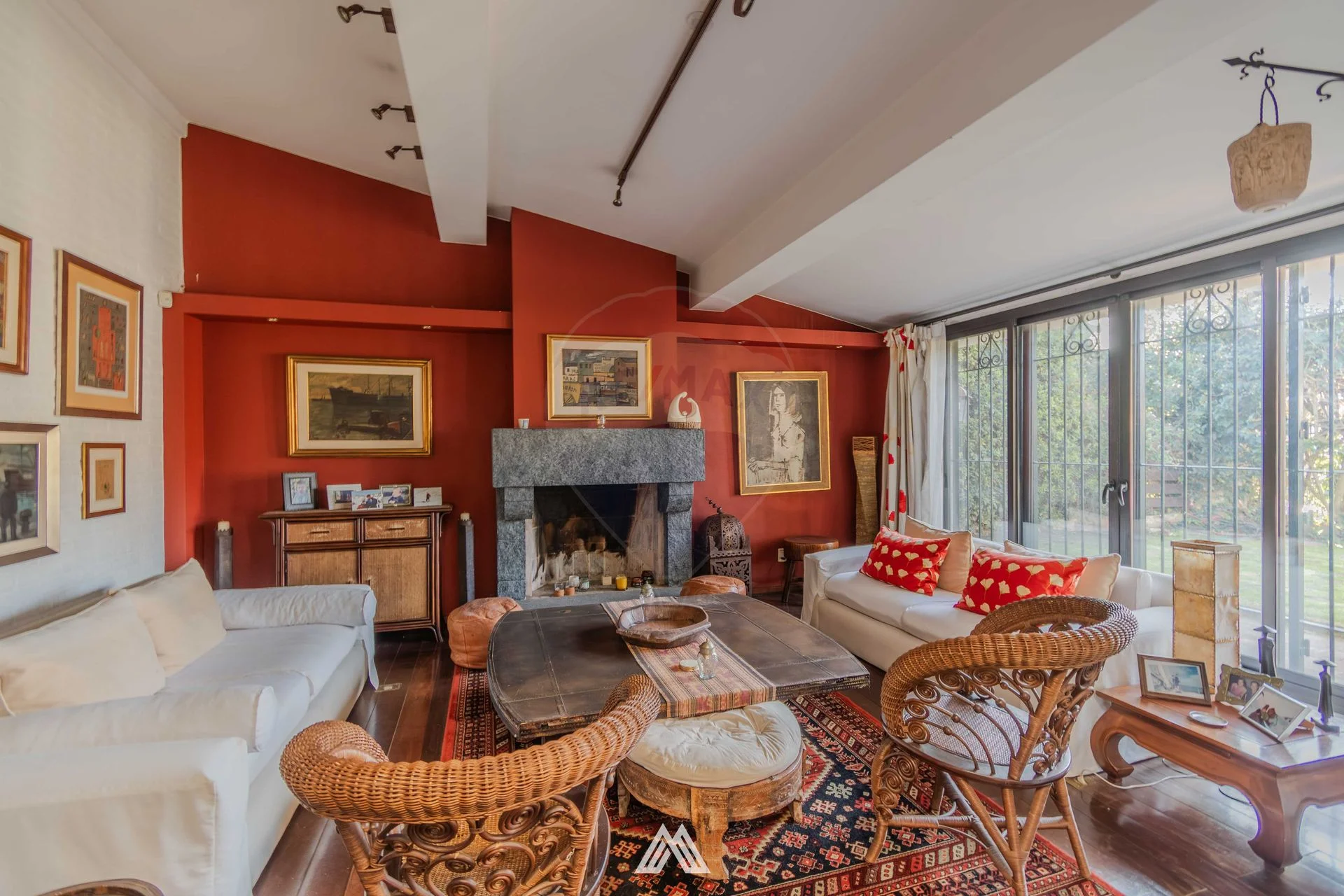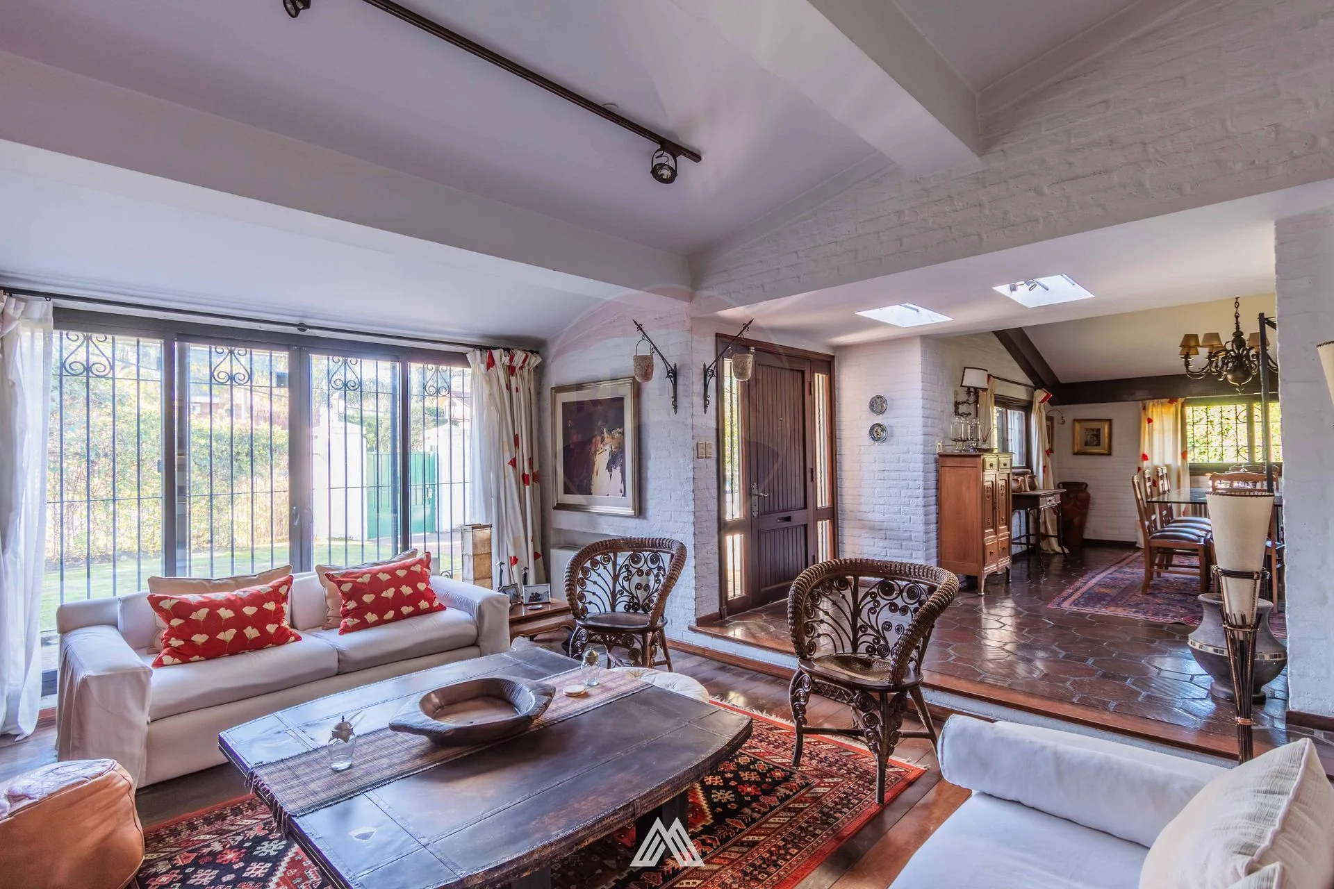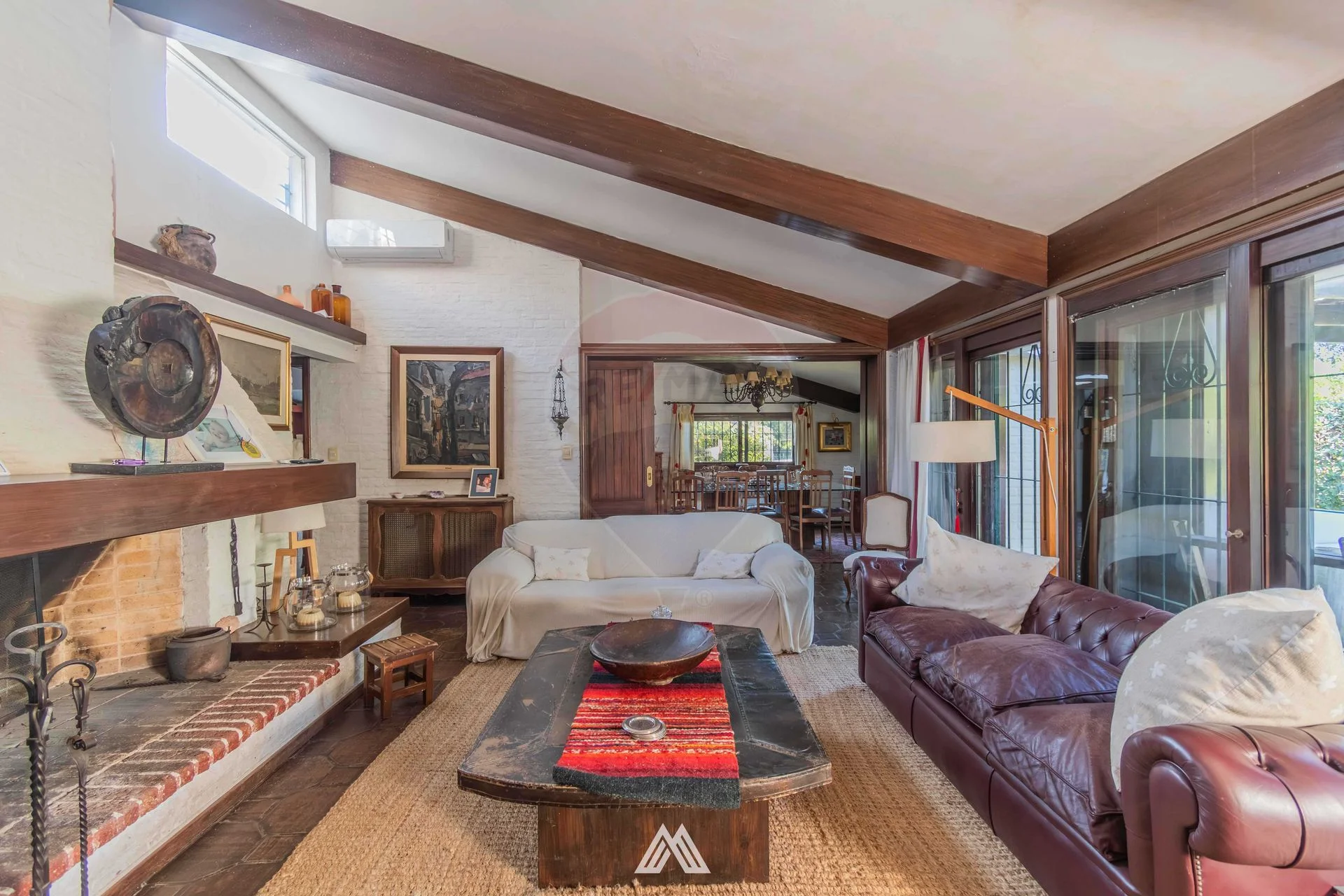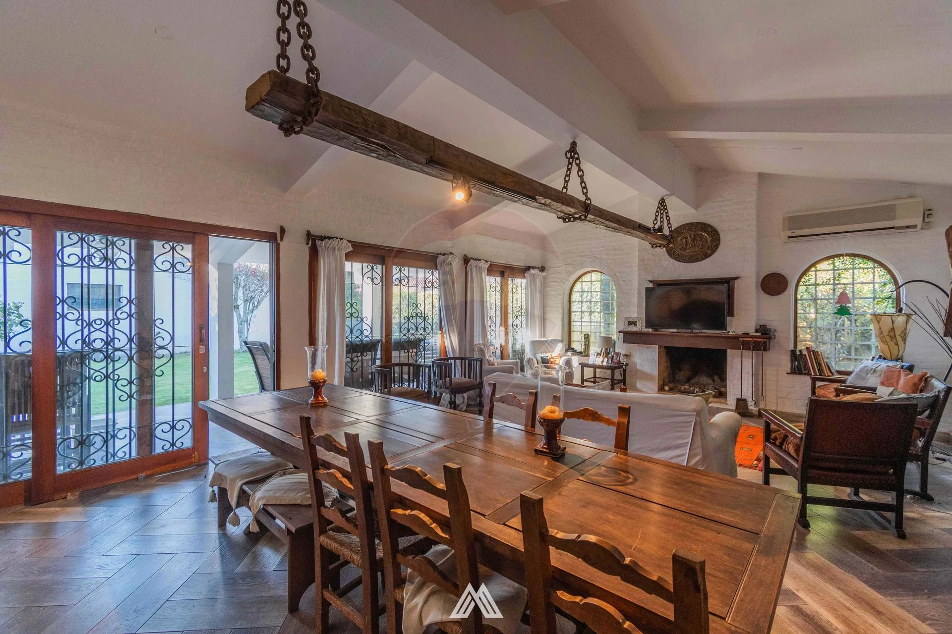 Estar con estufa de leña y aire acondicionado y salida a una pérgola y al jardín.