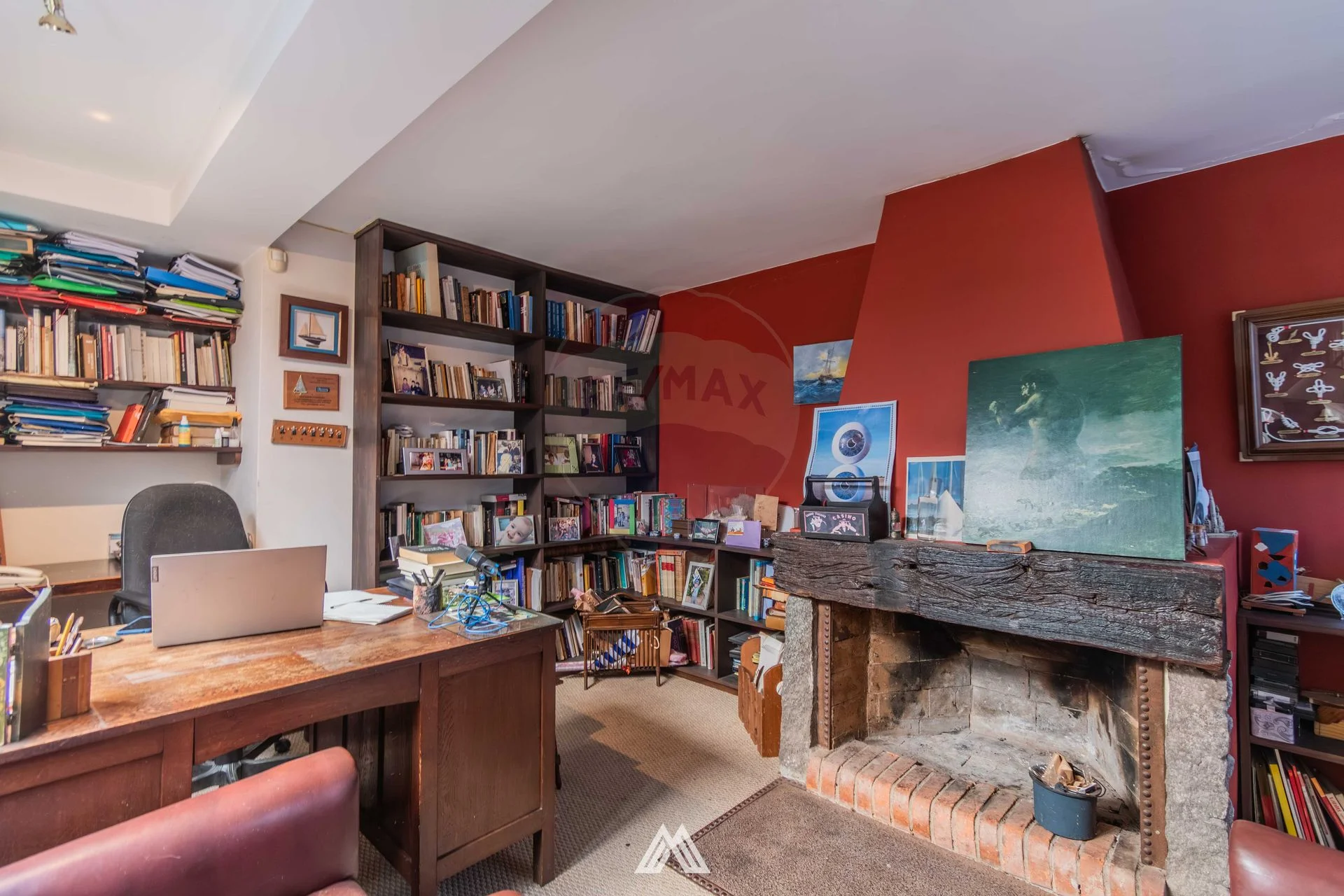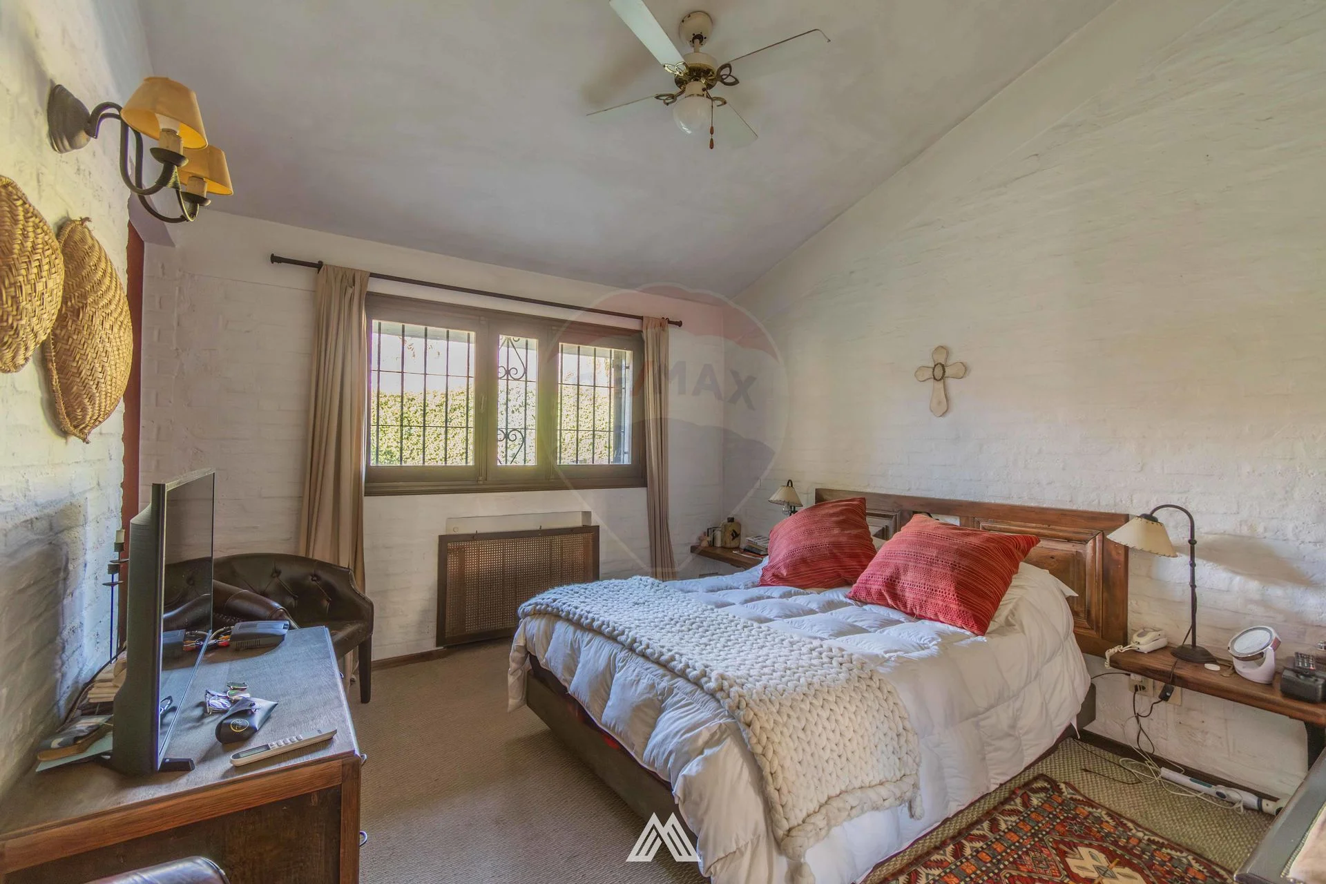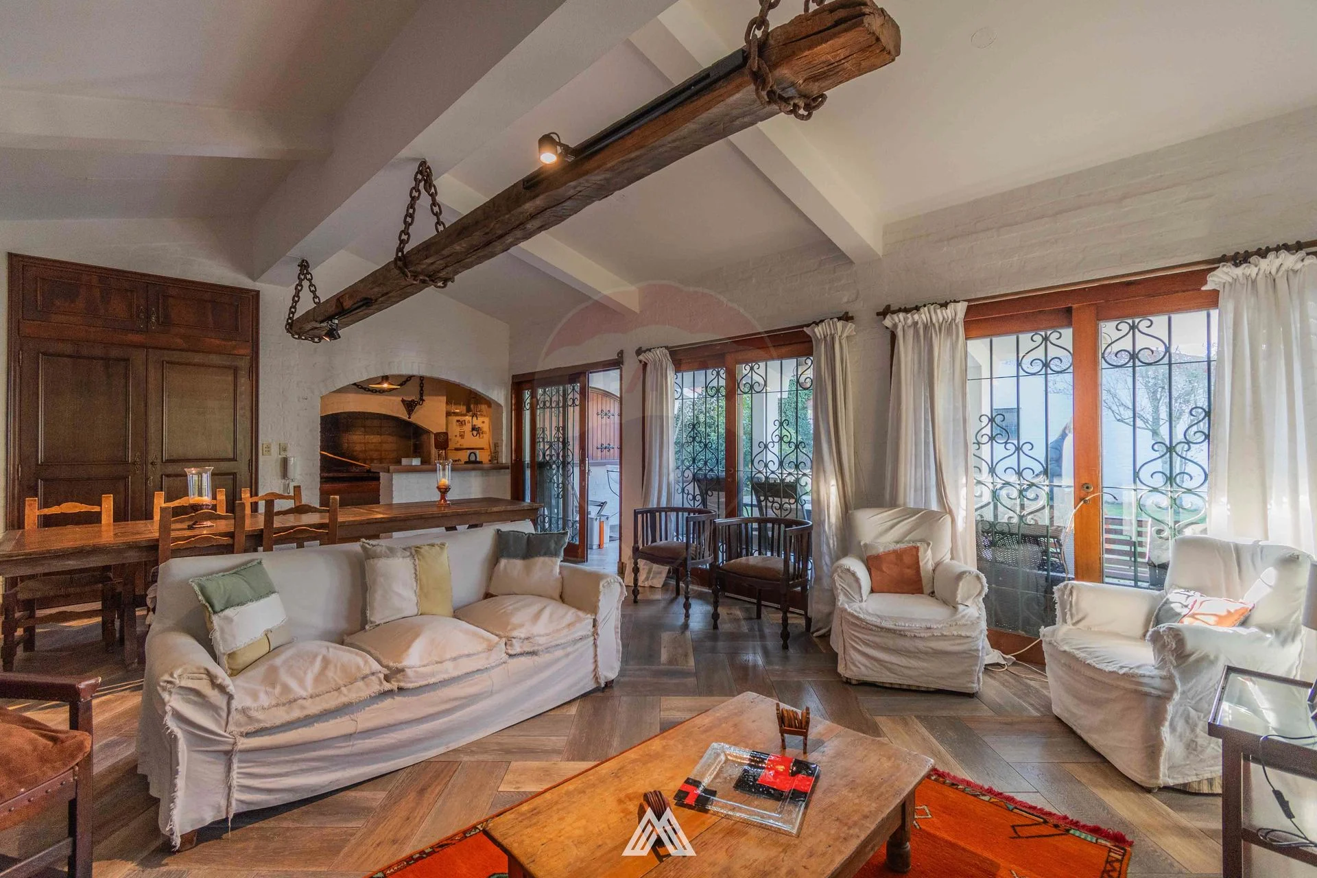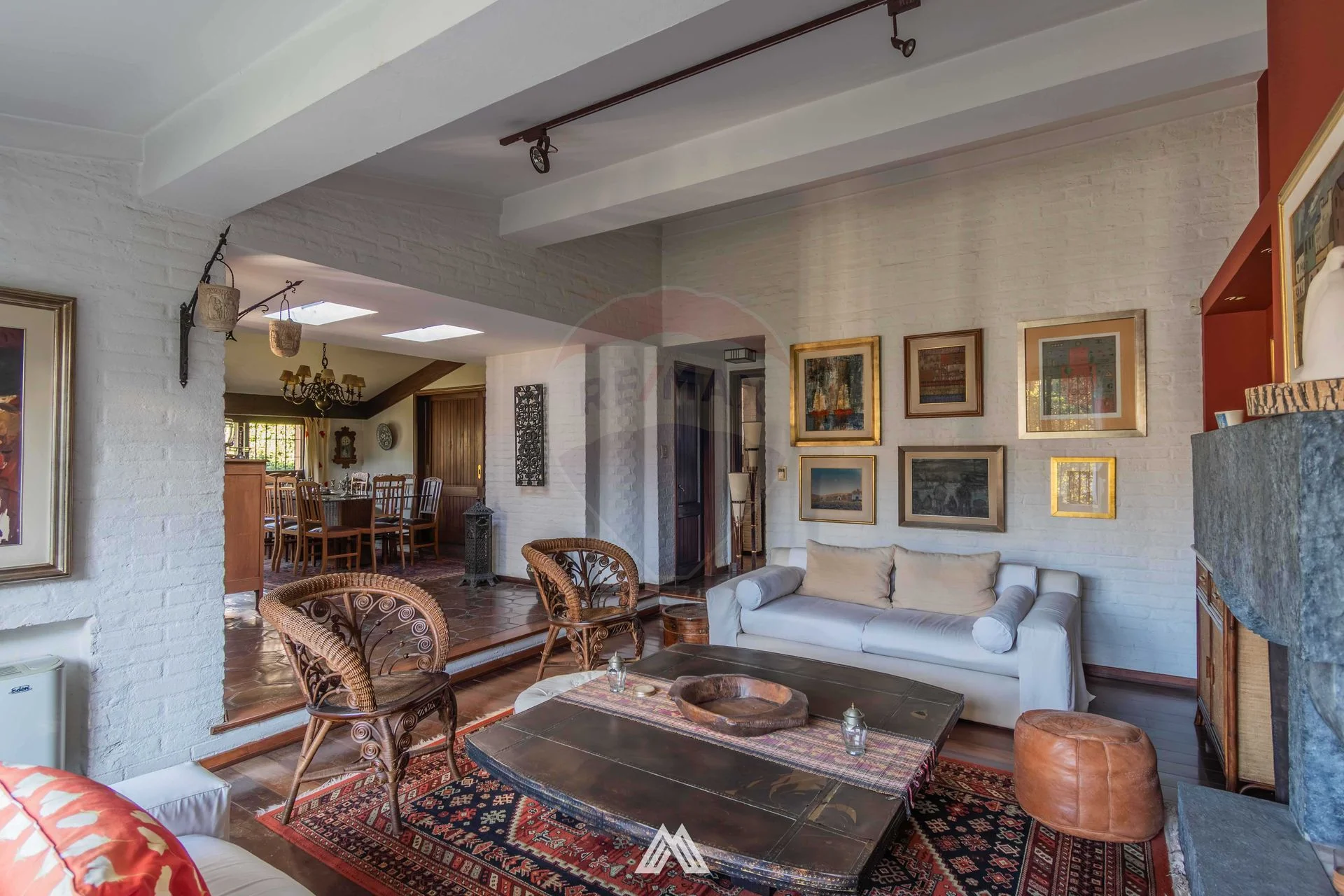 Estar con estufa de leña y aire acondicionado y salida a una pérgola y al jardín.