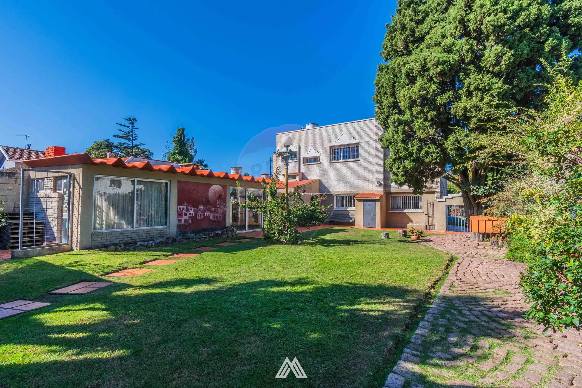 La casa se ubica en un terreno de 592 m2 en esquina, tiene jardín al frente y gran fondo con césped y barbacoa cerrada, área de lavadero, depósito, garaje cerrado y cochera techada.