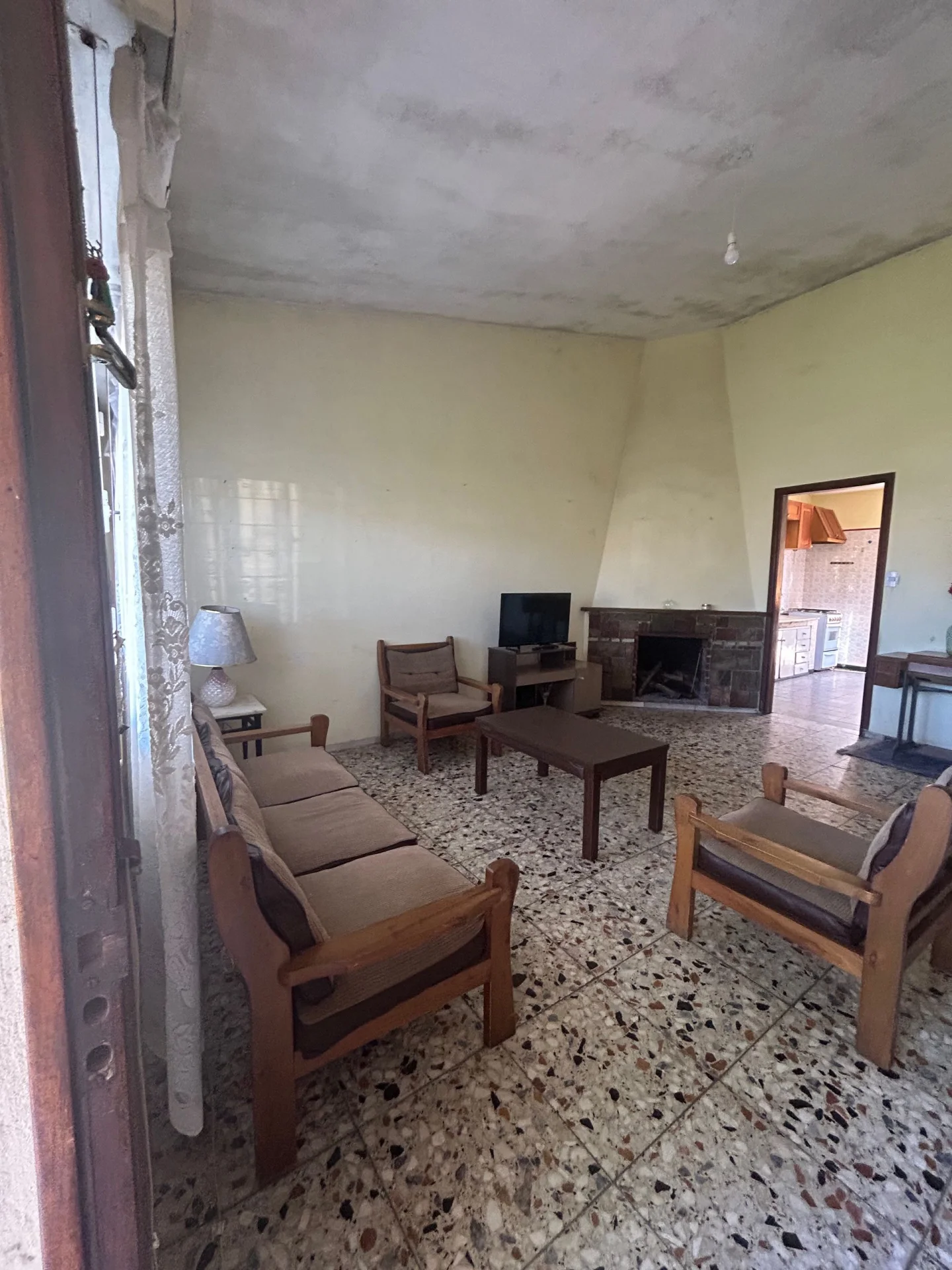 Living comedor con estufa a leña, cocina definida, baño completo.