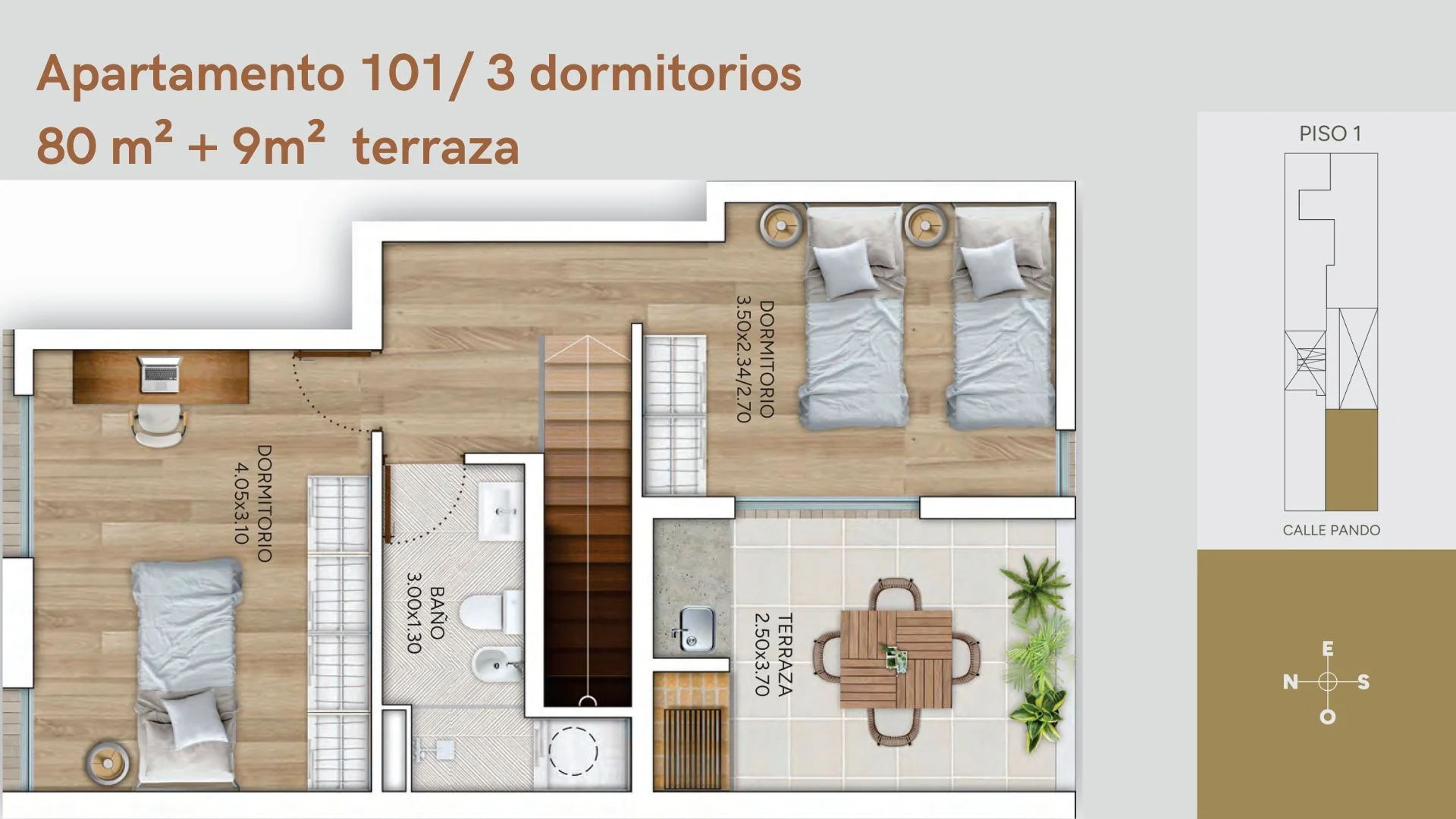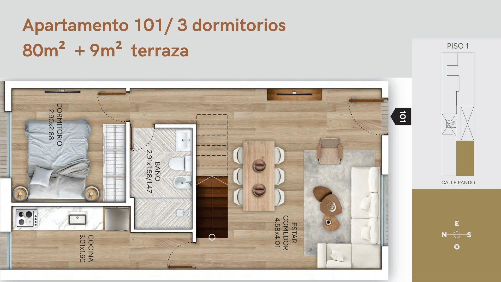 Unidad 101 en planta alta al frente, en un condominio de 8 unidades independientes, sin gastos comunes.