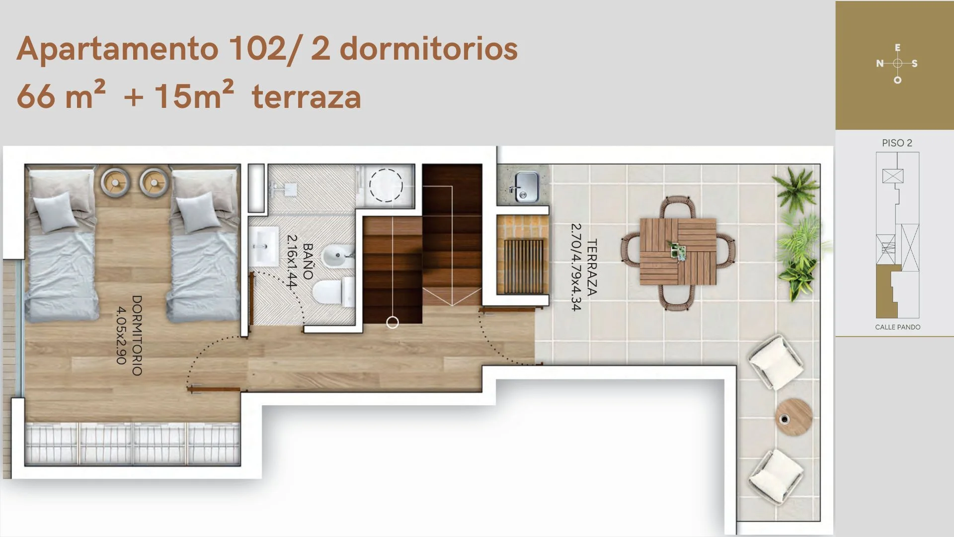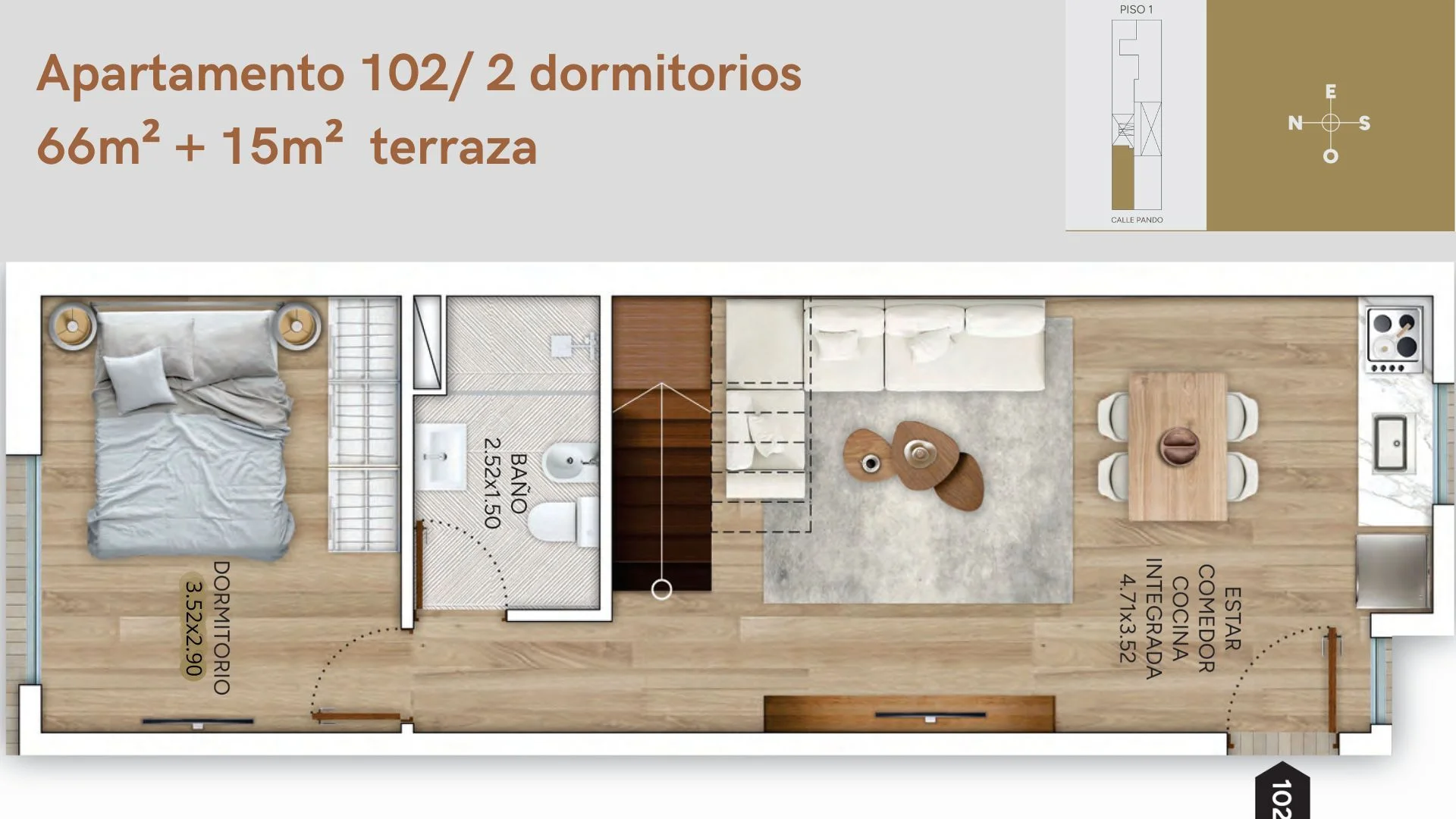 Unidad 102 en planta alta al frente, en un condominio de 8 unidades independientes, sin gastos comunes.