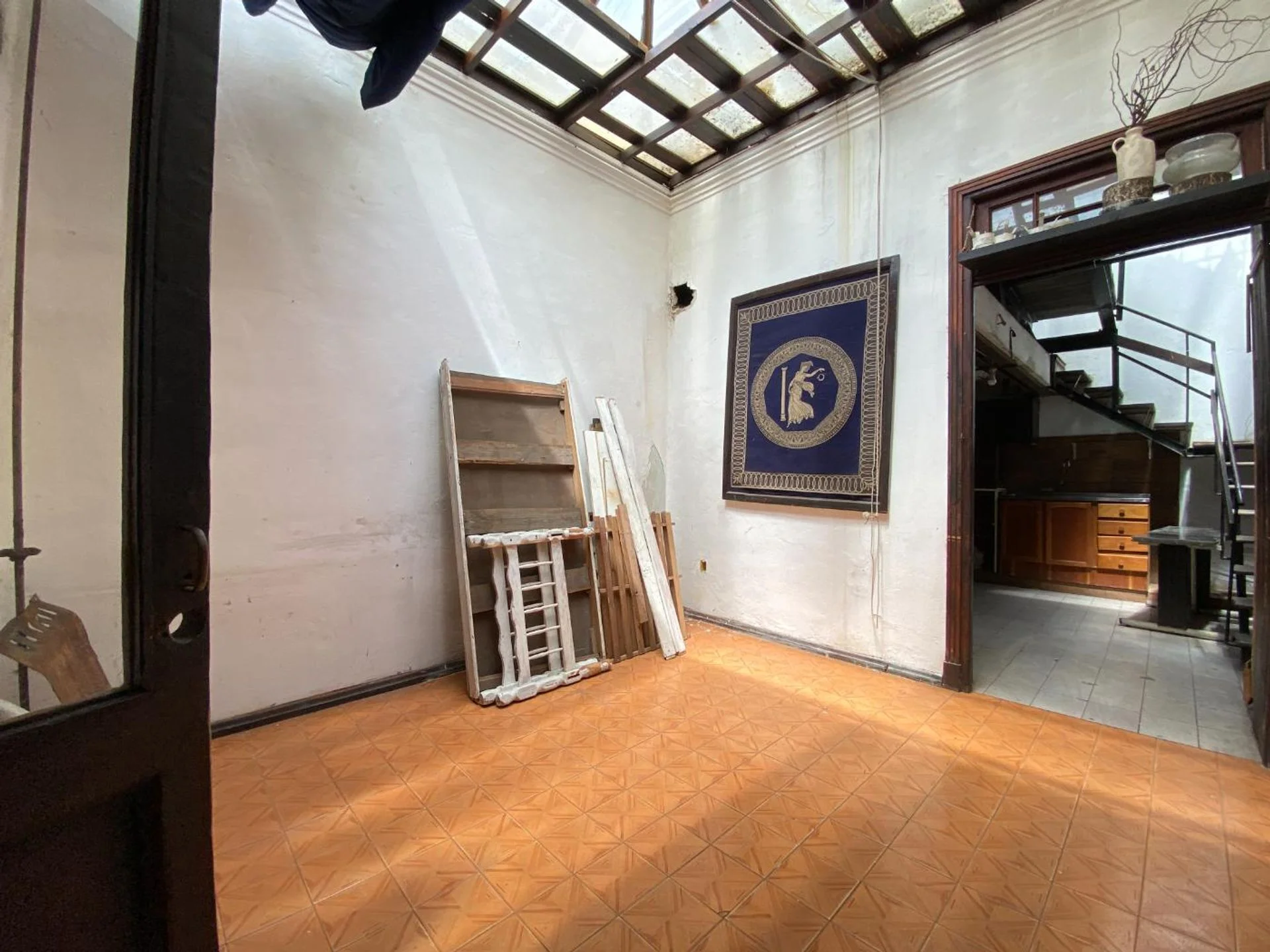 En planta baja: Escalera de acceso a estar con claraboya.