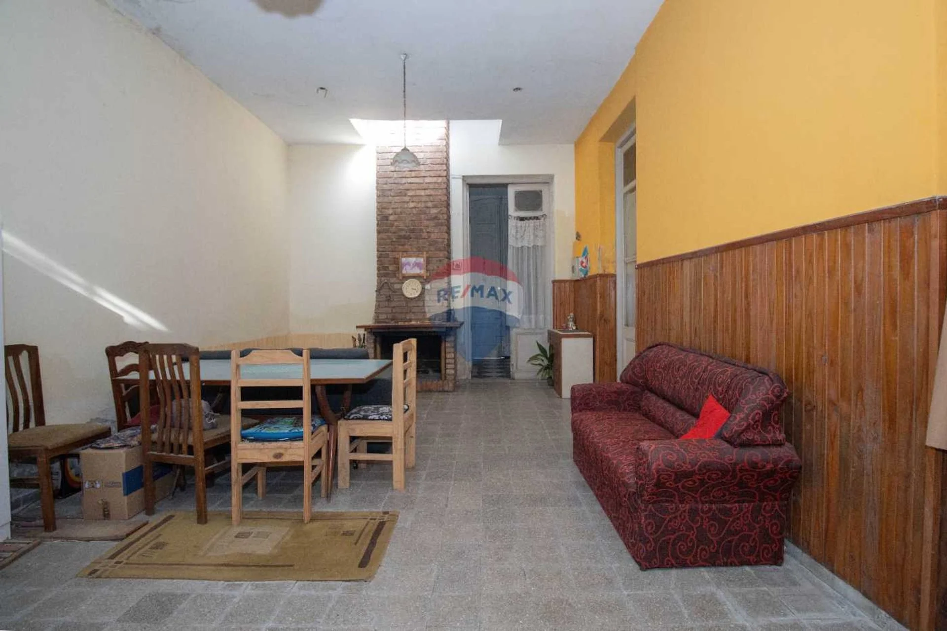 Amplio living comedor con estufa de leña, ventana hacia el otro patio.