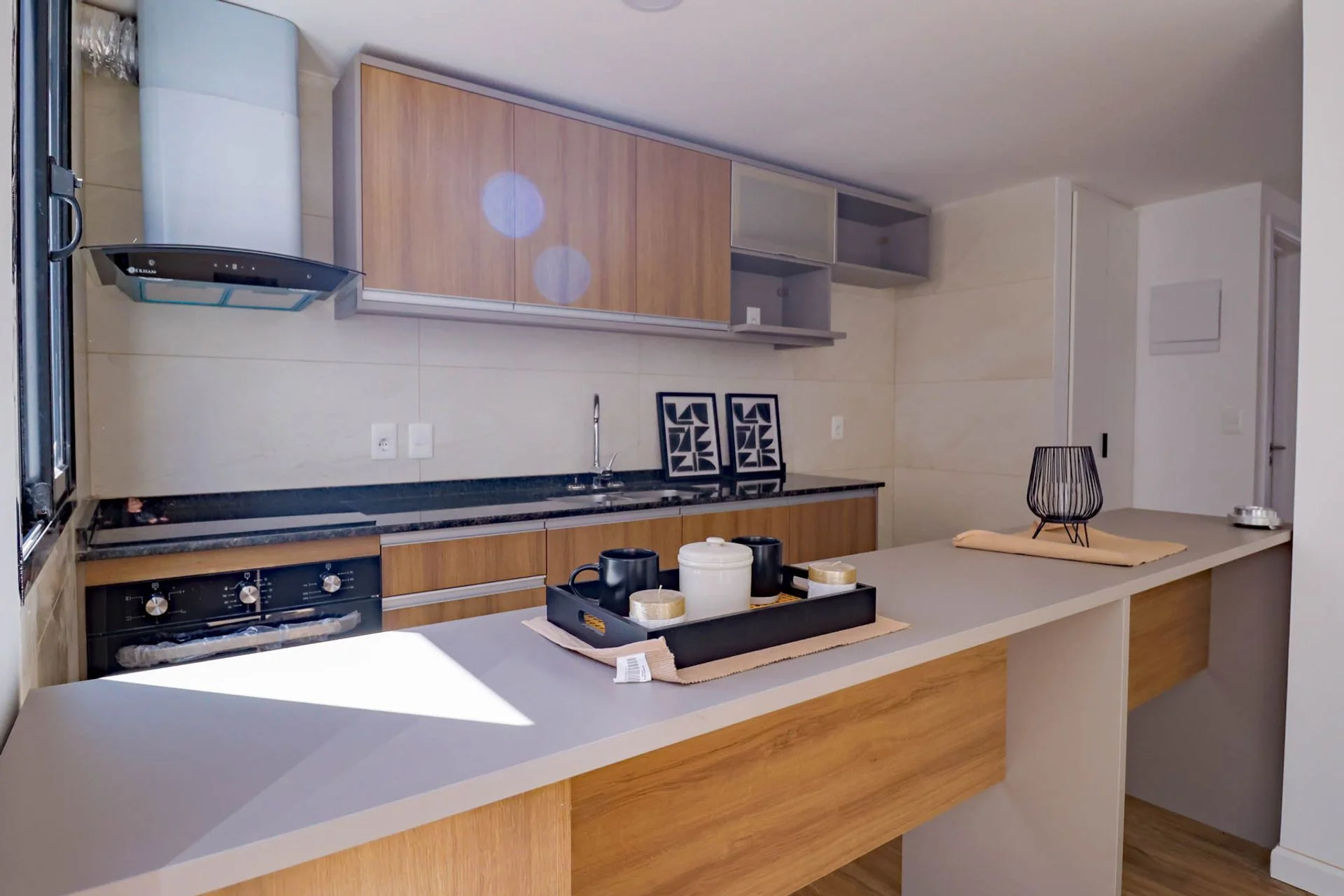 Cocina con barra desayunador, muebles bajo y sobre mesada, equipada con horno , anafe y extracción de aire.