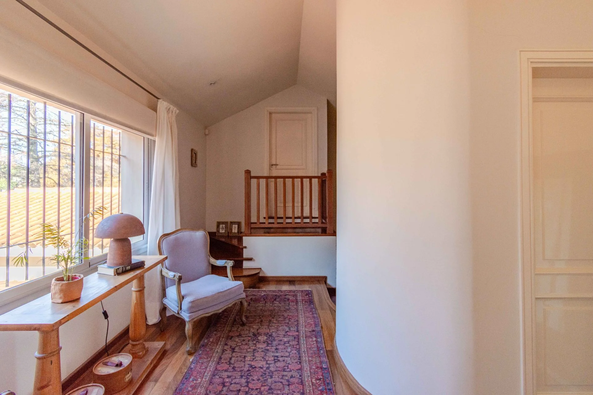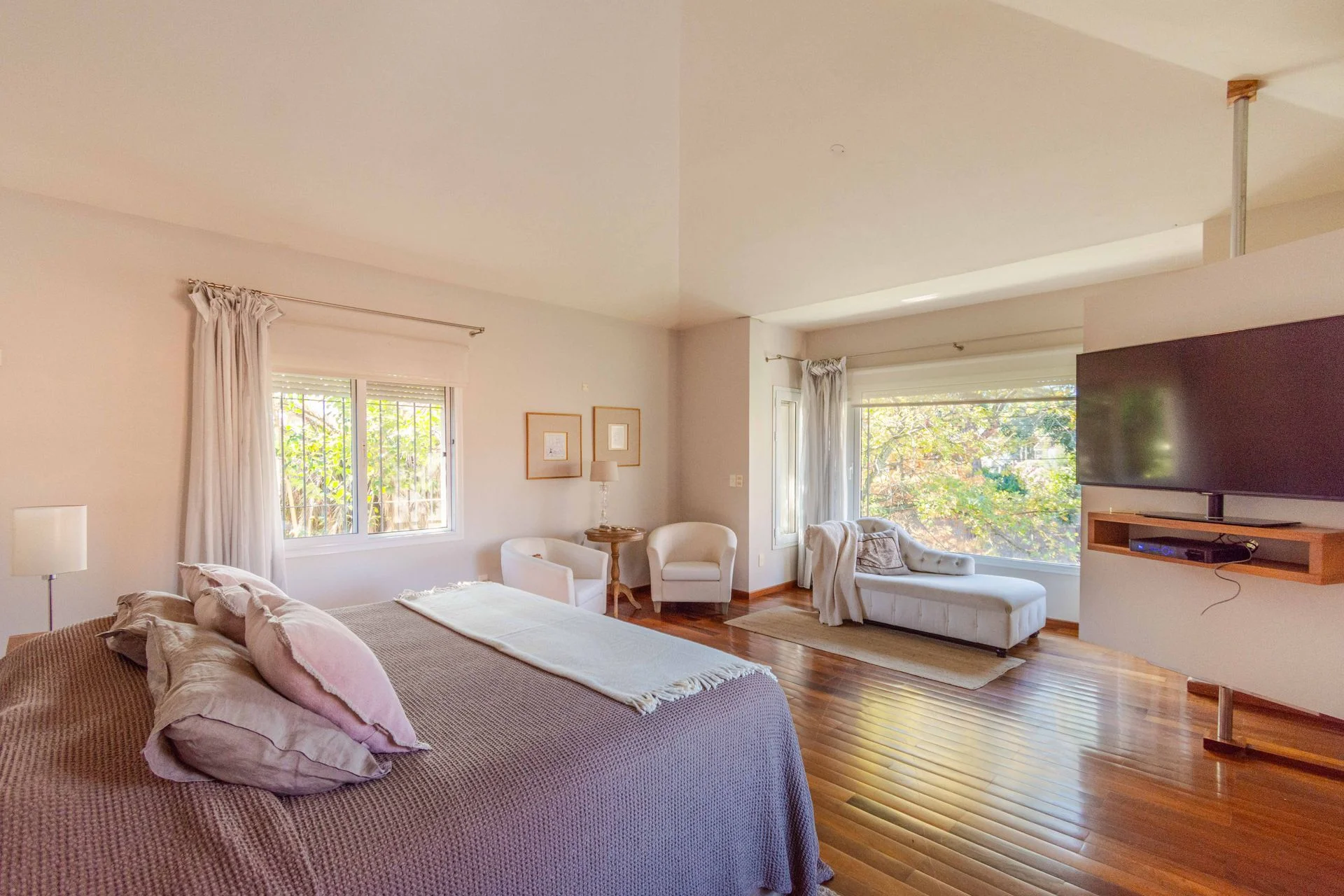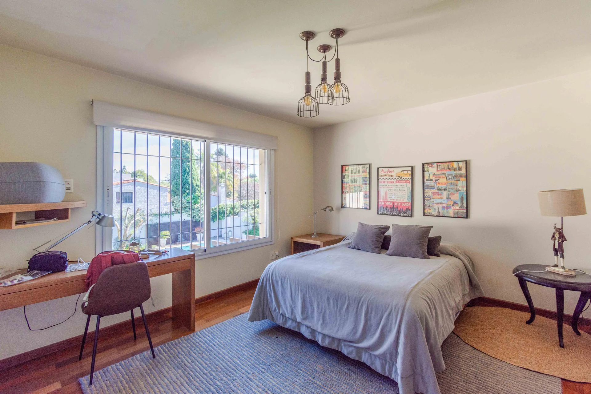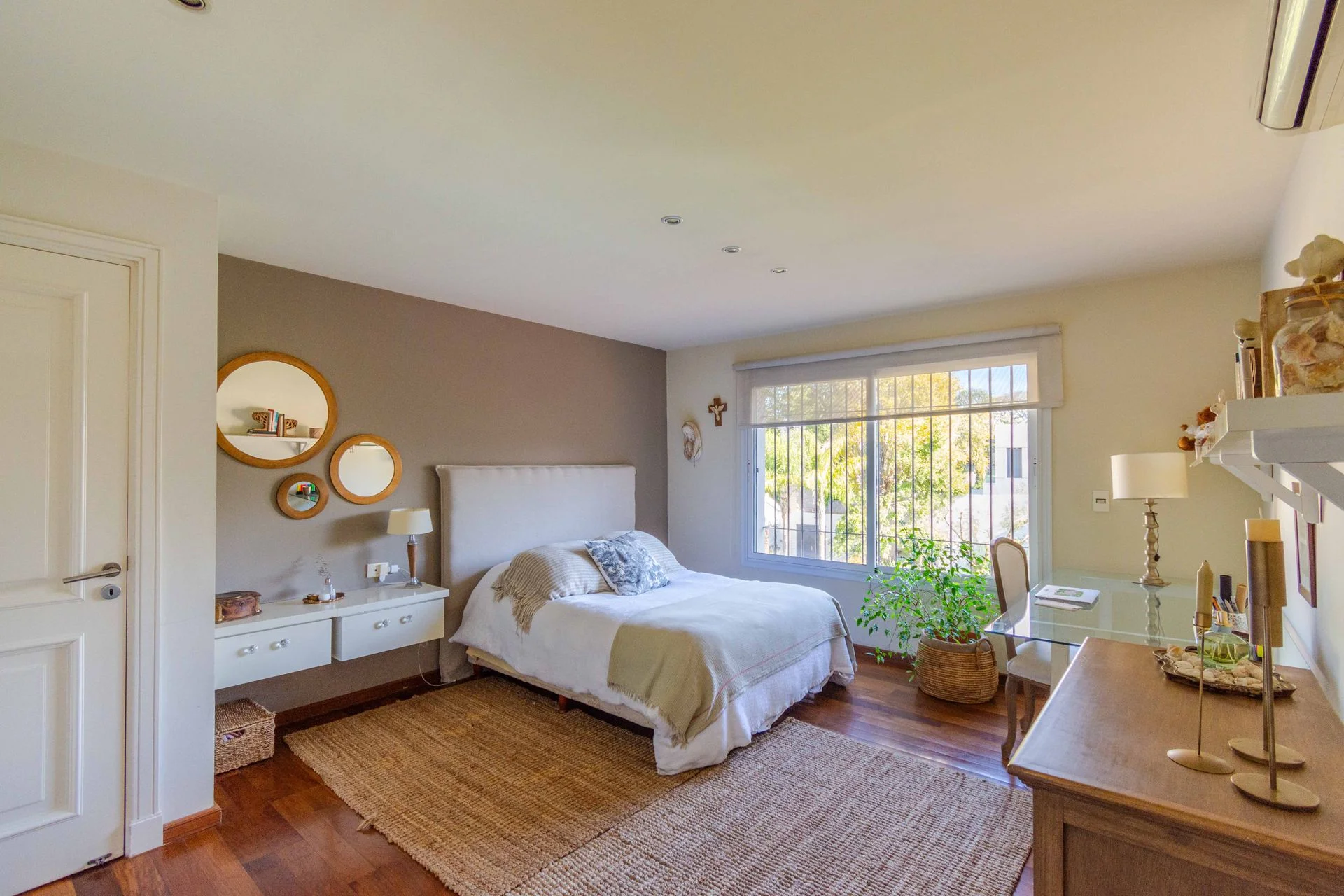 En planta alta tenemos 3 amplios dormitorios en suite con placares y aire acondicionado, gran Master Suite con zona de lectura, vestidor doble, baño en suite con jacuzzi y revestimiento de mármol travertino, y el dormitorio de servicio con baño propio