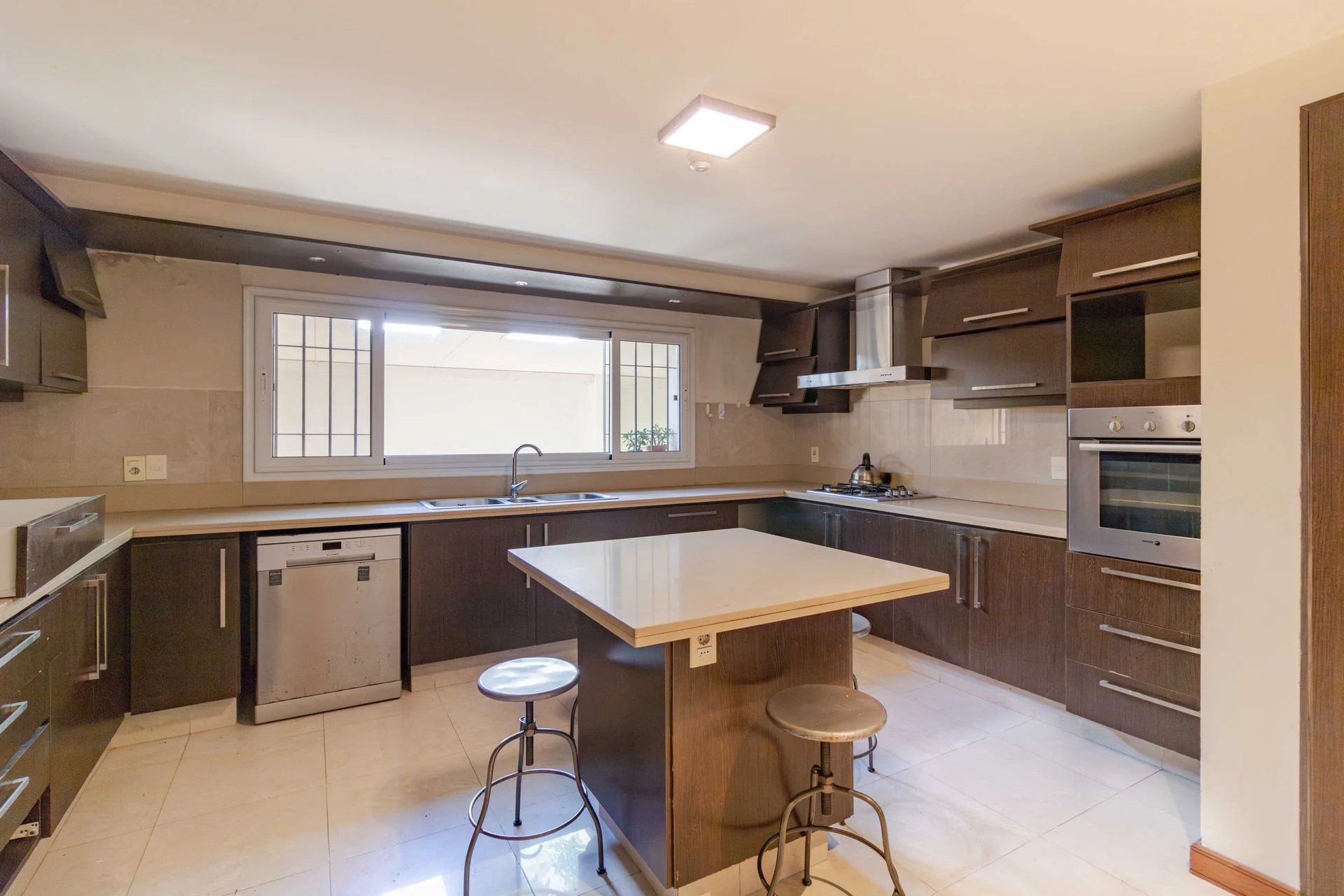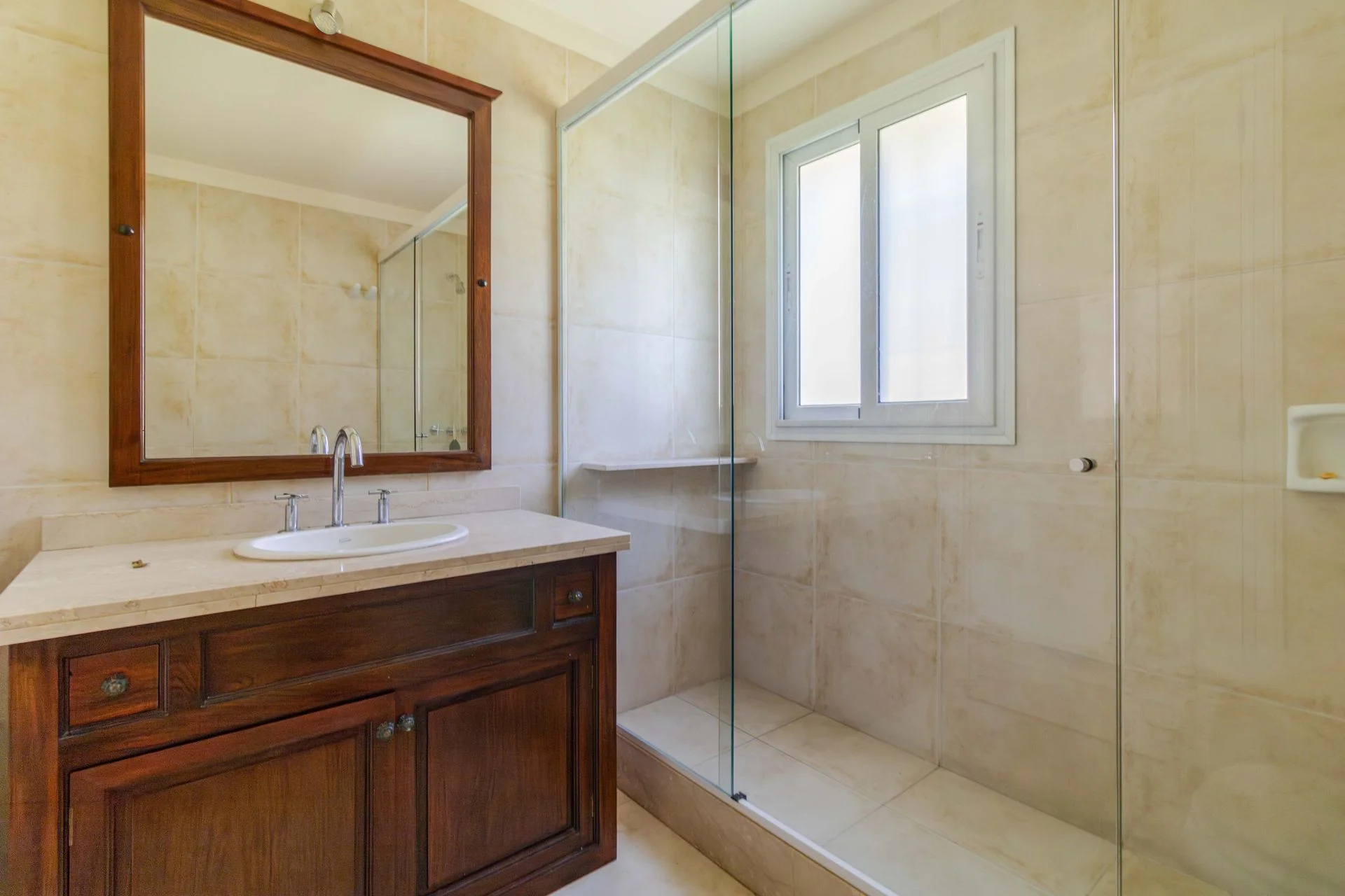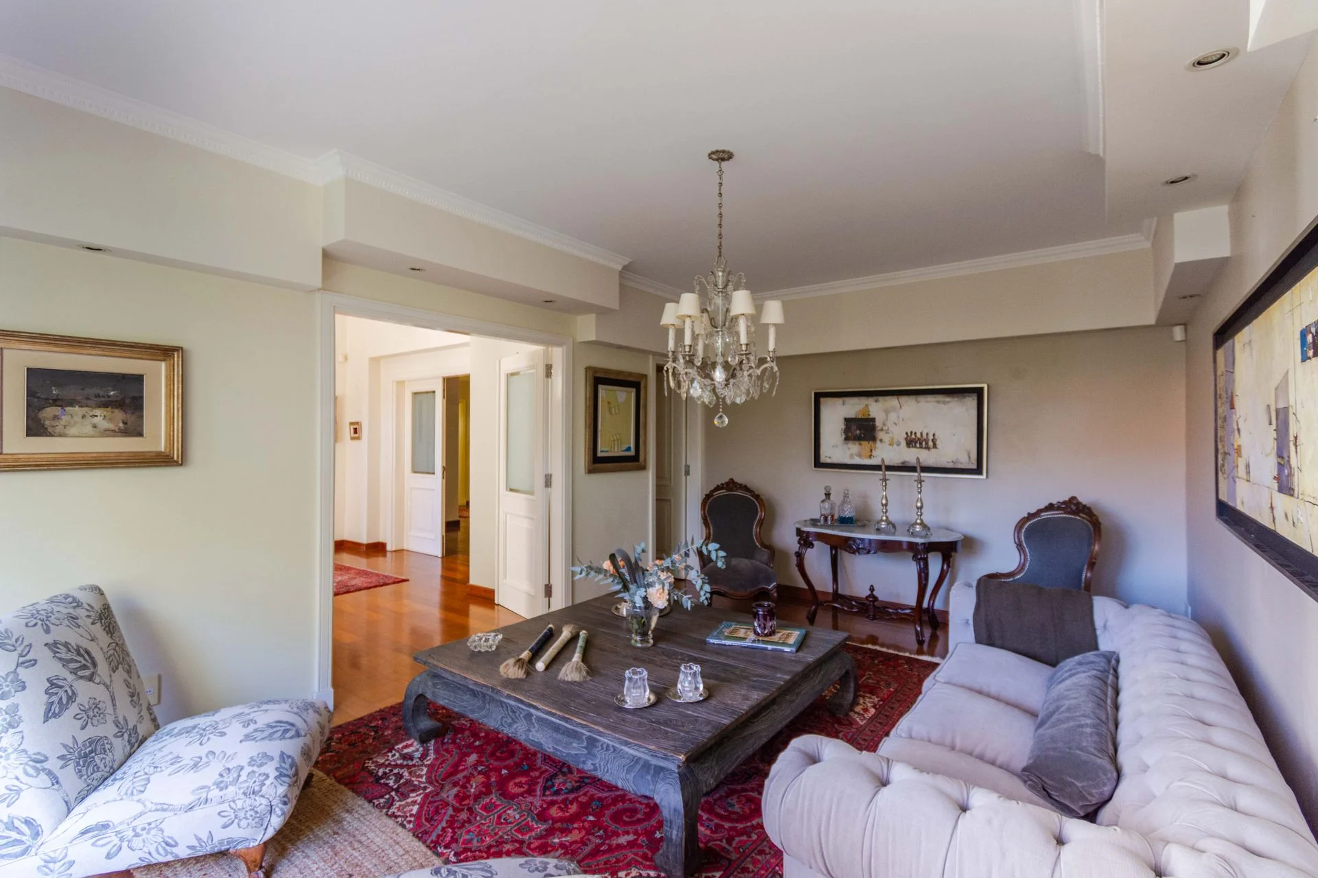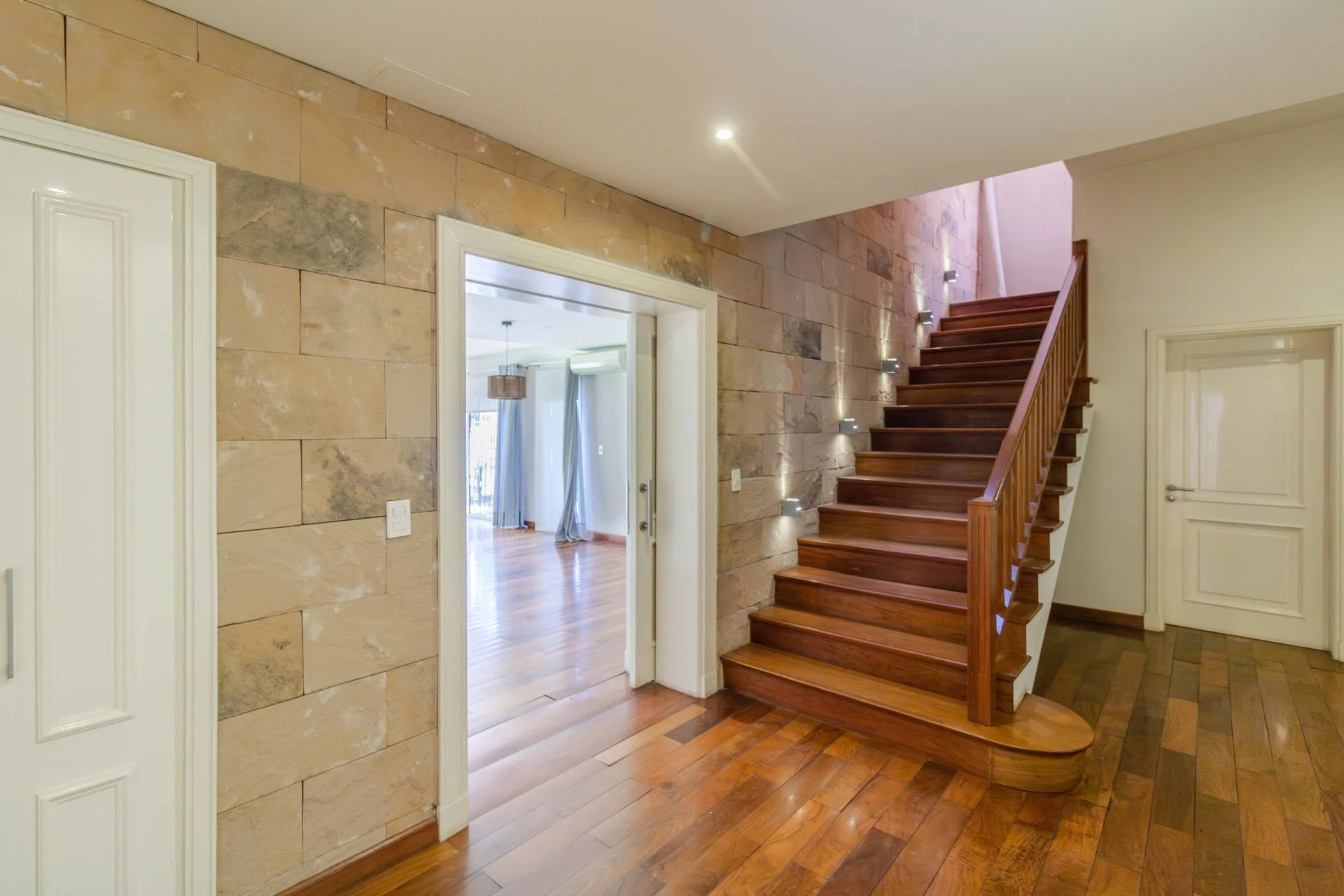 En planta alta tenemos 3 amplios dormitorios en suite con placares y aire acondicionado, gran Master Suite con zona de lectura, vestidor doble, baño en suite con jacuzzi y revestimiento de mármol travertino, y el dormitorio de servicio con baño propio