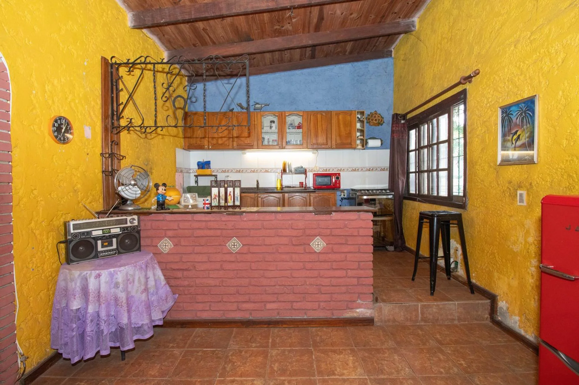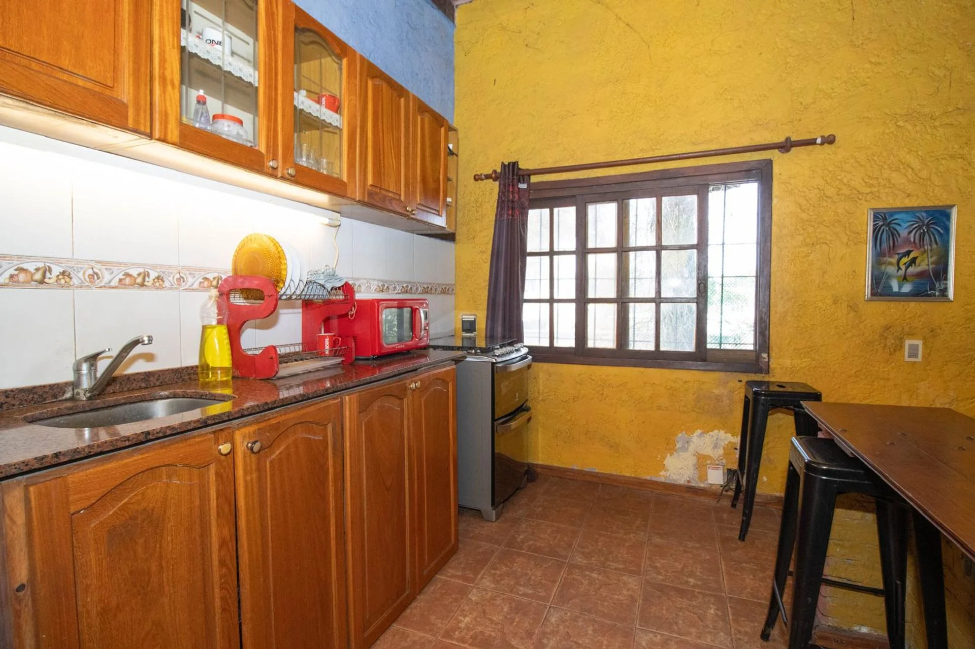 Cocina equipada con placares sobre y bajo mesada, barra pasaplatos y comedor con estufa a leña de hierro.