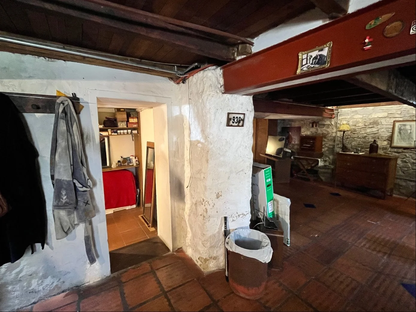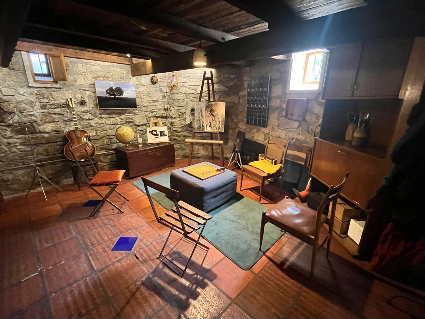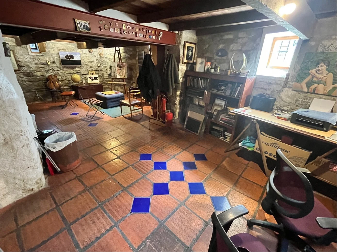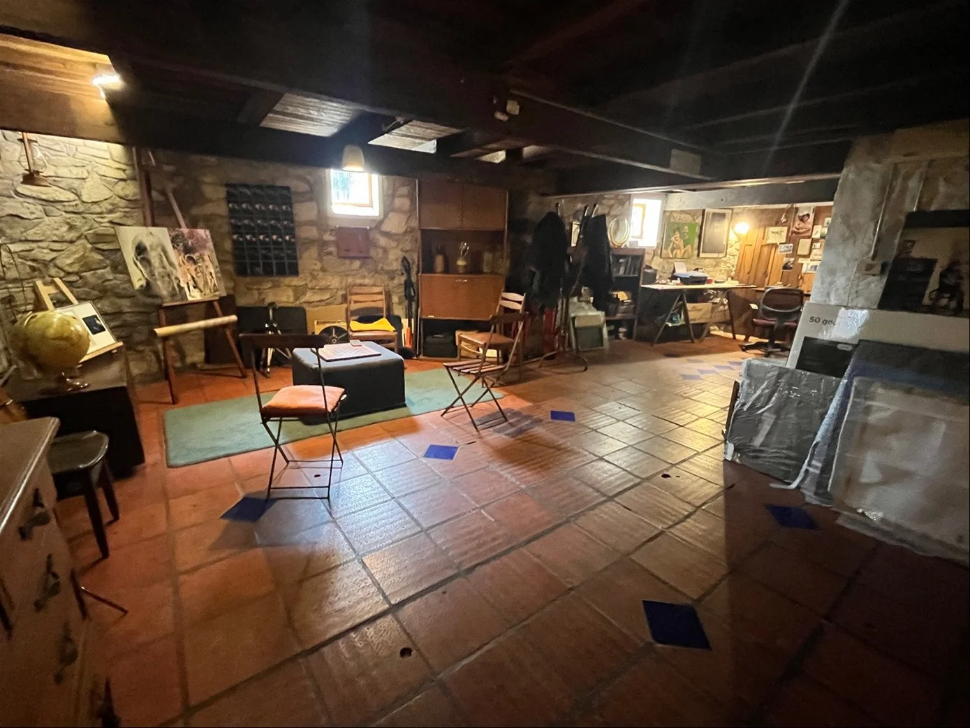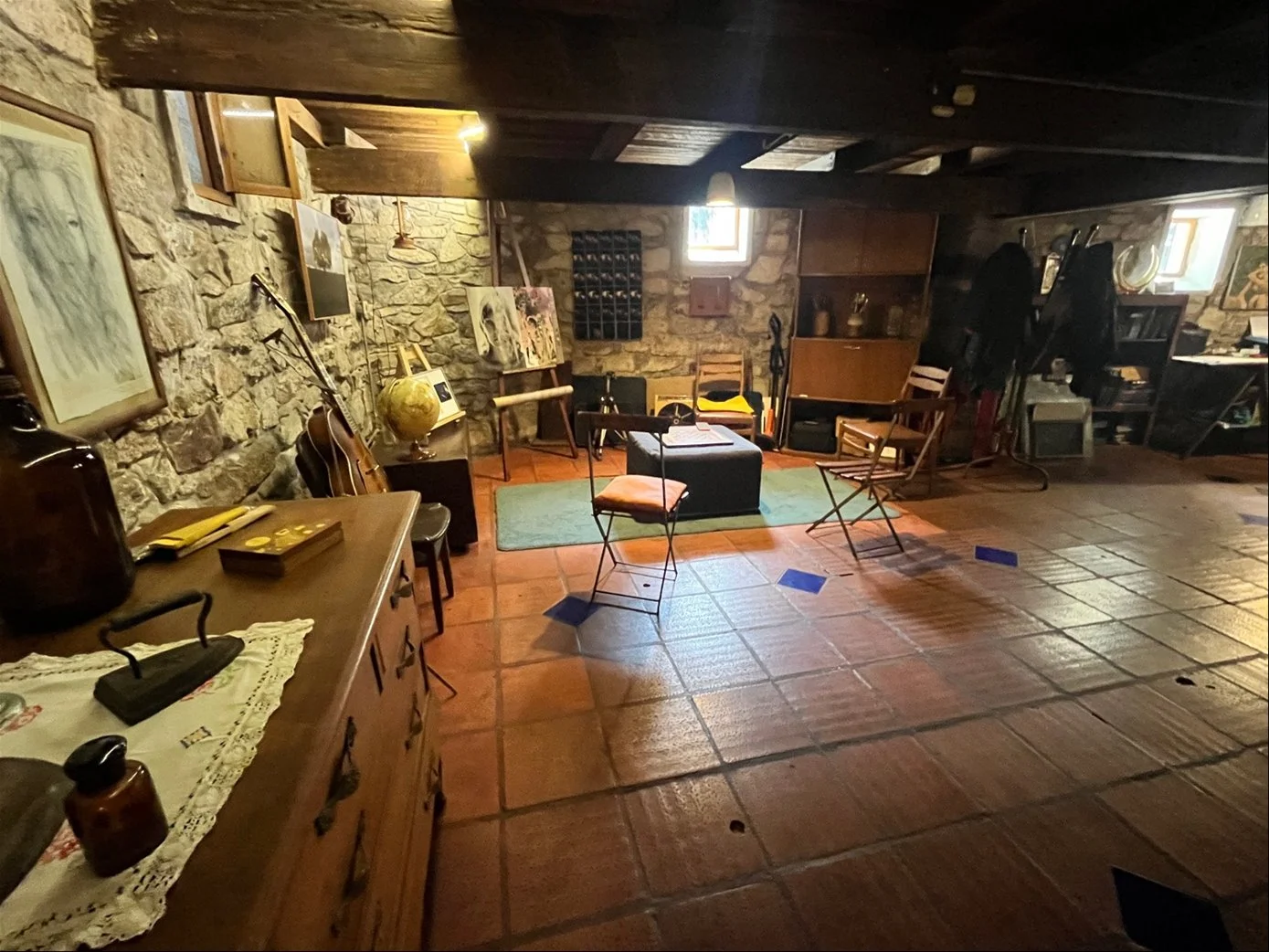 Desde el comedor diario se baja un piso por escalera hacia el muy amplio subsuelo, con parte de las paredes en la piedra original de la casa, con vigas expuestas y pisos de layota. Este es un multiespacio muy generoso en tamaño que hoy funciona como dormitorio principal, segundo living, estudio, vestidor y otro baño completo. Tiene varias ventanas pequeñas hacia la calle por donde recibe luz natural y ventilación.