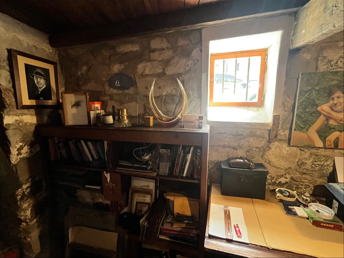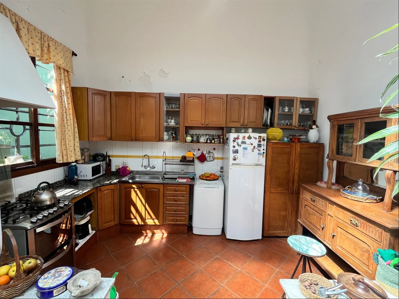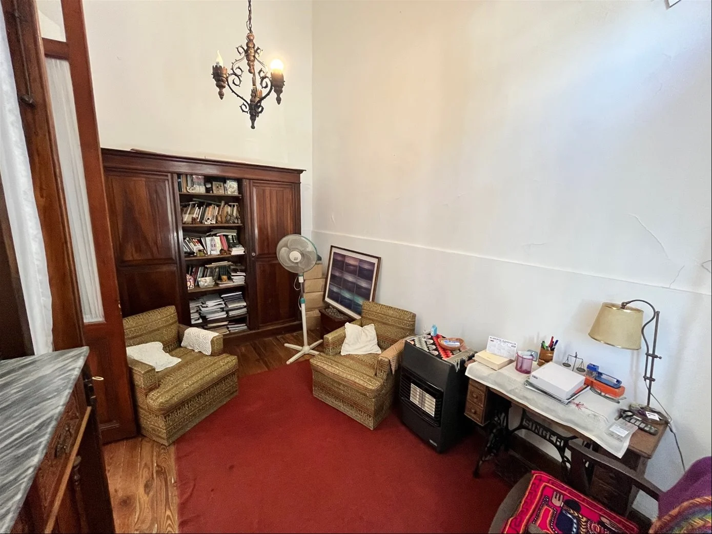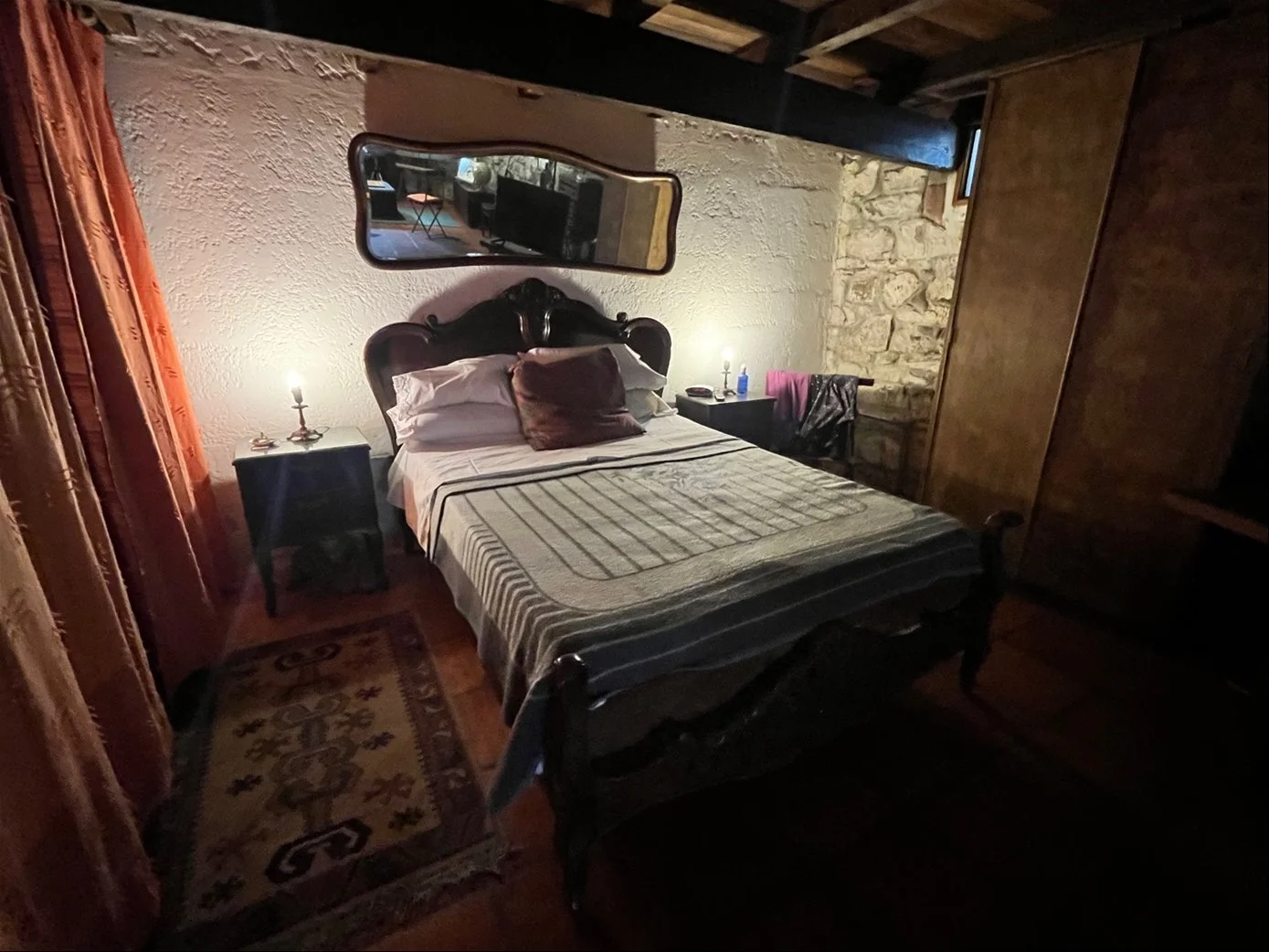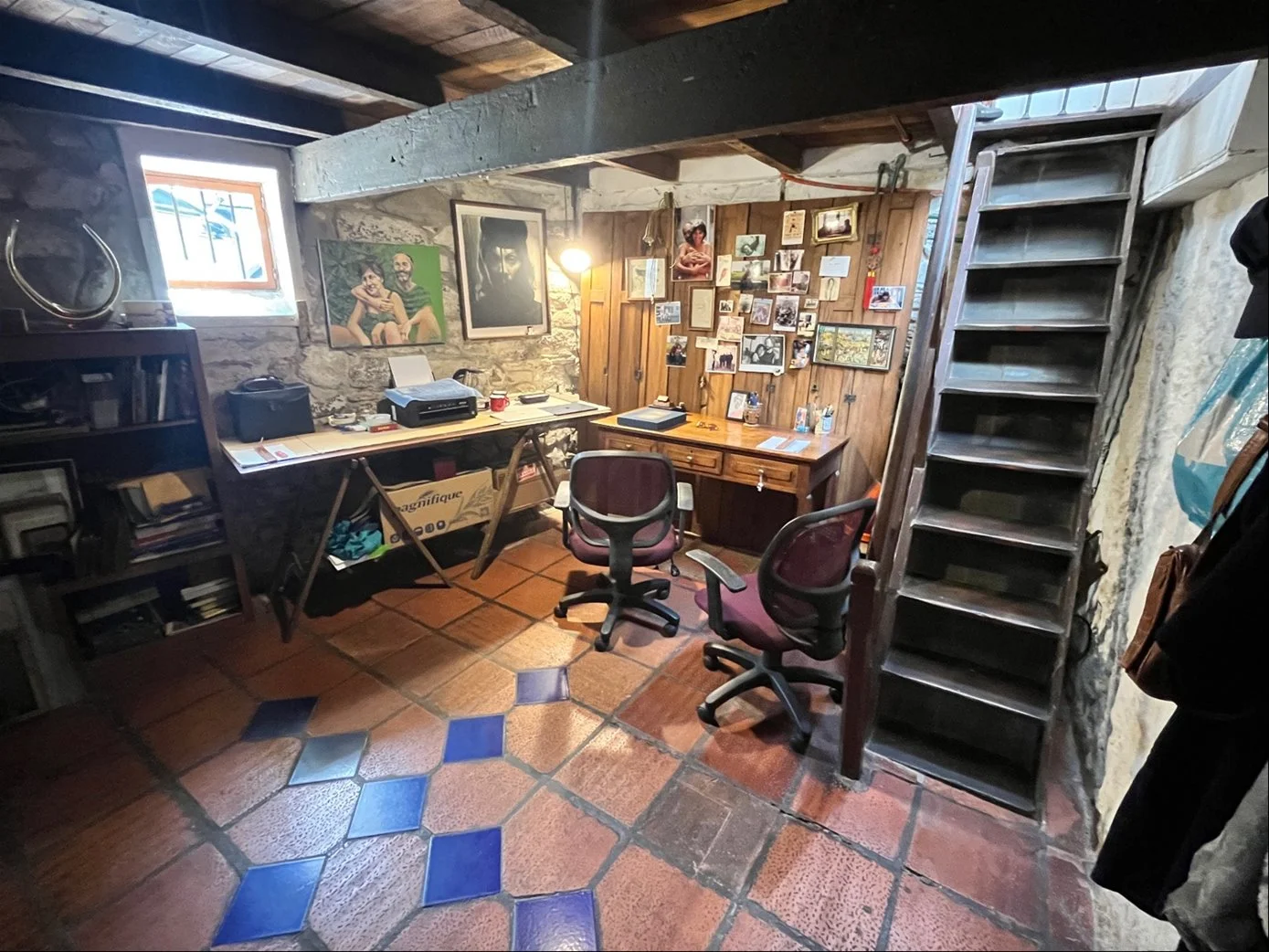 Desde el comedor diario se baja un piso por escalera hacia el muy amplio subsuelo, con parte de las paredes en la piedra original de la casa, con vigas expuestas y pisos de layota. Este es un multiespacio muy generoso en tamaño que hoy funciona como dormitorio principal, segundo living, estudio, vestidor y otro baño completo. Tiene varias ventanas pequeñas hacia la calle por donde recibe luz natural y ventilación.