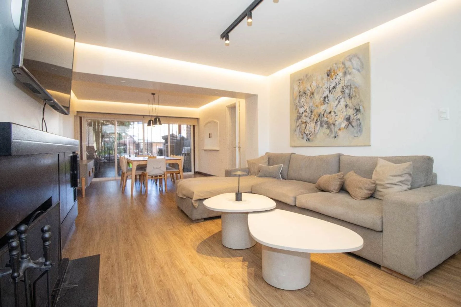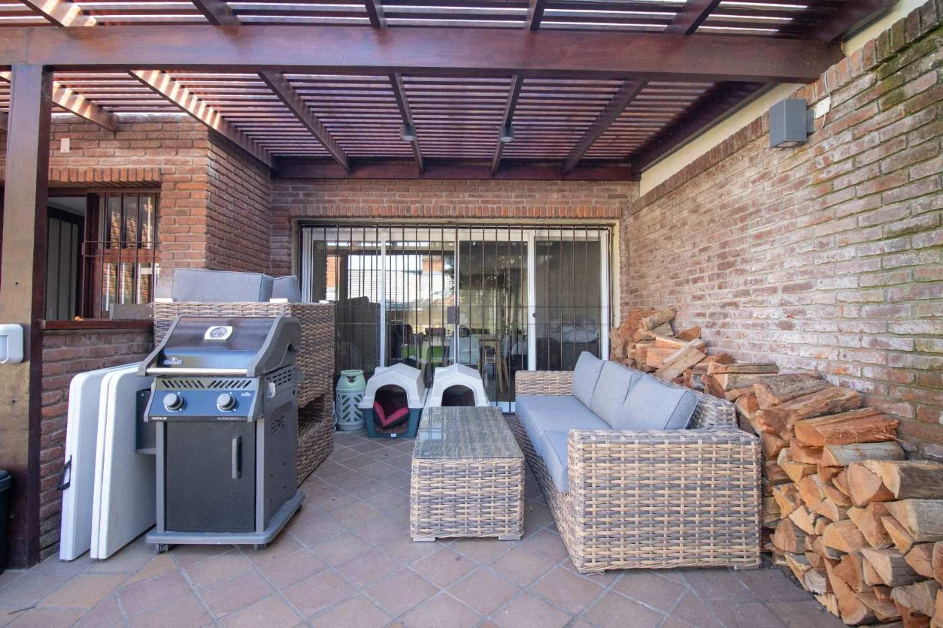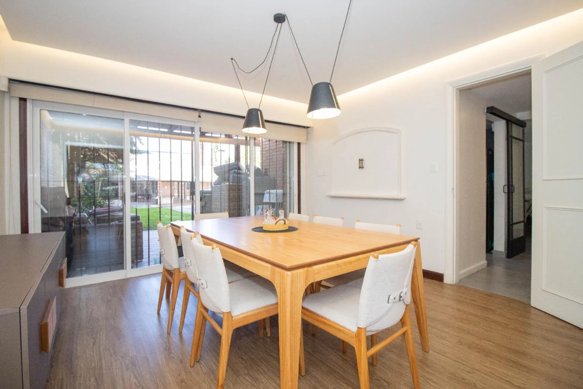 Al ingresar un hall de distribución con despojador con gran capacidad. Puerta de hierro corrediza para acceder a un amplio living comedor con estufa a leña y con una gran ventana que da al frente y otro gran ventanal que da al jardín y comunica con un espacio exterior techado.
