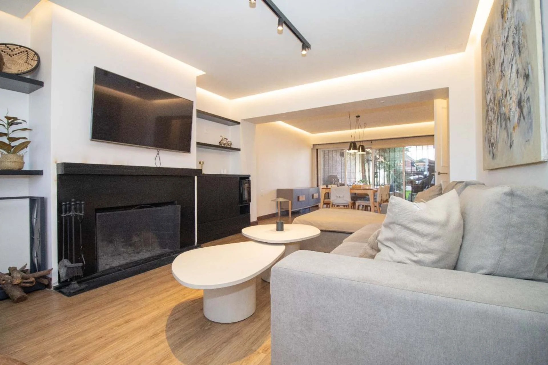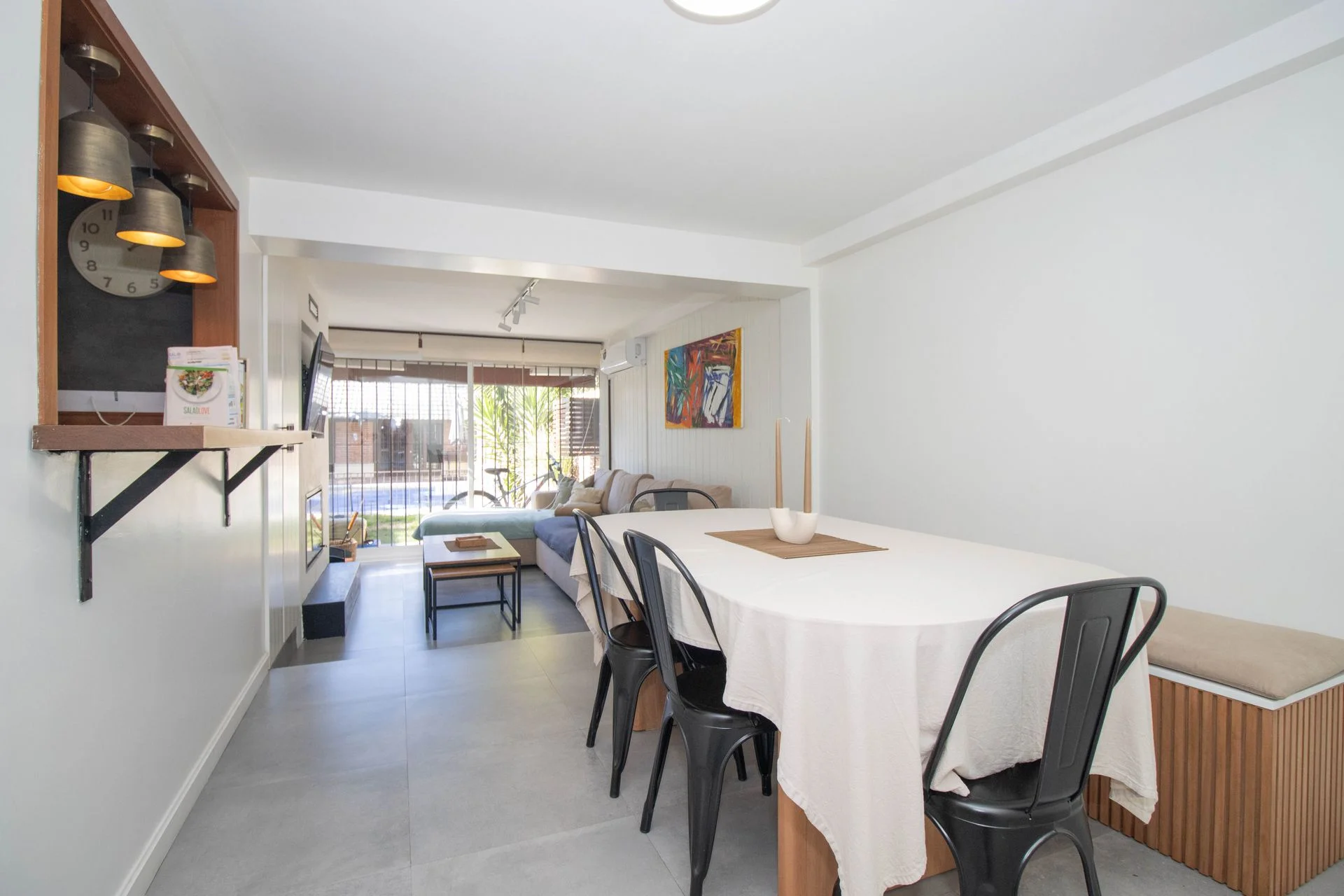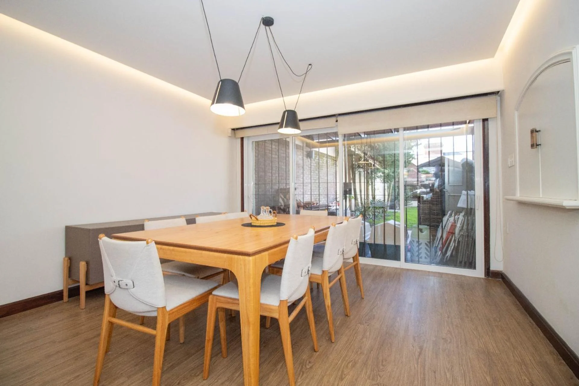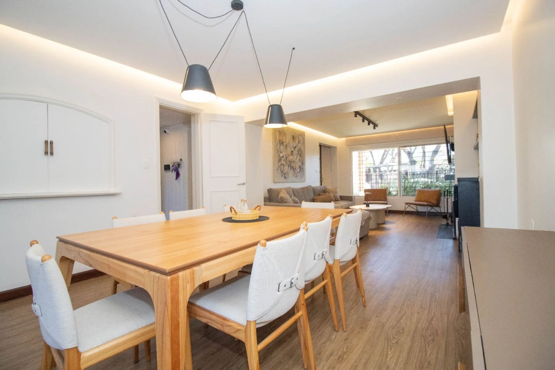 Al ingresar un hall de distribución con despojador con gran capacidad. Puerta de hierro corrediza para acceder a un amplio living comedor con estufa a leña y con una gran ventana que da al frente y otro gran ventanal que da al jardín y comunica con un espacio exterior techado.