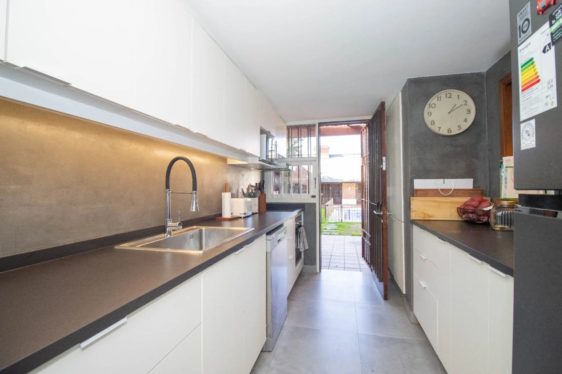 Cocina definida con un muy lindo diseño y con acceso al jardín. Muebles aéreos y bajo mesada, horno anafe empotrado con campana de extracción. Y una abertura / ventana con barra que comunica con el estar, haciéndolo muy funcional.