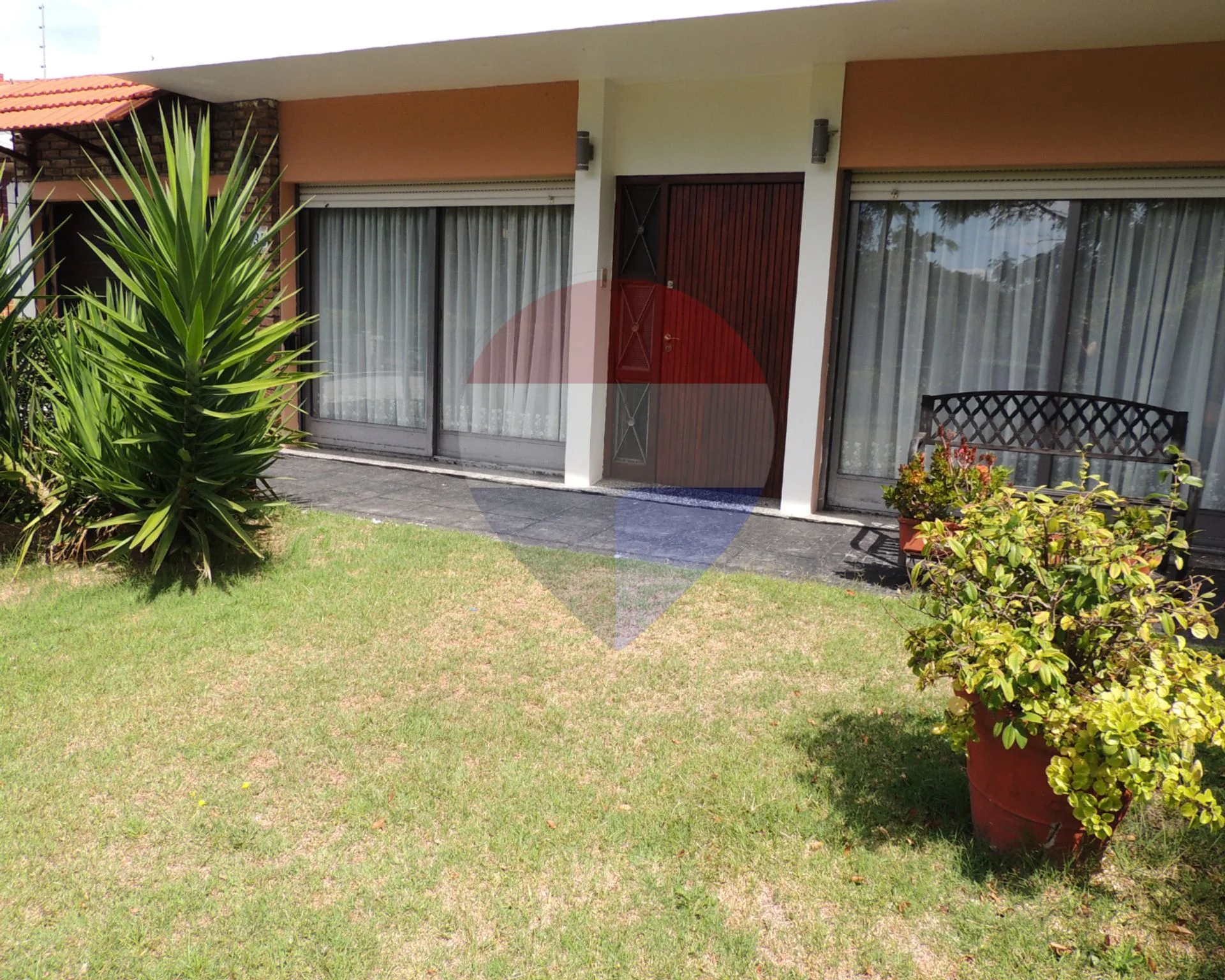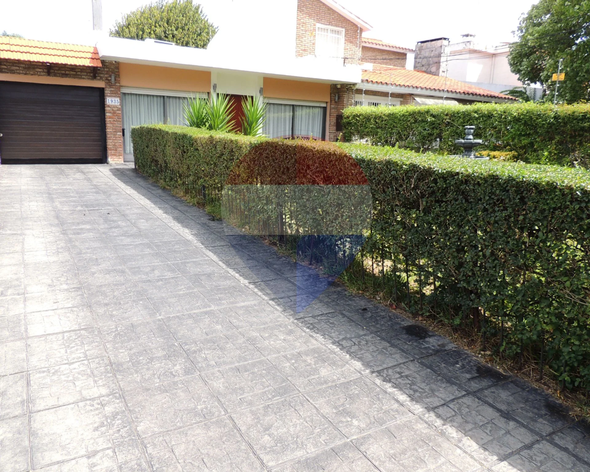 Jardín frontal con reja y portón automatizado para ingreso vehicular, espacio para estacionar 3 vehículos dentro del predio.