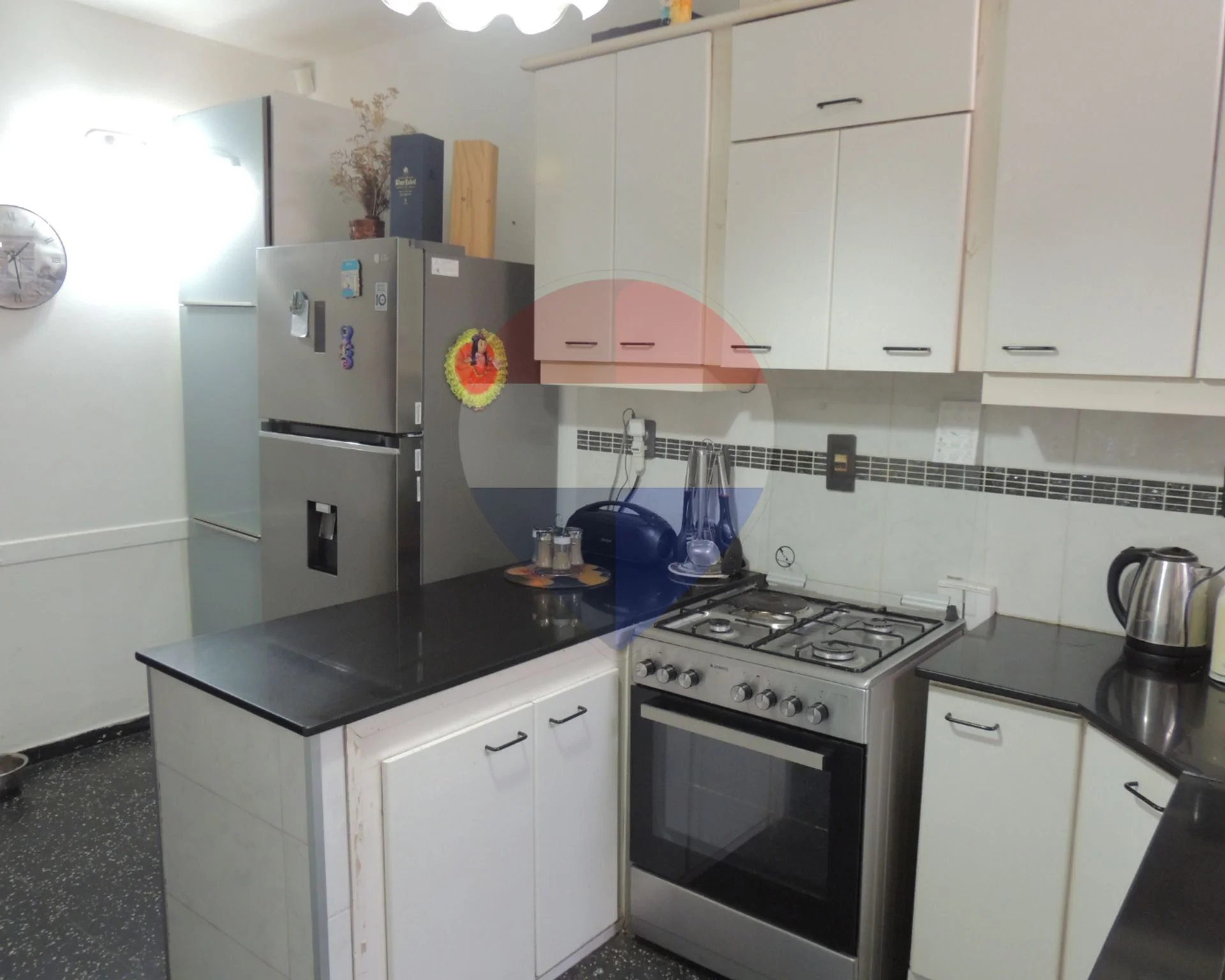 Cocina definida con doble mesada, placares bajo y sobre mesada, extractor, doble pileta y grifería monocomando.