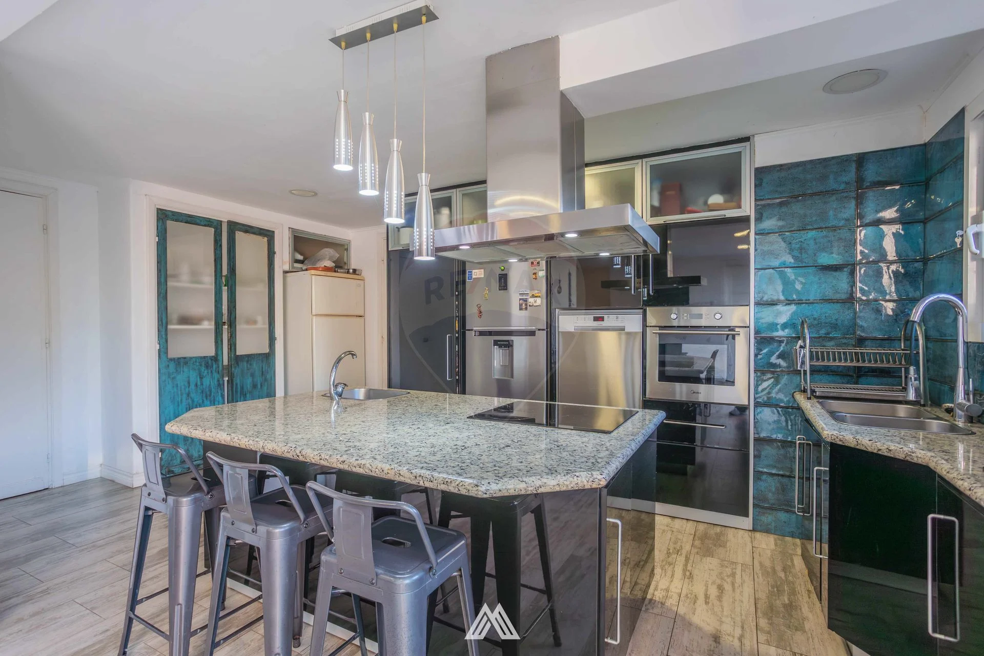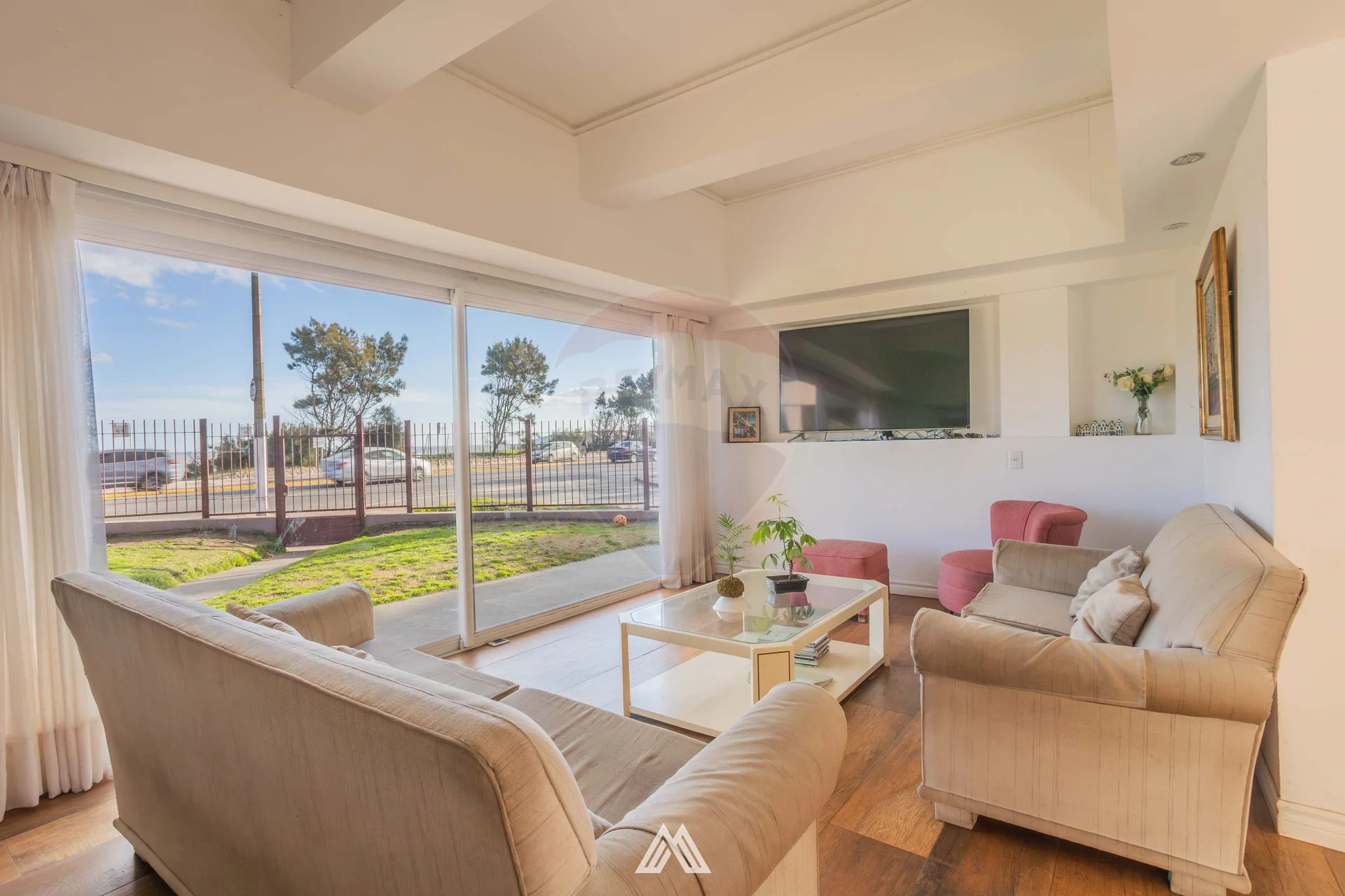Los ambientes se complementan con living-comedor con amplios ventanales y vista al mar, cocina integrada con isla de granito y electrodomésticos empotrados, jardín y garaje techado para dos vehículos, más una explanada de estacionamiento para cinco vehículos adicionales. En el fondo, se encuentra una piscina climatizada y un parrillero, rodeados de muros altos.