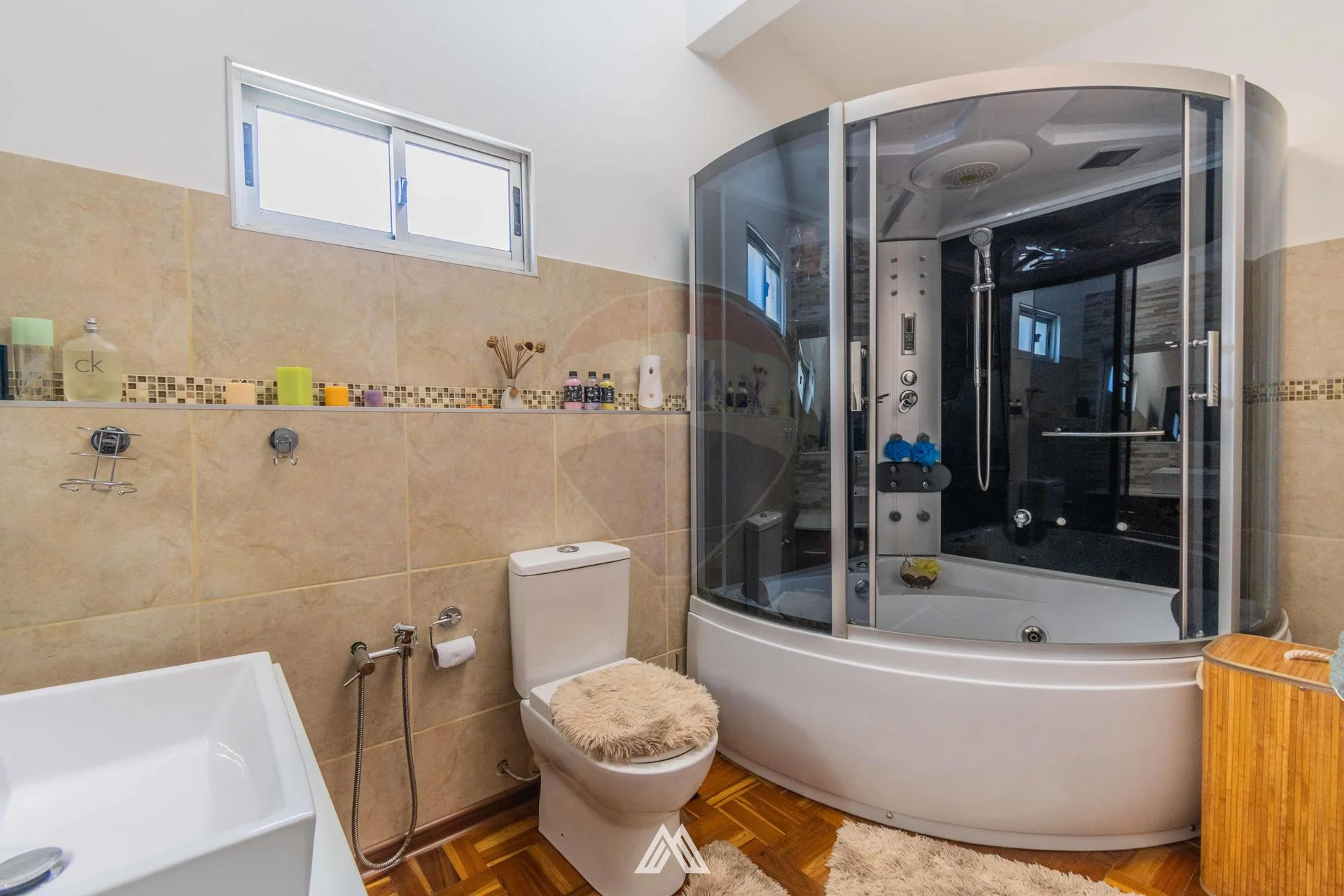Baño principal con jacuzzi-cabina, construido con materiales de alta calidad como termofusión, cerámica, bacha de cerámica y un mueble con mesada de mármol.