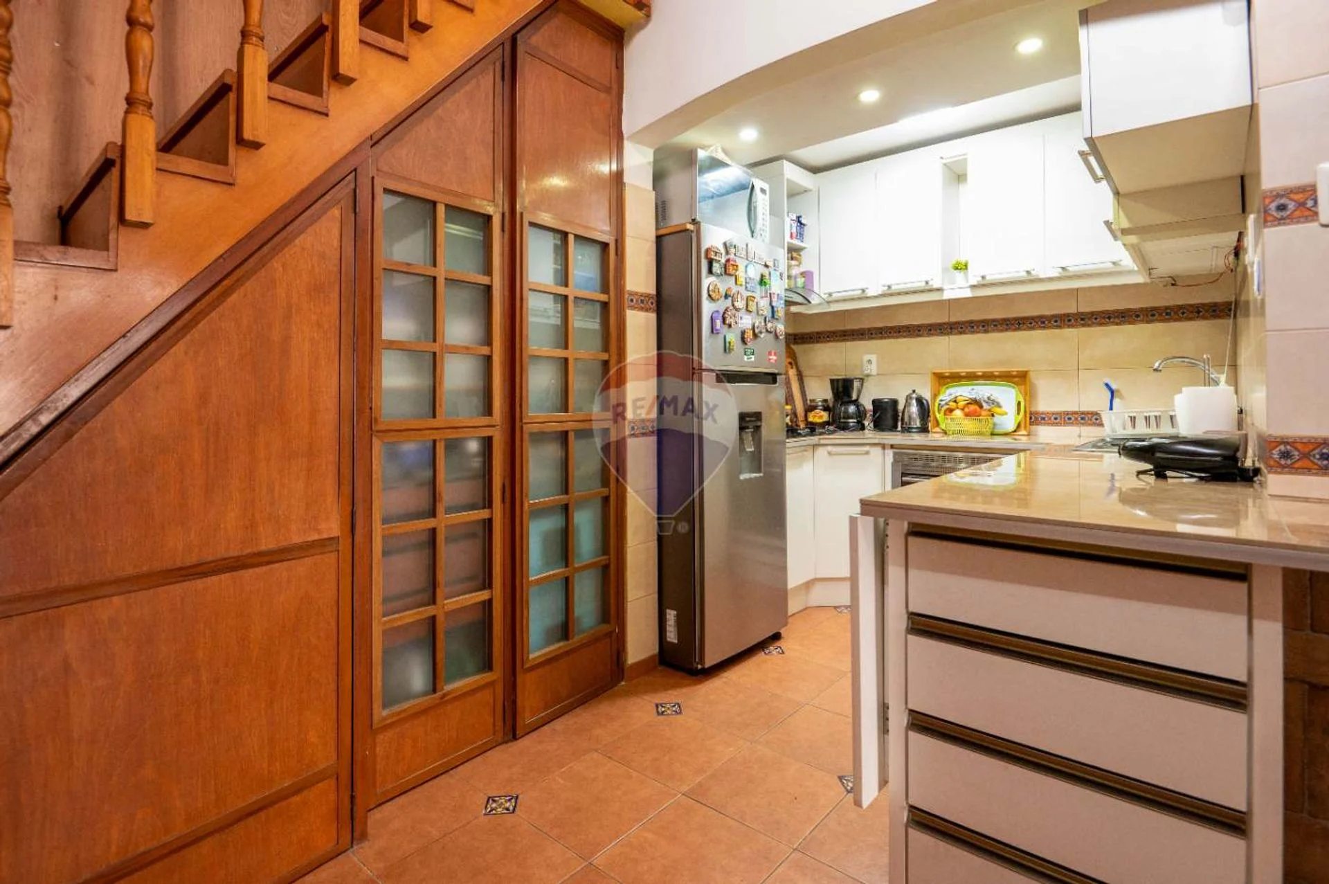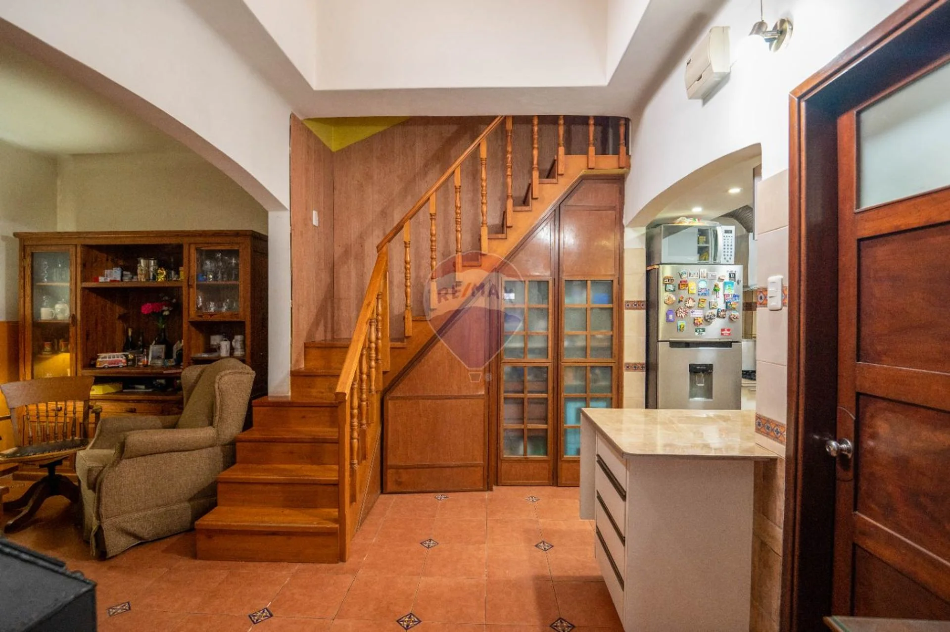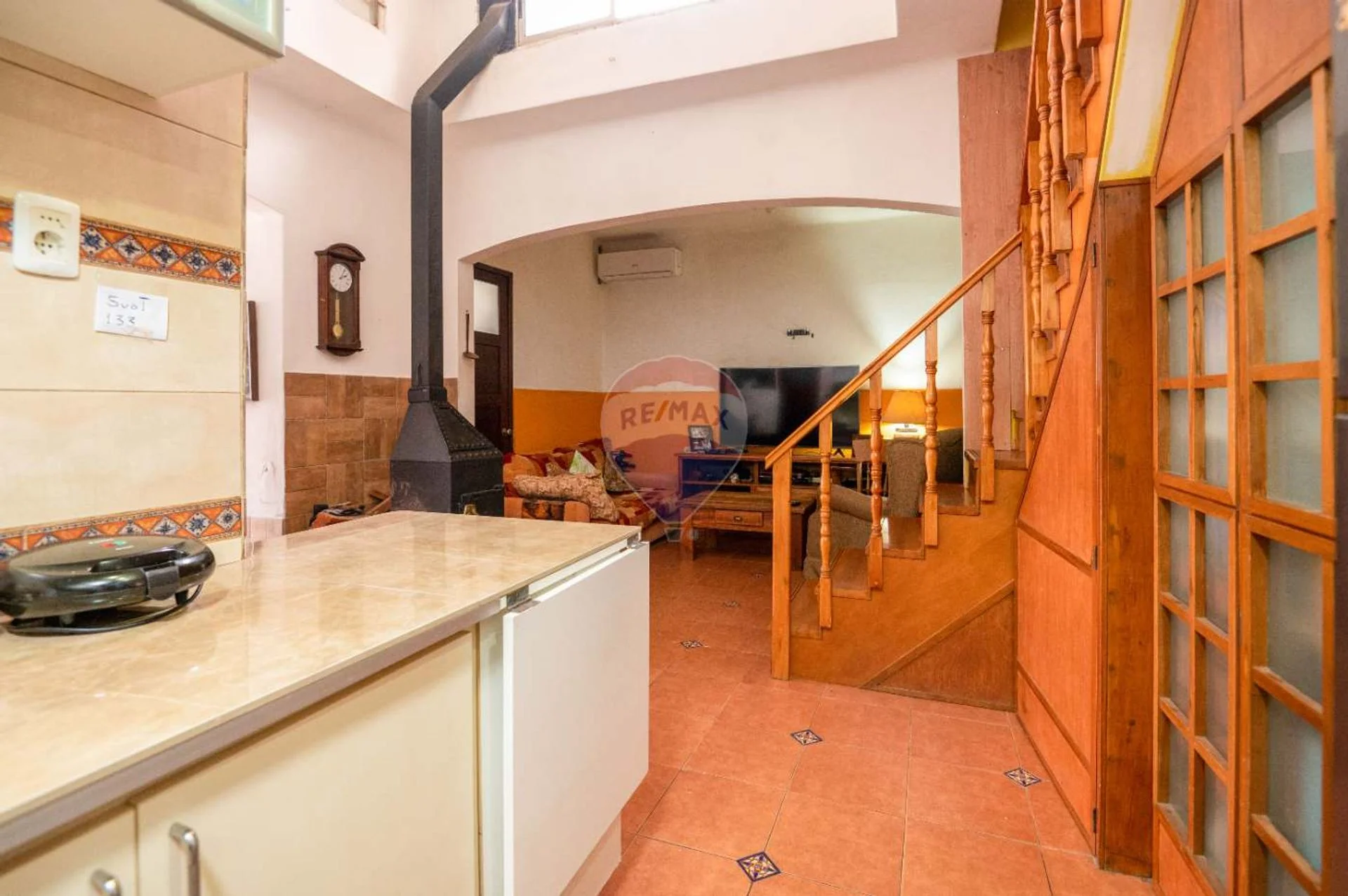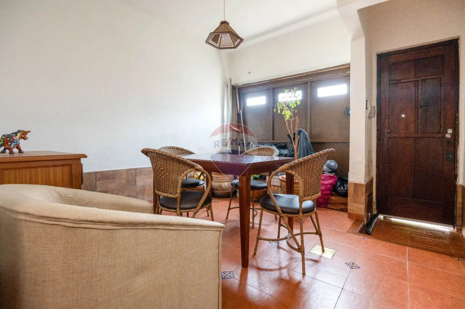 En planta baja encontramos un área de living comedor con estufa a leña, cocina semi-definida equipada con anafe, horno empotrado, campana y muebles aéreos y bajo mesada; un baño completo y uno de los dormitorios orientado al frente. La casa cuenta con garage (hoy es un ambiente integrado a la casa y utilizado como comedor) pero conserva el portón de hierro y madera, sistema basculante con automatismo para apertura y cierre.