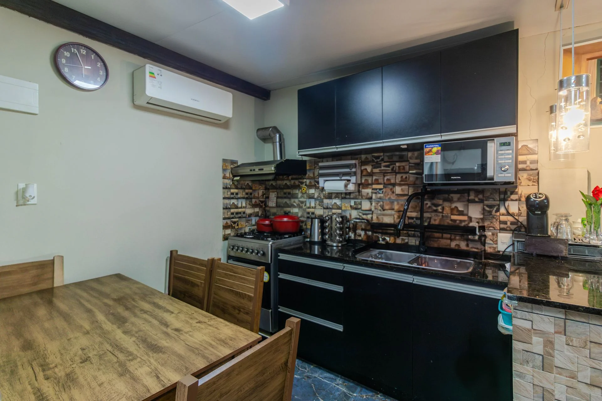 Cocina integrada con mesada de granito, muebles aéreos y bajo mesada. Barra desayunador