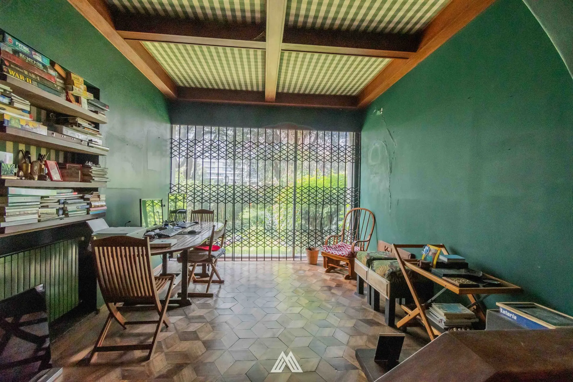 Escritorio al frente, cuenta con ventanal de aluminio y vidrio, con rejas, pisos de madera de nogal con diseño.