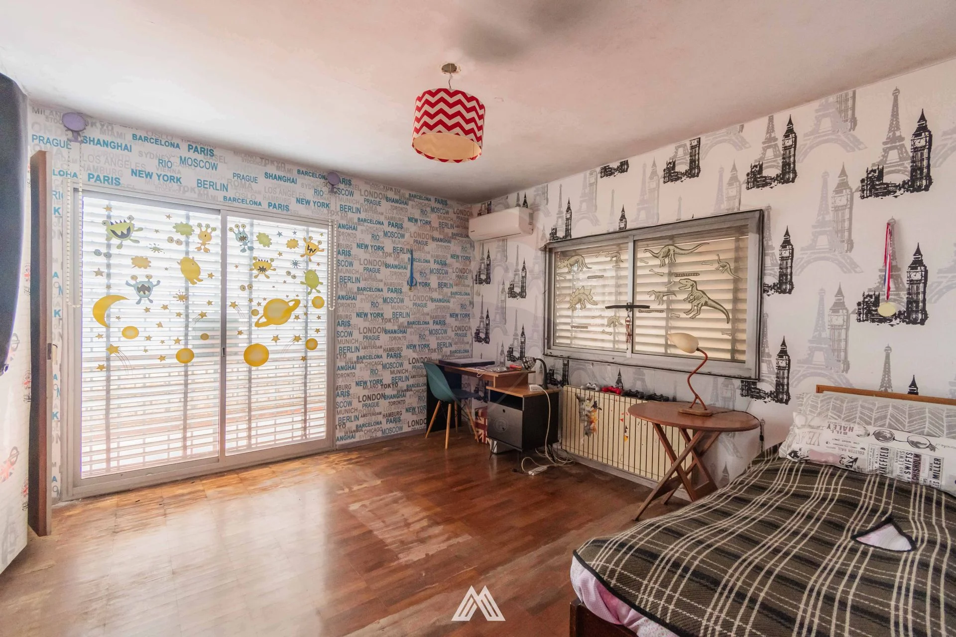 Amplio dormitorio con puerta ventana de salida a terraza,y otra ventana lateral de aluminio y vidrio con persianas de aluminio y rejas. Piso parquet y placares en toda la pared.