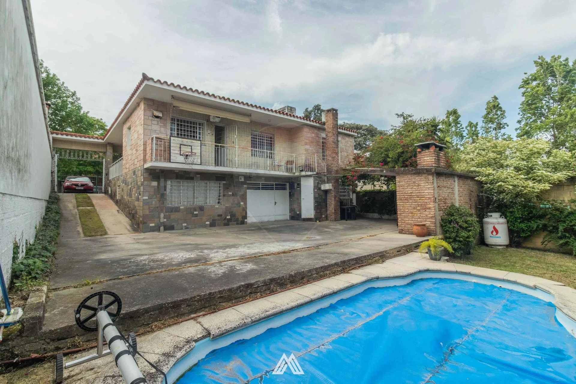 Jardín frontal que nos dirige hacia el ingreso principal, por el lateral dispone de acceso a cochera de hasta 4 vehículos, piscina climatizada fondo verde y pavimentado.