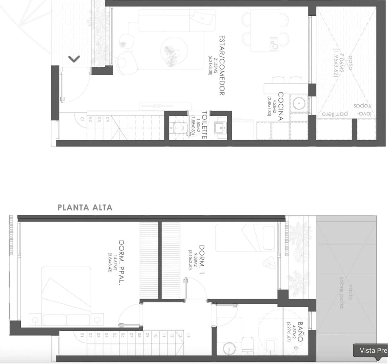 Planta Alta: 2 luminosos dormitorios con placares y 1 baño completo.