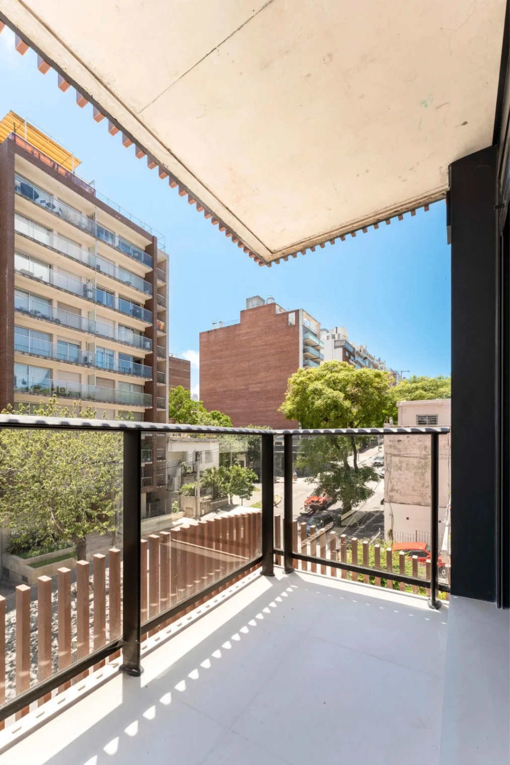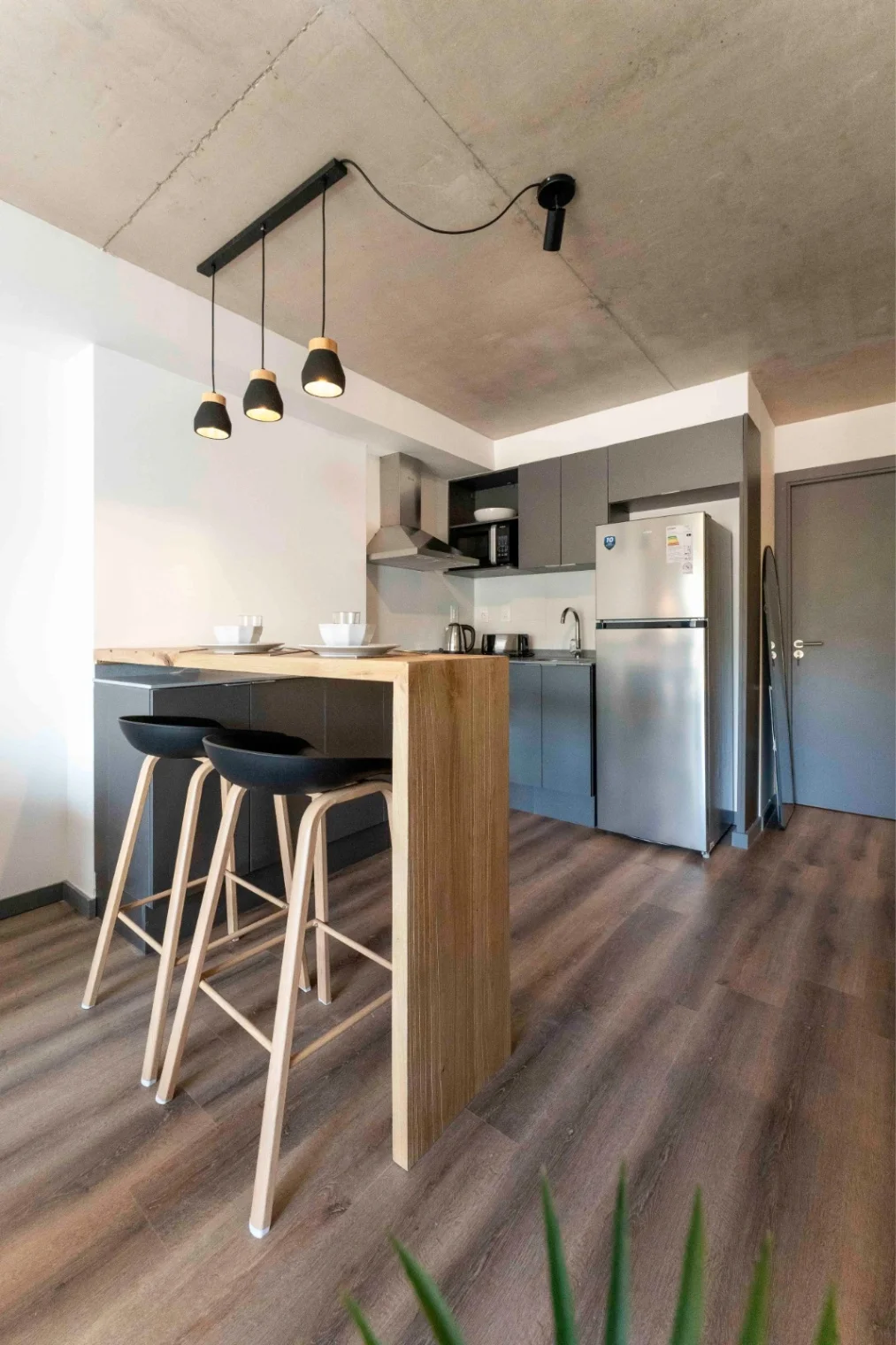 El apartamento incluye un cómodo living comedor con salida a la terraza, una cocina americana equipada con muebles aéreos y bajo mesada, y un dormitorio con placar.