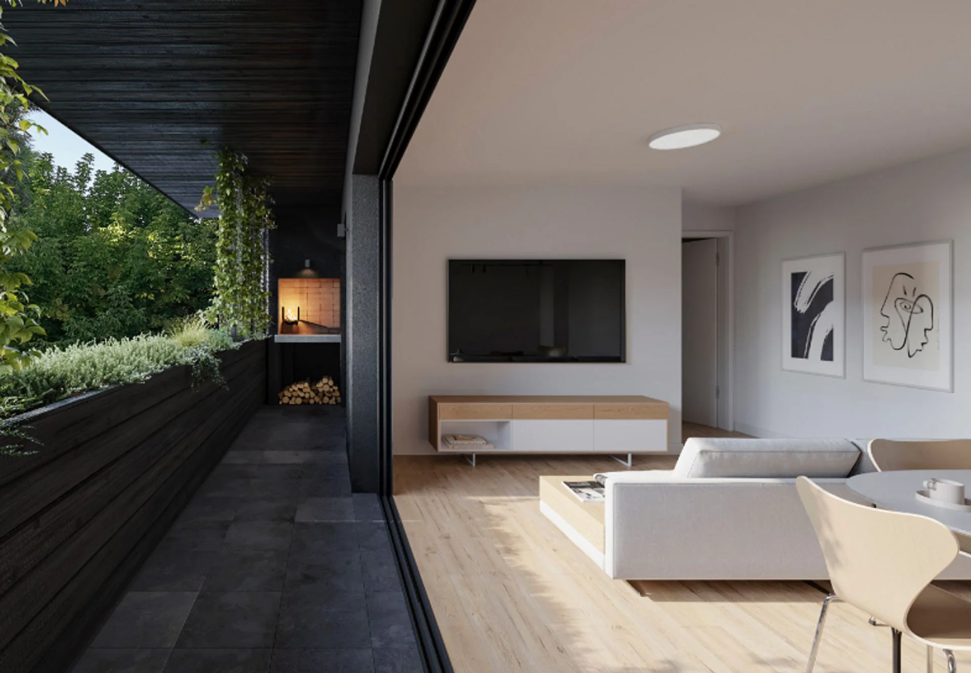 • Ventanales que conectan el living-comedor con una terraza privada con parrillero