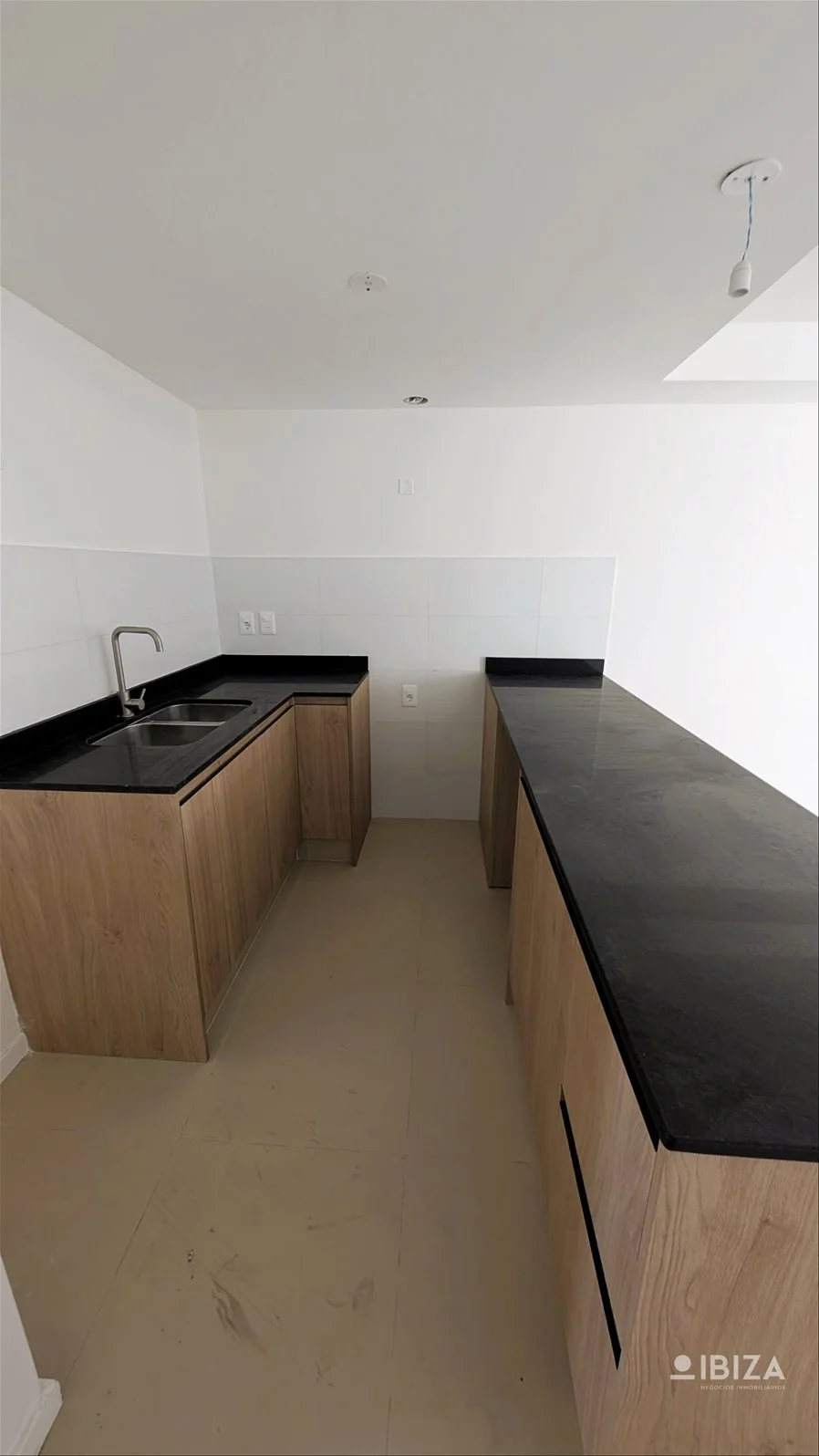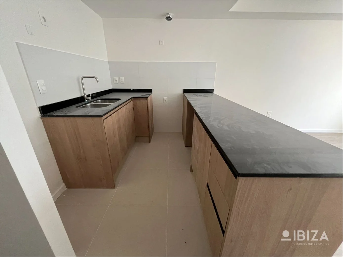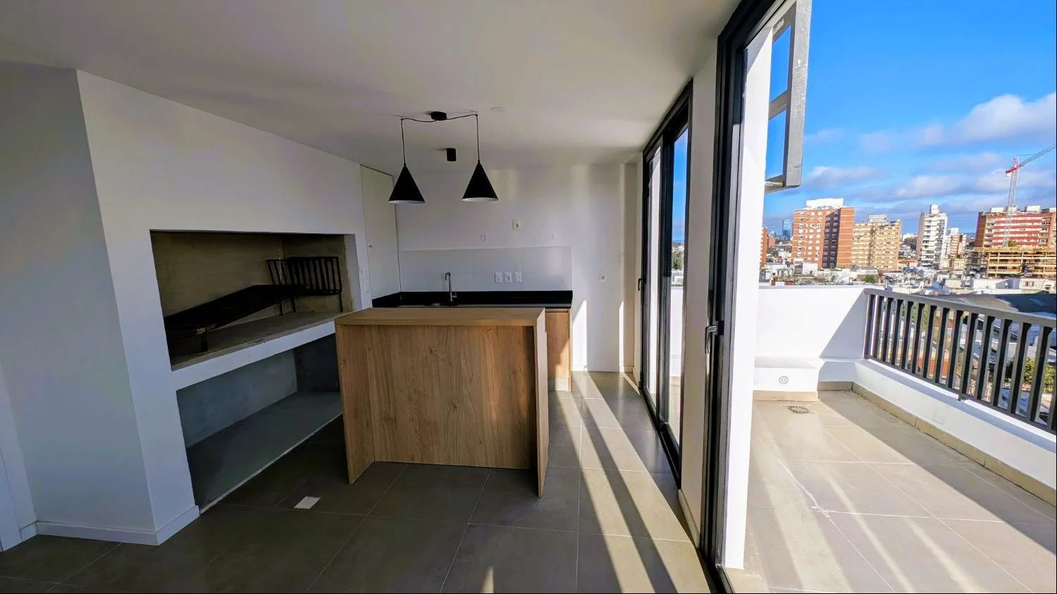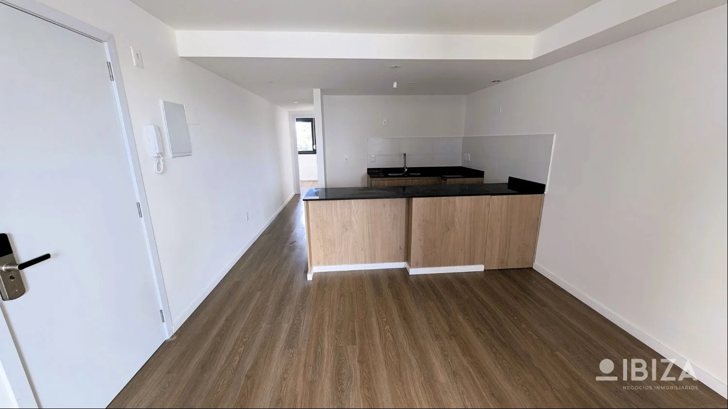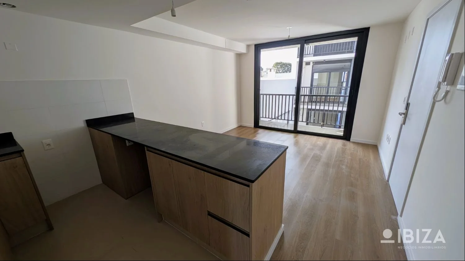 Estar-comedor con cocina integrada y salida a la terraza. Mesada de granito con placares bajo mesadas con opción a placares aéreos.