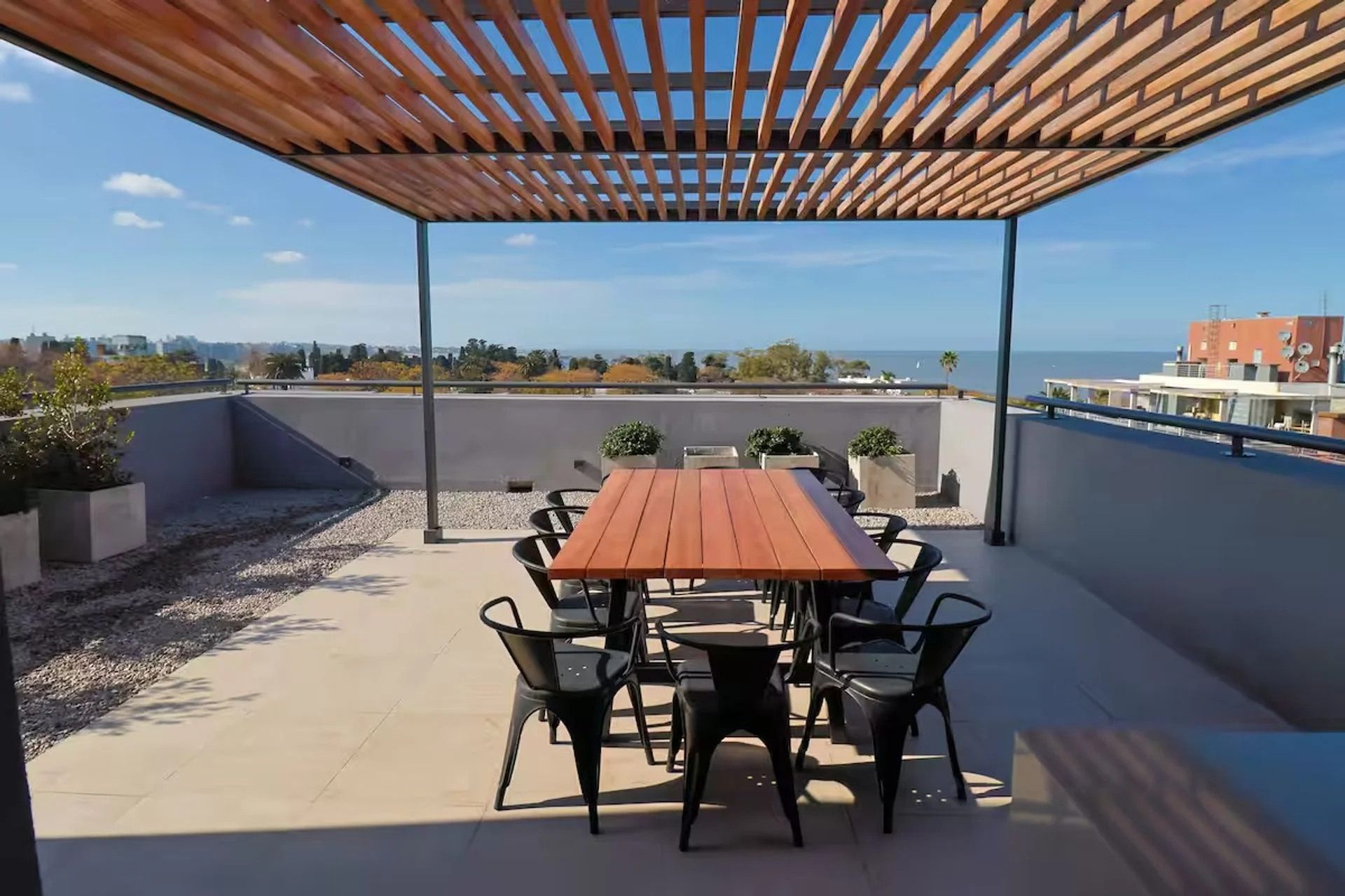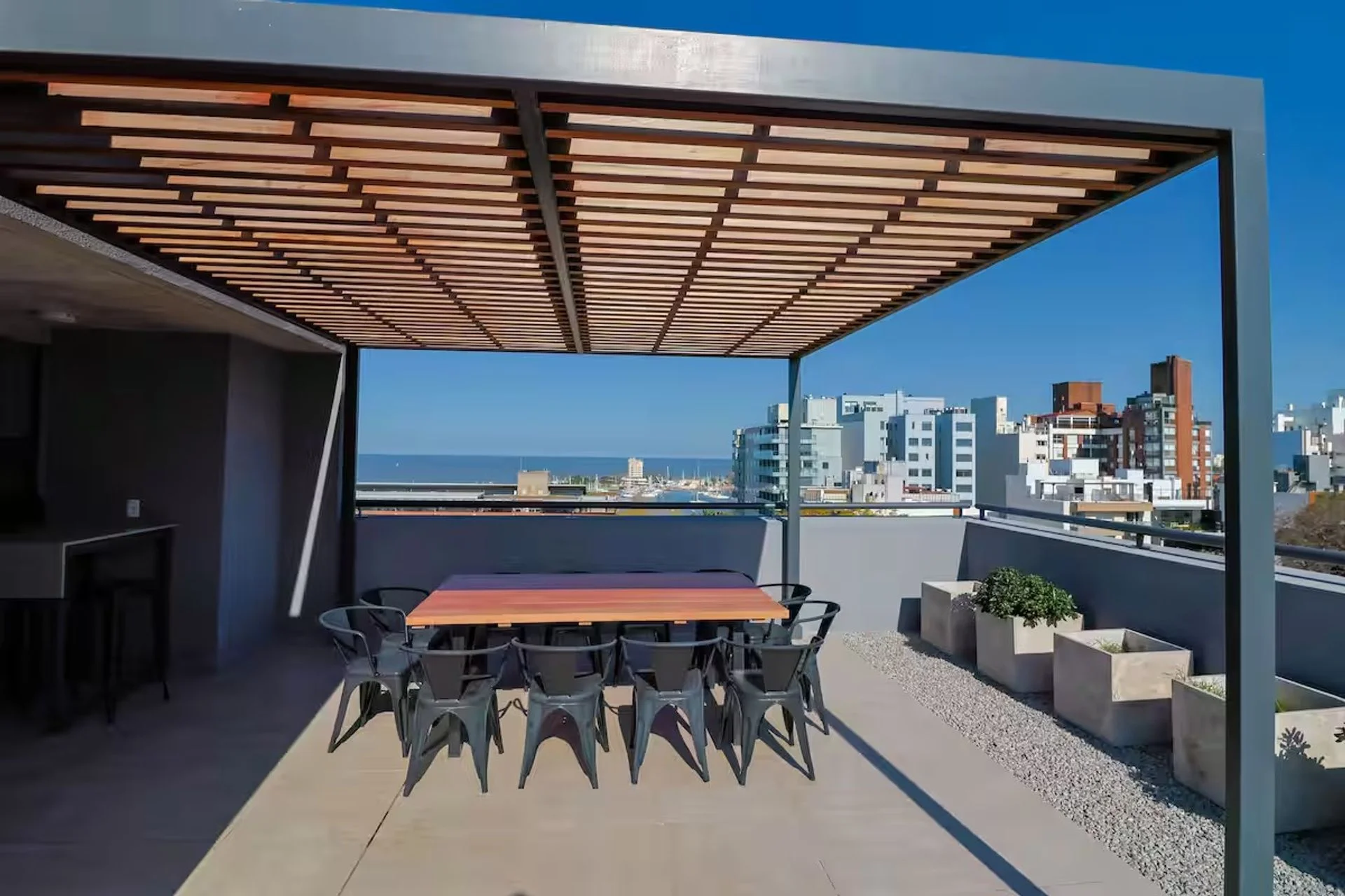 Rooftop con dos barbacoas y lounge totalmente equipados, con baño social y vistas panorámicas al Puerto y al Río de la Plata.
