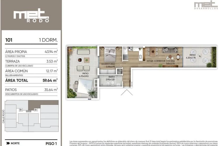 Apartamento de un dormitorio y un baño, cuenta con 44m2 propios + 39 m2 de patio y terraza. Orientación norte contra frente.-