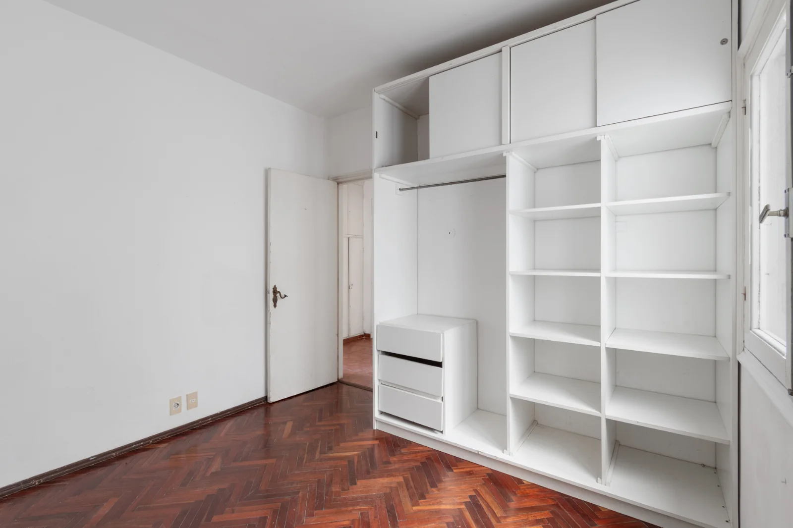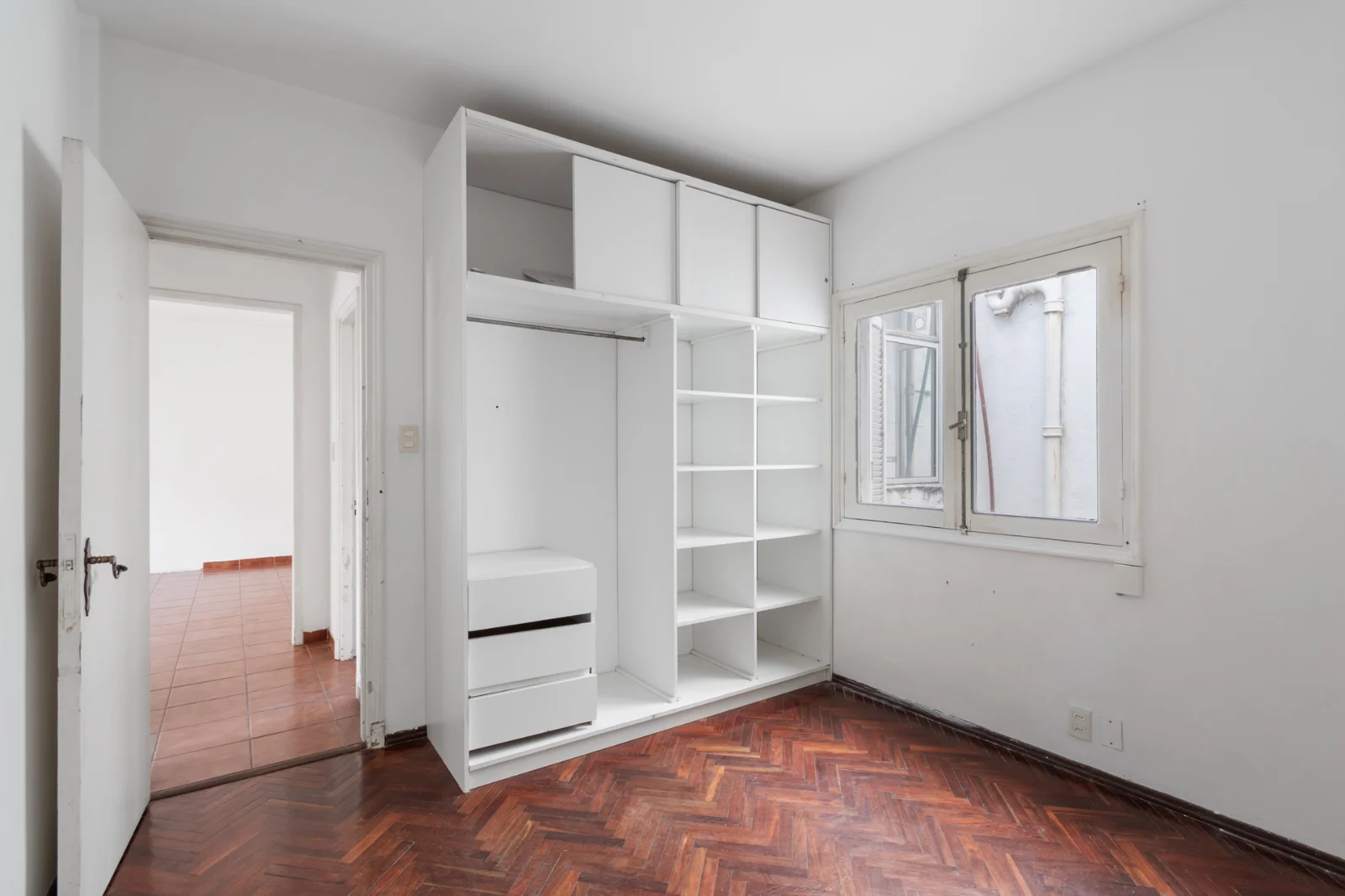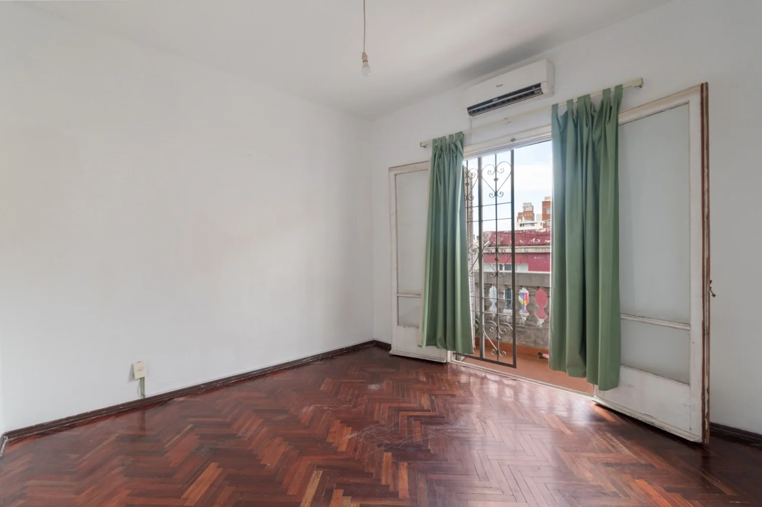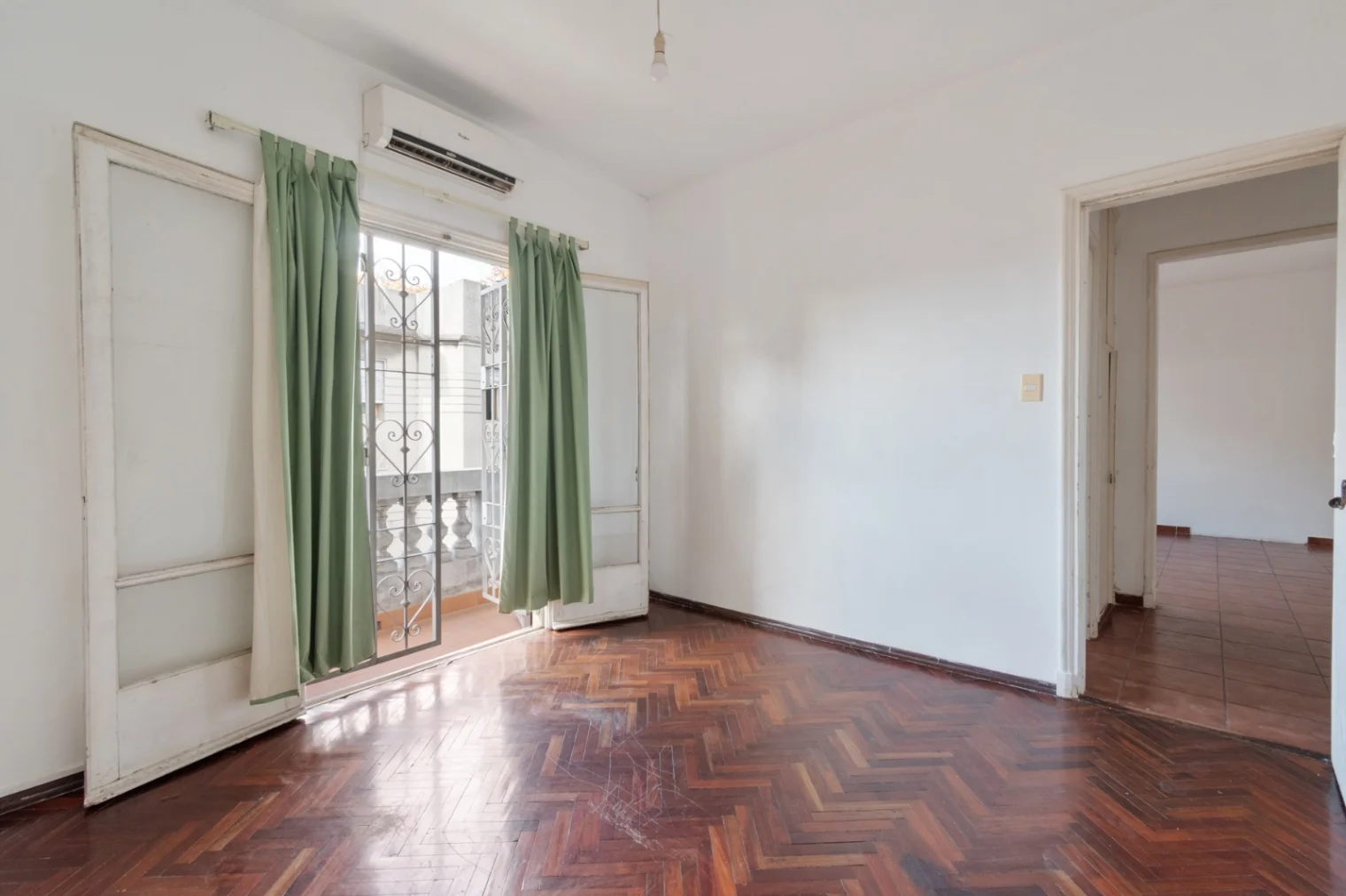 Dormitorio principal al frente, con acceso a pequeño balcón y aire acondicionado. Piso de parquet en espiga en buen estado. Dormitorio secundario con ventana al pozo de aire, placar empotrado, piso de parquet en espiga y buena iluminación natural.