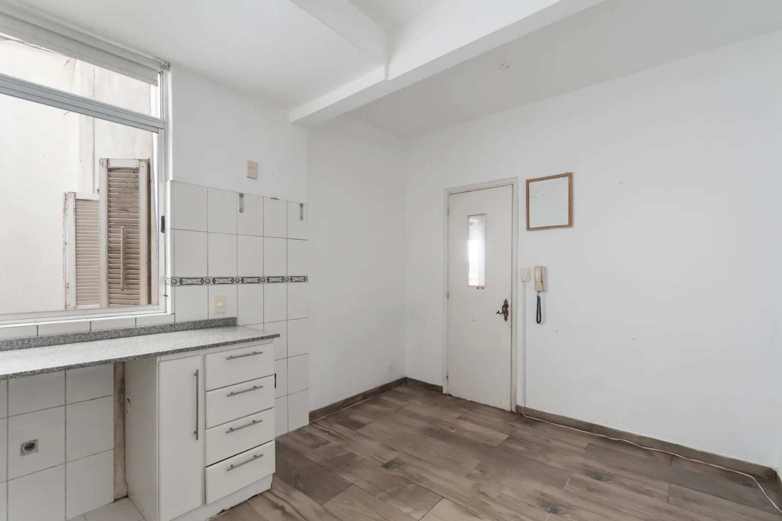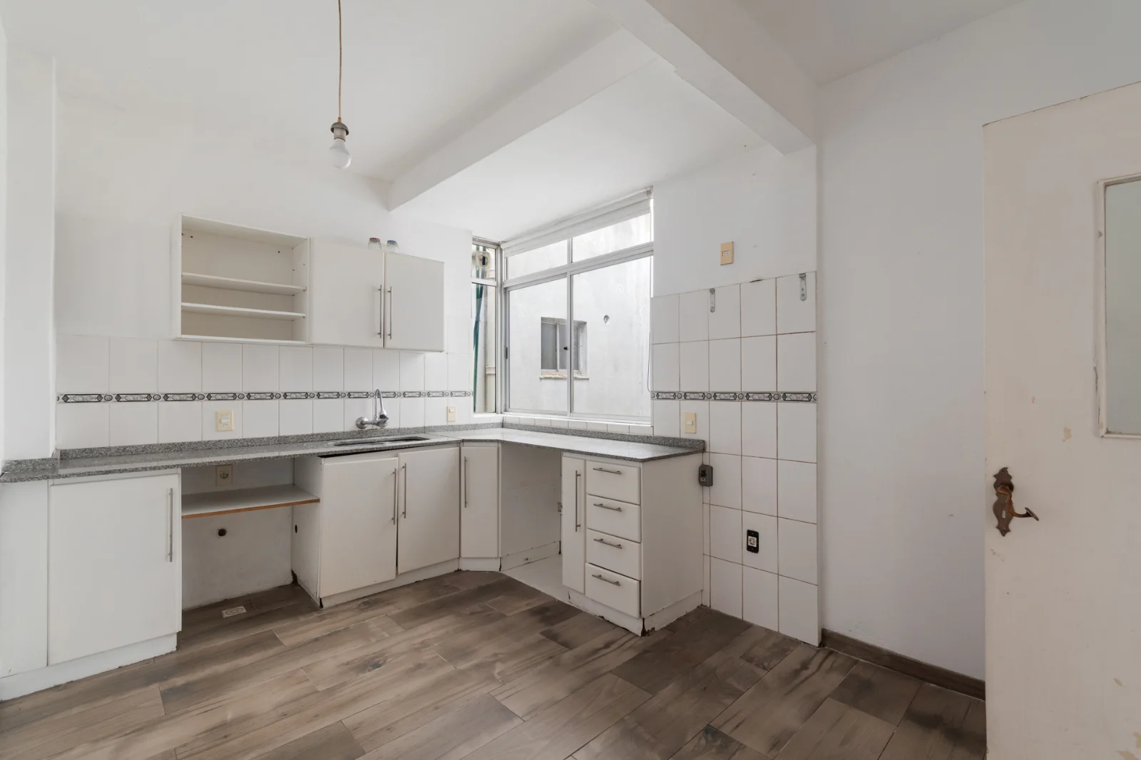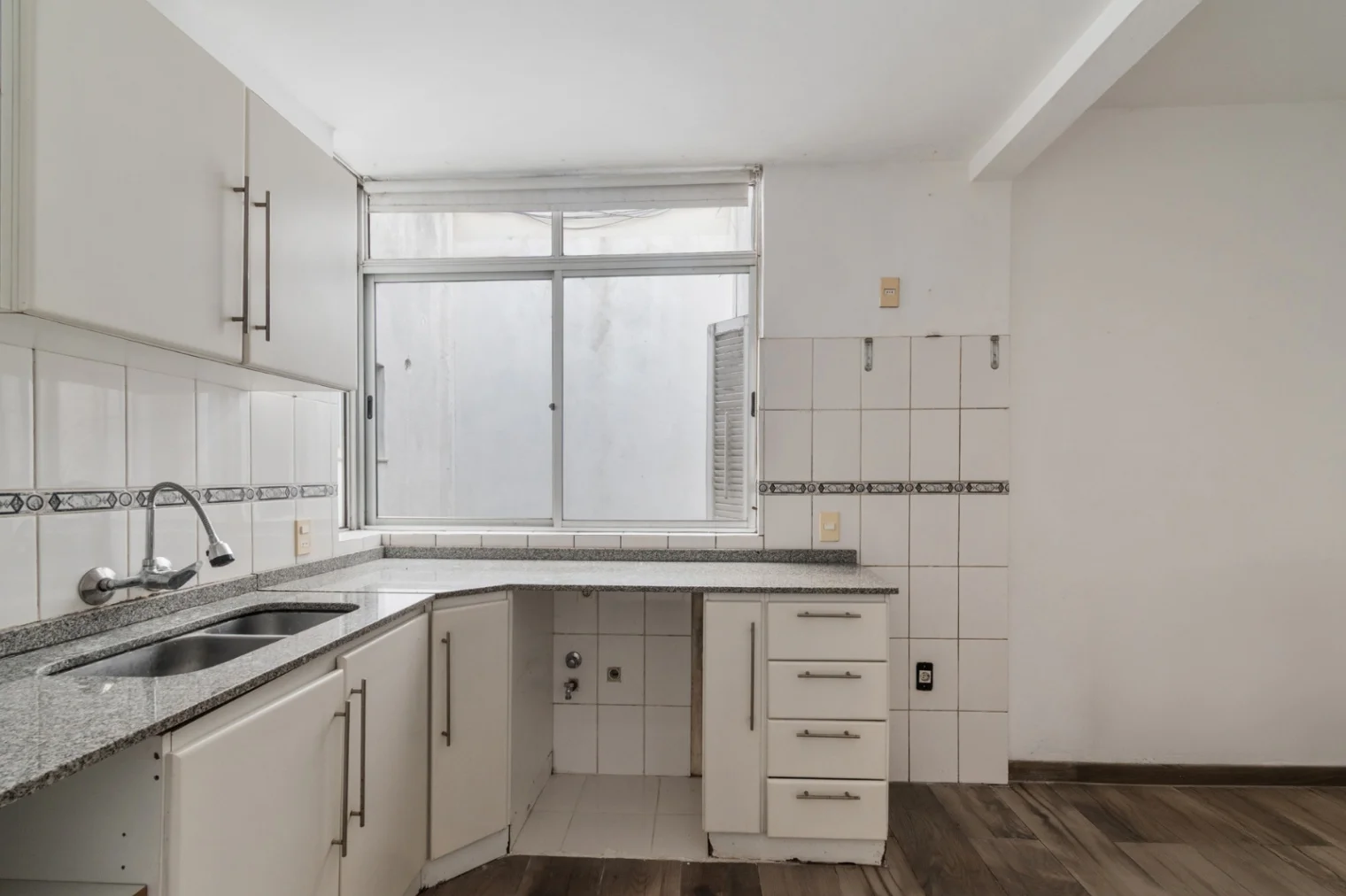 Cocina definida, luminosa, con ventana al pozo de aire. Placares bajo y sobremesada en MDF blanco. Mesada de granito gris. Revestimientos cerámicos con guarda decorativa. Conexiones visibles para lavarropas bajo mesada.